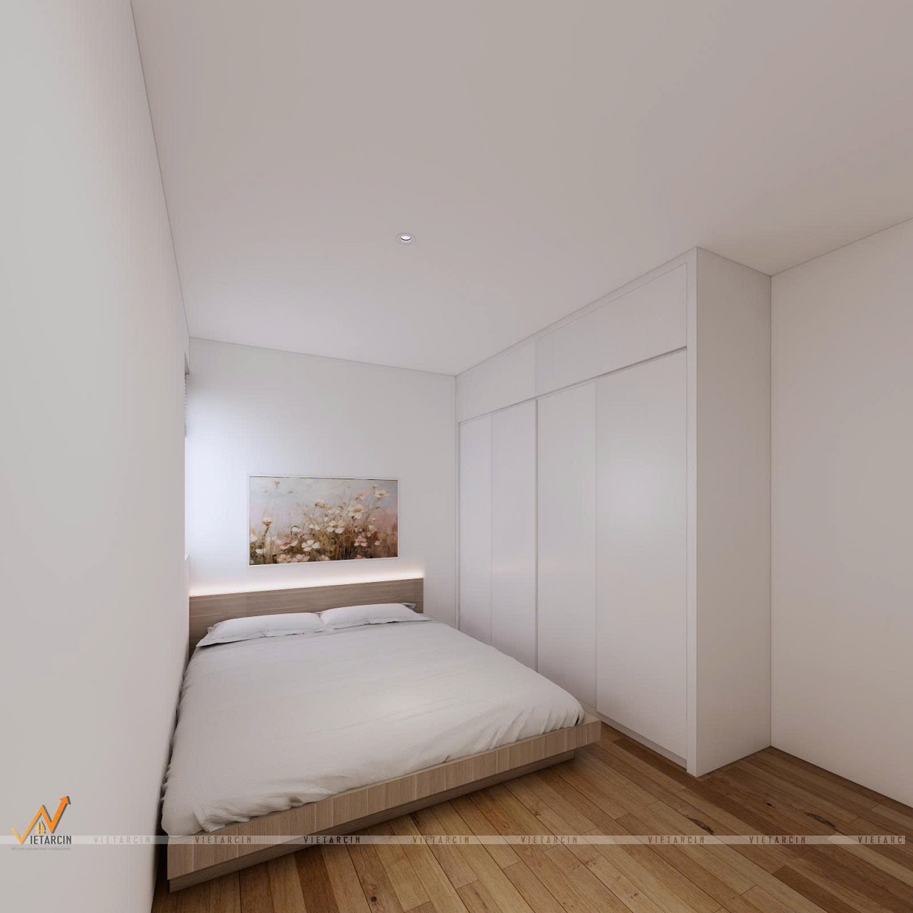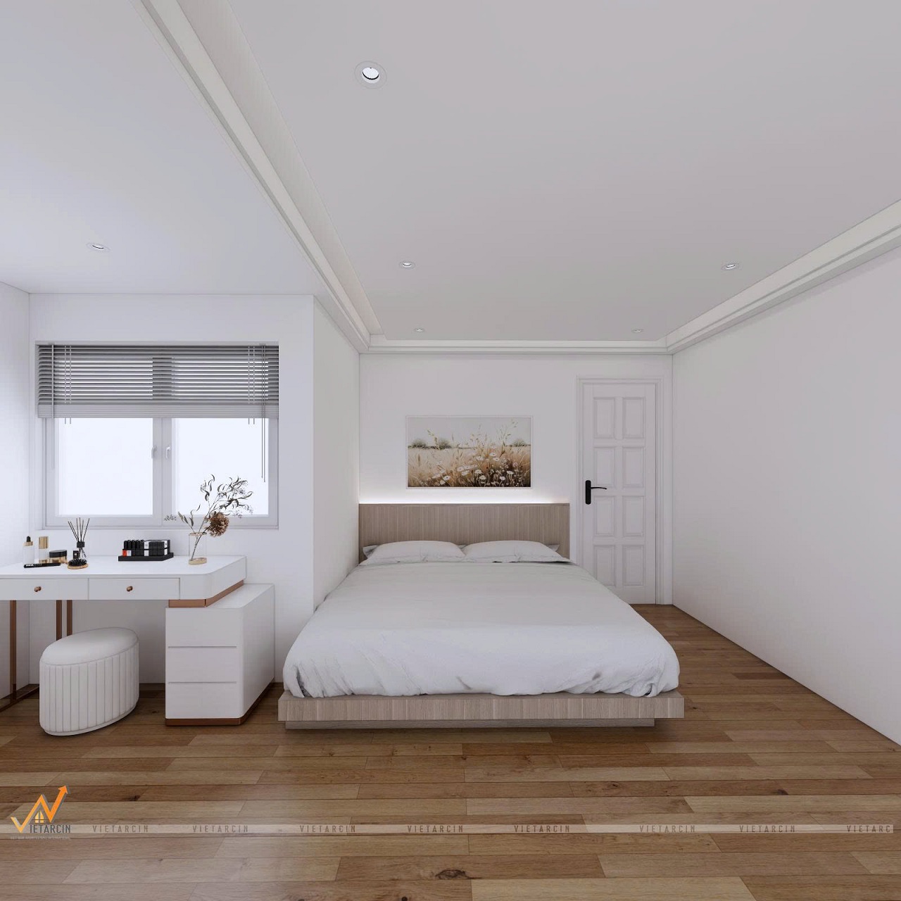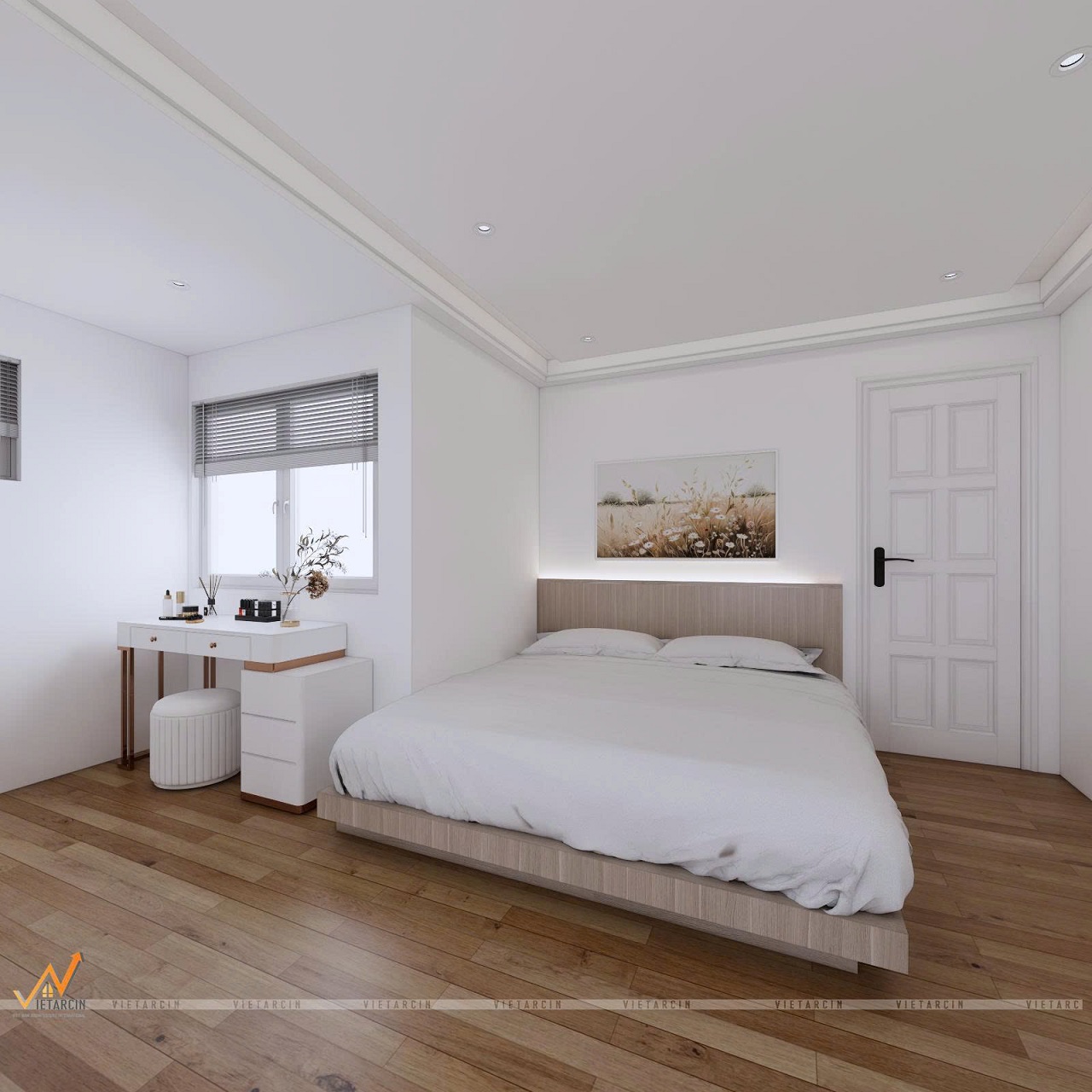 • Thiết kế nội thất đơn giản, tinh tế: Nội thất được lựa chọn với tông màu trung tính, thiết kế tối giản, loại bỏ những chi tiết rườm rà. Điều này không chỉ giúp tiết kiệm chi phí mà còn tạo nên một không gian sống thanh lịch, nhẹ nhàng, phù hợp với sở thích của mẹ chị Linh. Phòng ngủ được bố trí giường, tủ và bàn làm việc/trang điểm cơ bản, đáp ứng đầy đủ công năng mà không chiếm quá nhiều diện tích.