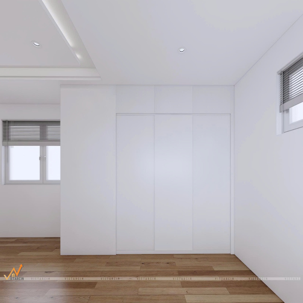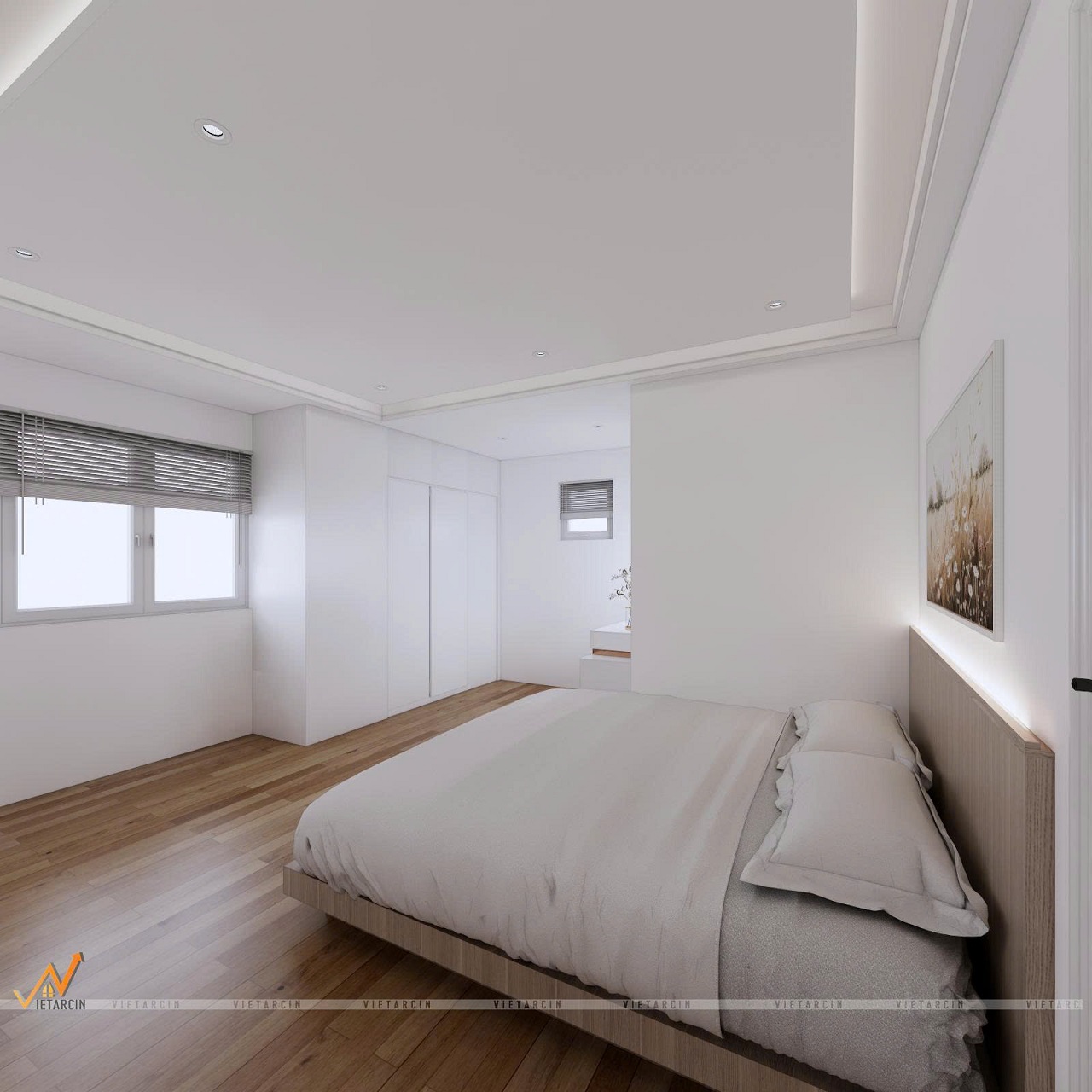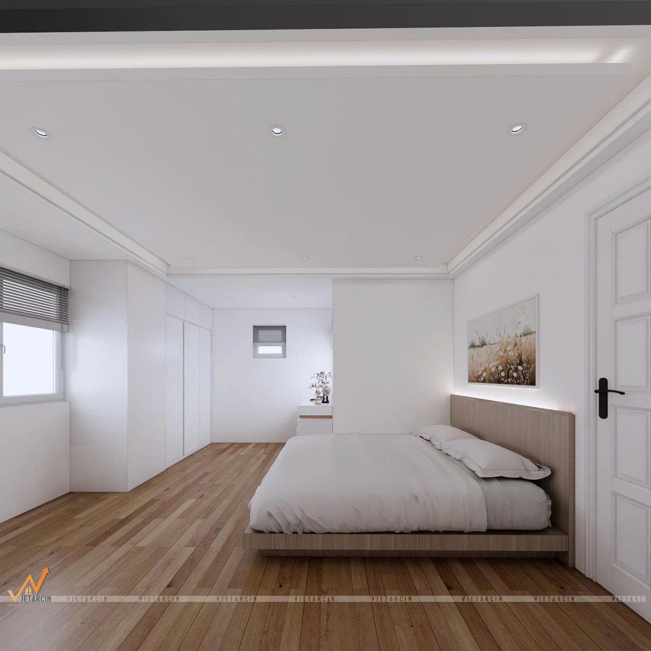 • Không gian nghỉ ngơi yên tĩnh: Phòng ngủ dành cho mẹ được thiết kế đơn giản, nhẹ nhàng với tông màu trắng chủ đạo. Sàn gỗ ấm cúng kết hợp với tường trắng và tủ quần áo kịch trần giúp căn phòng trông rộng và cao hơn.
