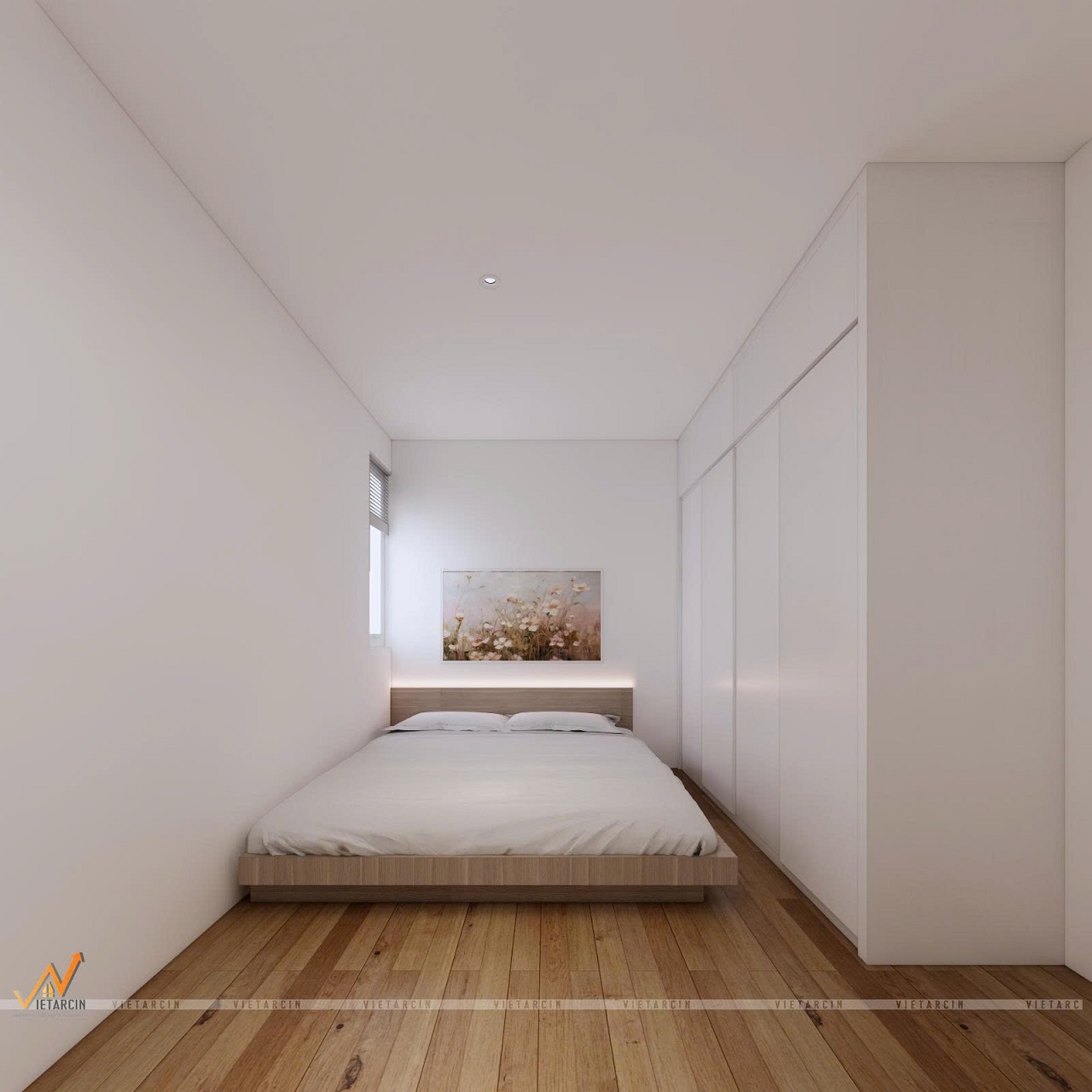• Nội thất tối giản và tiện lợi: Giường ngủ được thiết kế dạng bục thấp, giúp người lớn tuổi dễ dàng di chuyển. Tủ quần áo lớn chạy dọc tường cung cấp đủ không gian lưu trữ mà không làm bí bách căn phòng. Tranh trang trí và đèn ngủ âm đầu giường tạo cảm giác thư thái, dễ chịu.