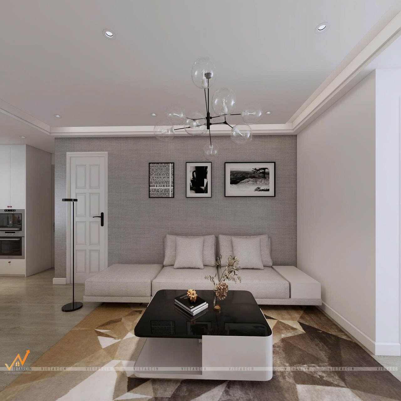 • Tối ưu không gian và tạo điểm nhấn: Thay vì sử dụng bộ sofa cồng kềnh, chúng tôi chọn một mẫu sofa góc hiện đại, màu be nhạt, giúp không gian trở nên thanh thoát và rộng rãi hơn. Điểm nhấn của căn phòng là mảng tường phía sau sofa được ốp giấy dán tường giả vải màu xám, tạo cảm giác sang trọng, tinh tế.