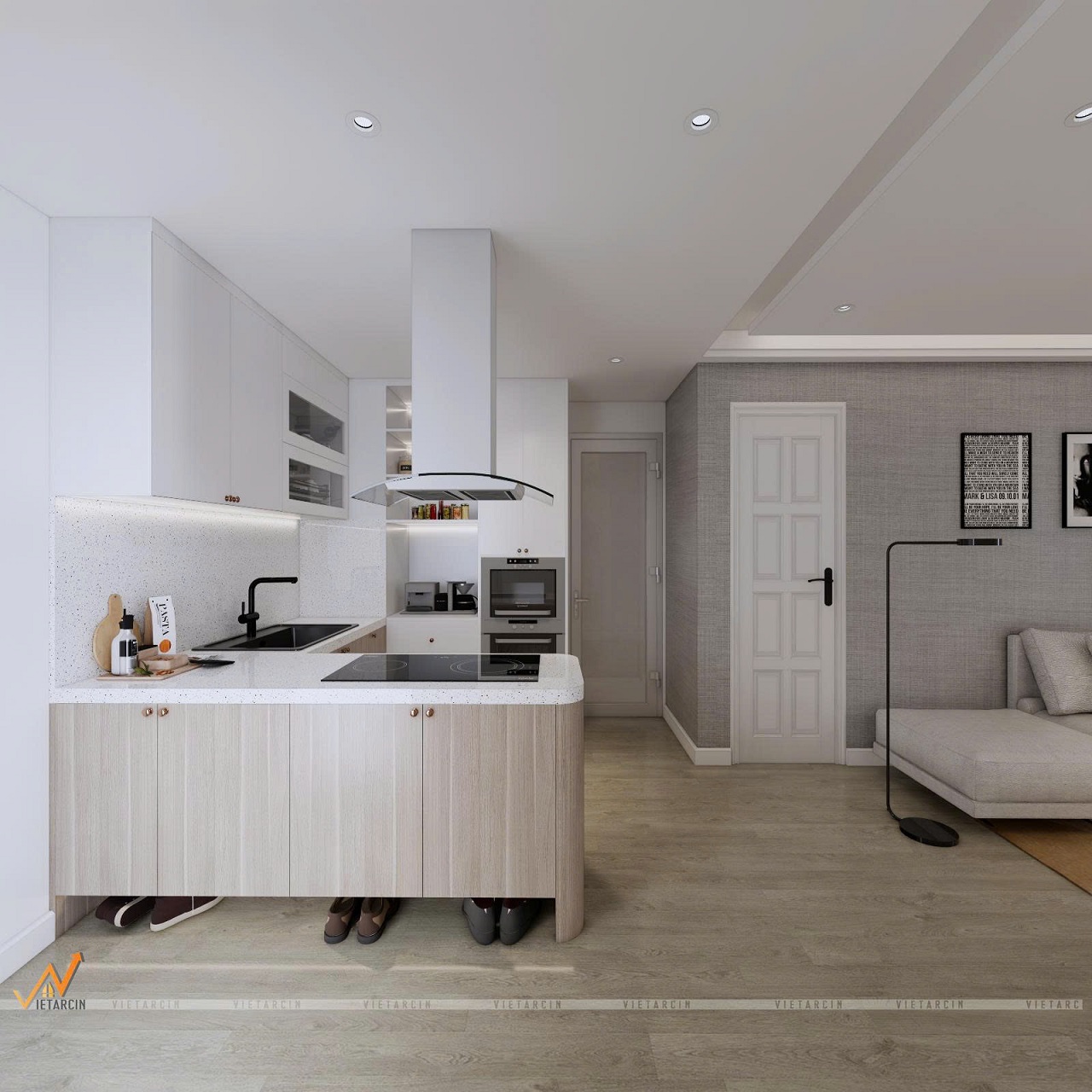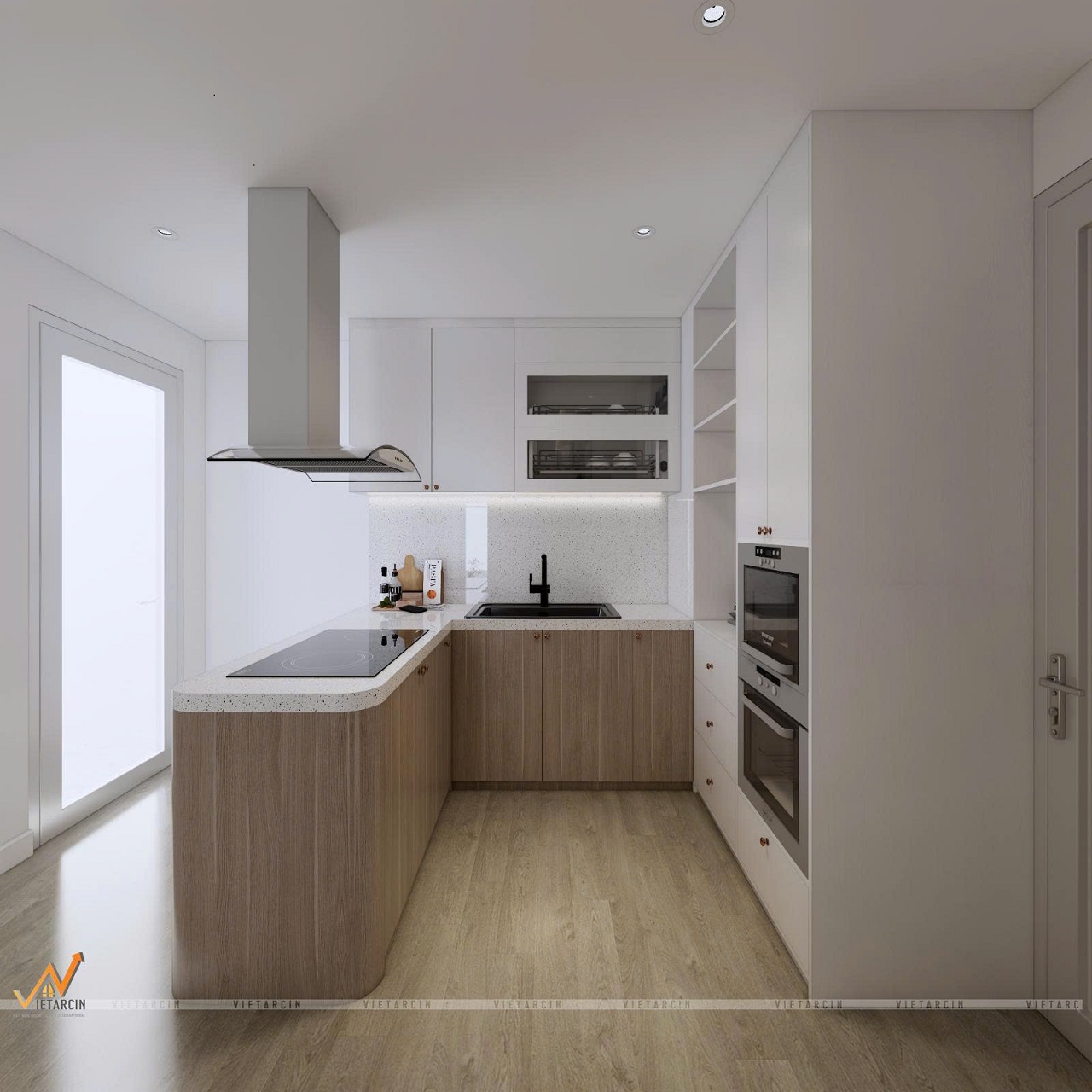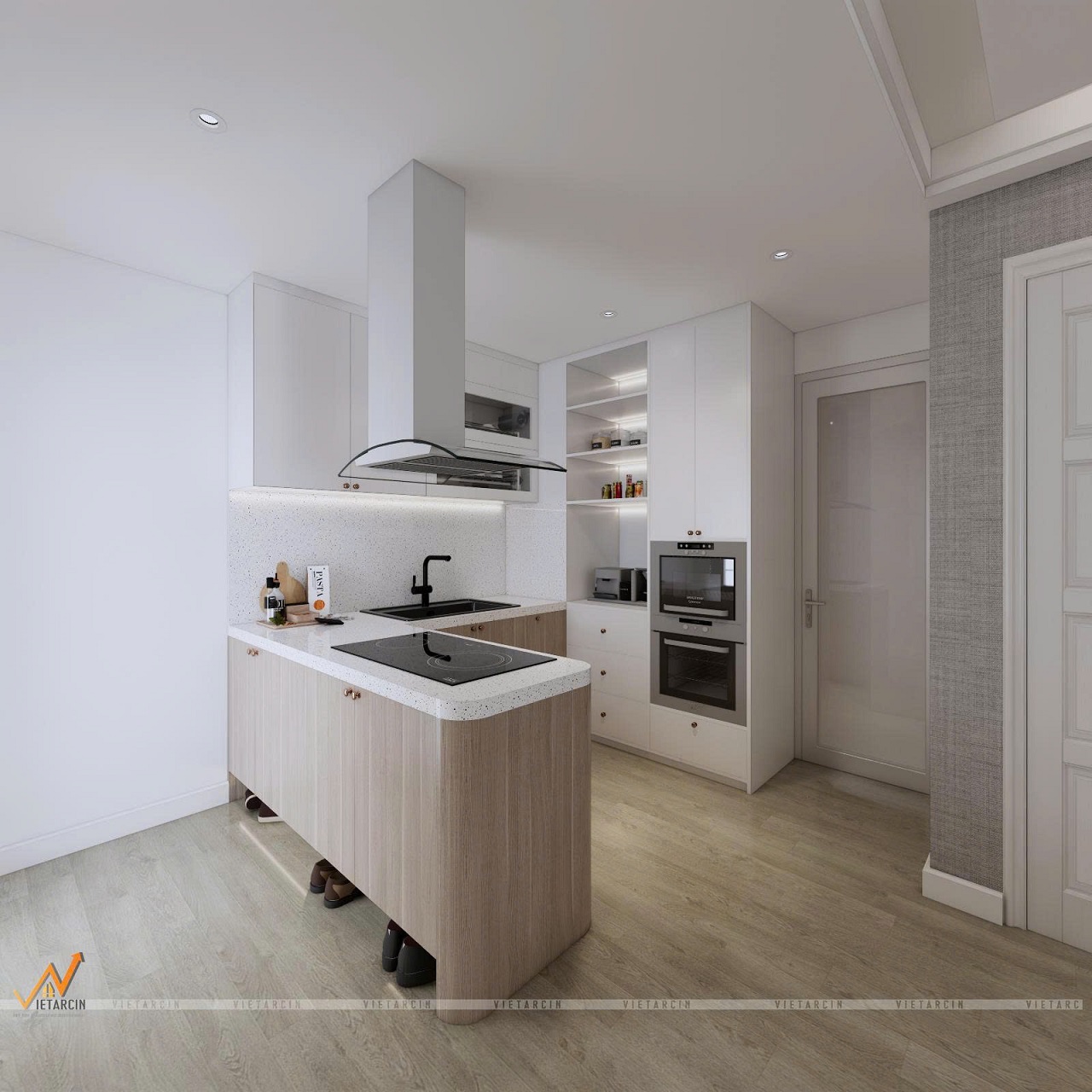 • Sắp xếp hợp lý: Chúng tôi đã bố trí các thiết bị bếp như bếp từ, máy hút mùi và lò nướng âm tủ một cách gọn gàng, mang lại sự tiện nghi và thẩm mỹ cao. Bàn đảo cong mềm mại không chỉ là nơi sơ chế mà còn là nơi đặt tủ giày và lưu trữ đồ, giải quyết triệt để bài toán công năng trong một diện tích hạn chế.