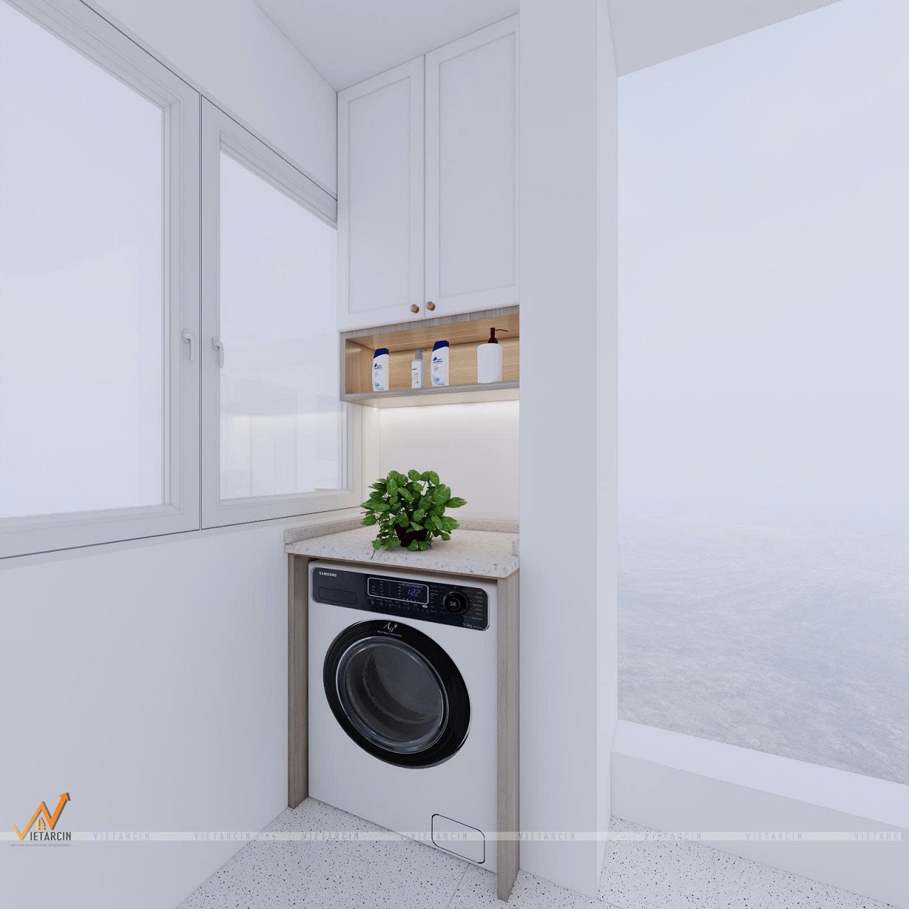 Thiết kế thông minh, đa năng: Khu vực giặt đồ được bố trí ở logia, tận dụng ánh sáng và gió tự nhiên. Máy giặt được đặt gọn gàng dưới kệ đá, phía trên là hệ tủ gỗ và kệ mở giúp lưu trữ hóa chất, vật dụng giặt giũ. Thiết kế này không chỉ tiện lợi mà còn giữ cho khu vực luôn sạch sẽ, gọn gàng.