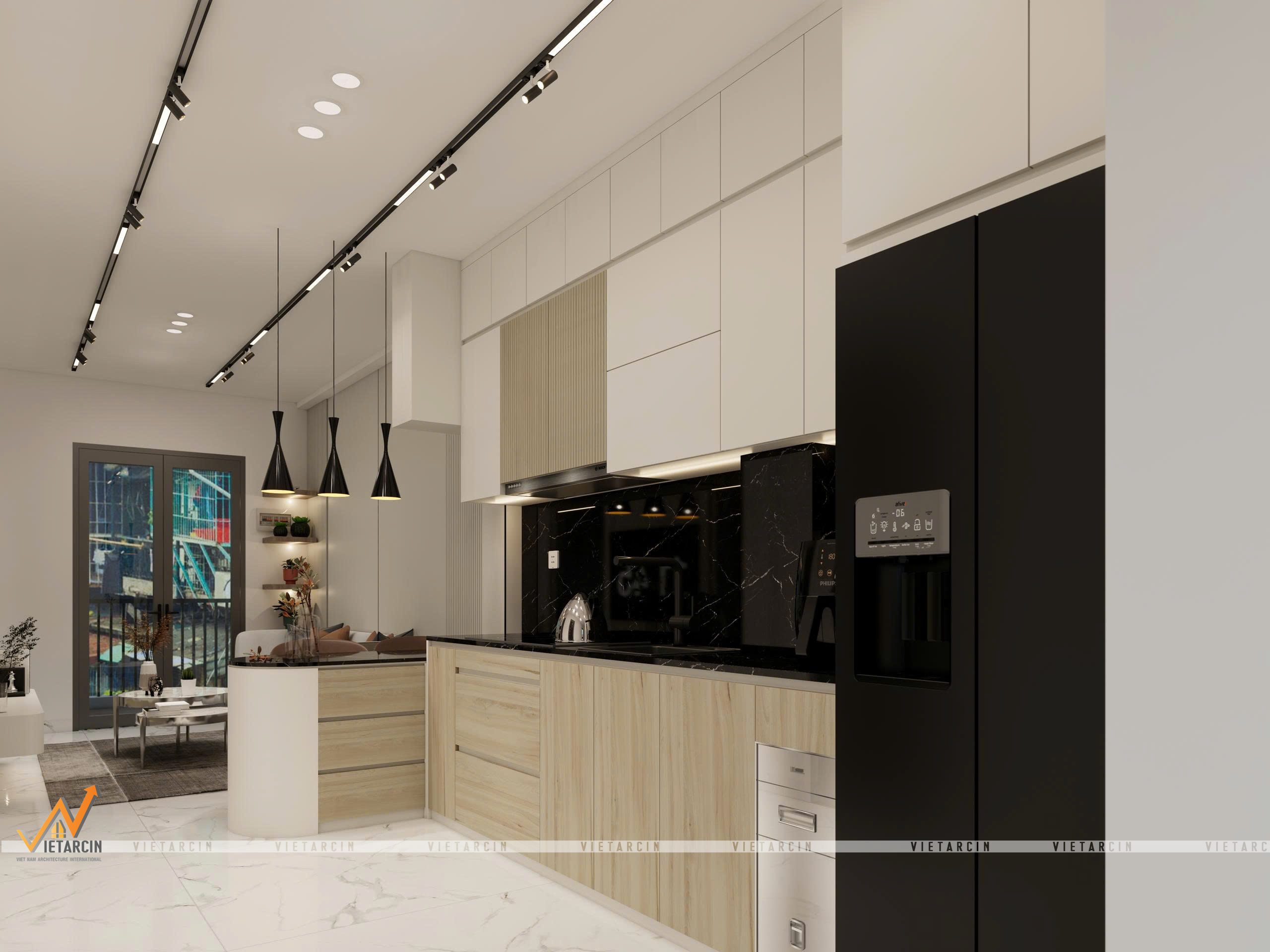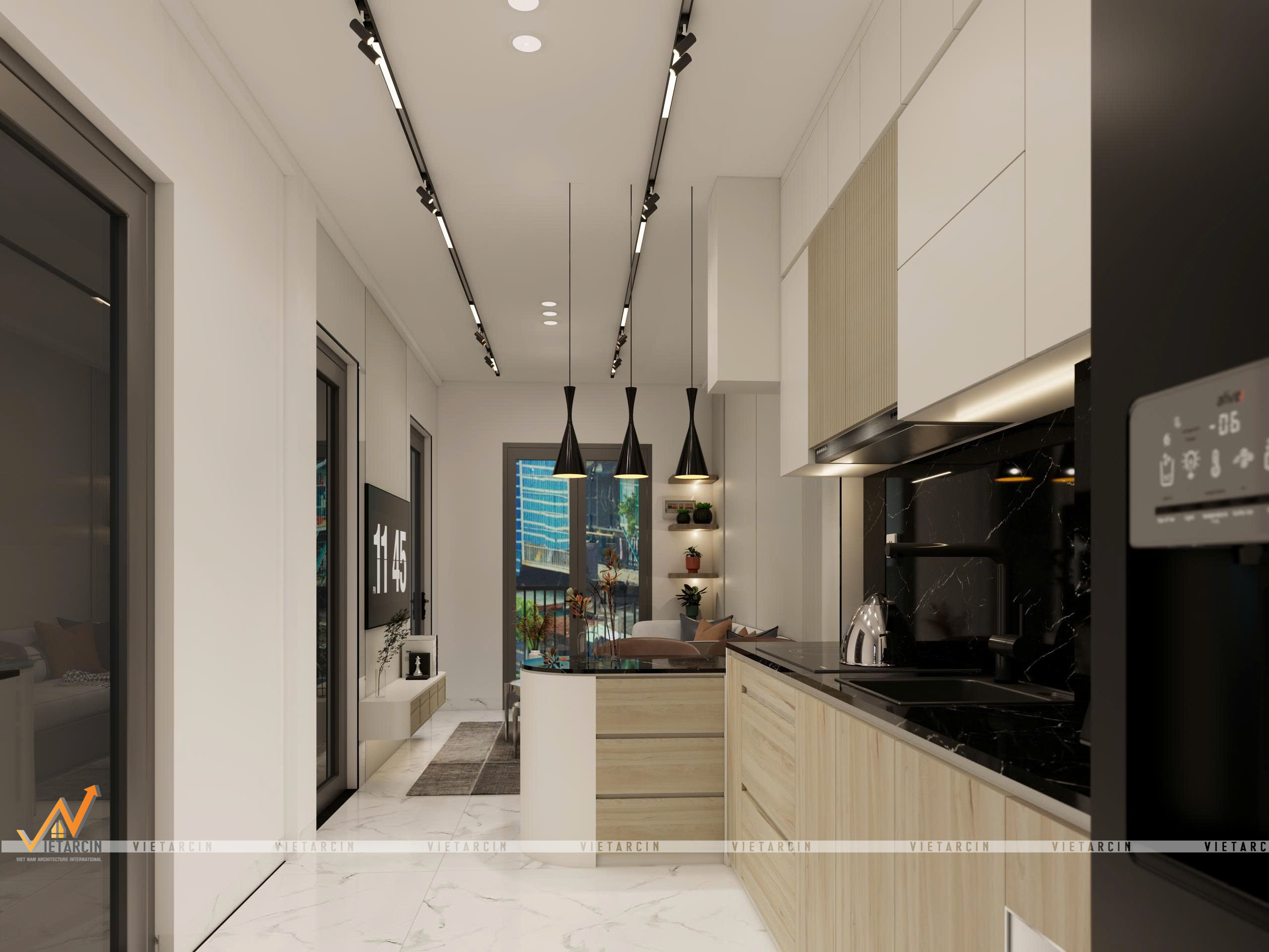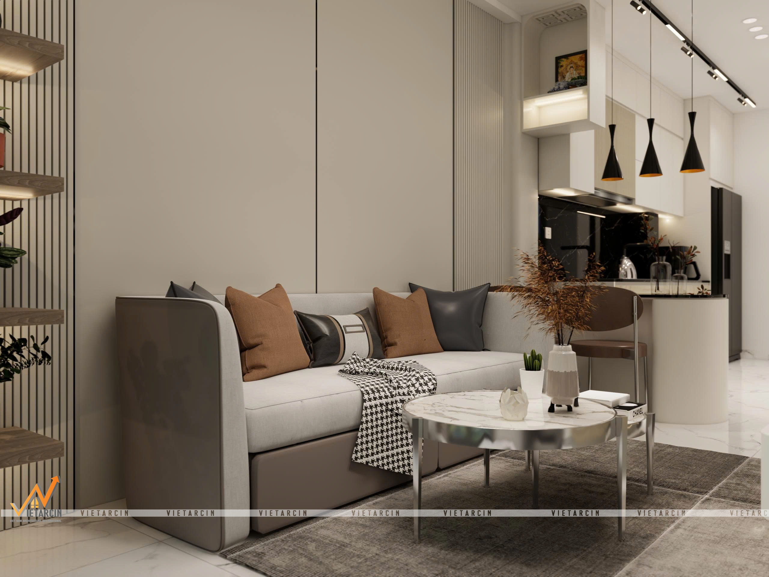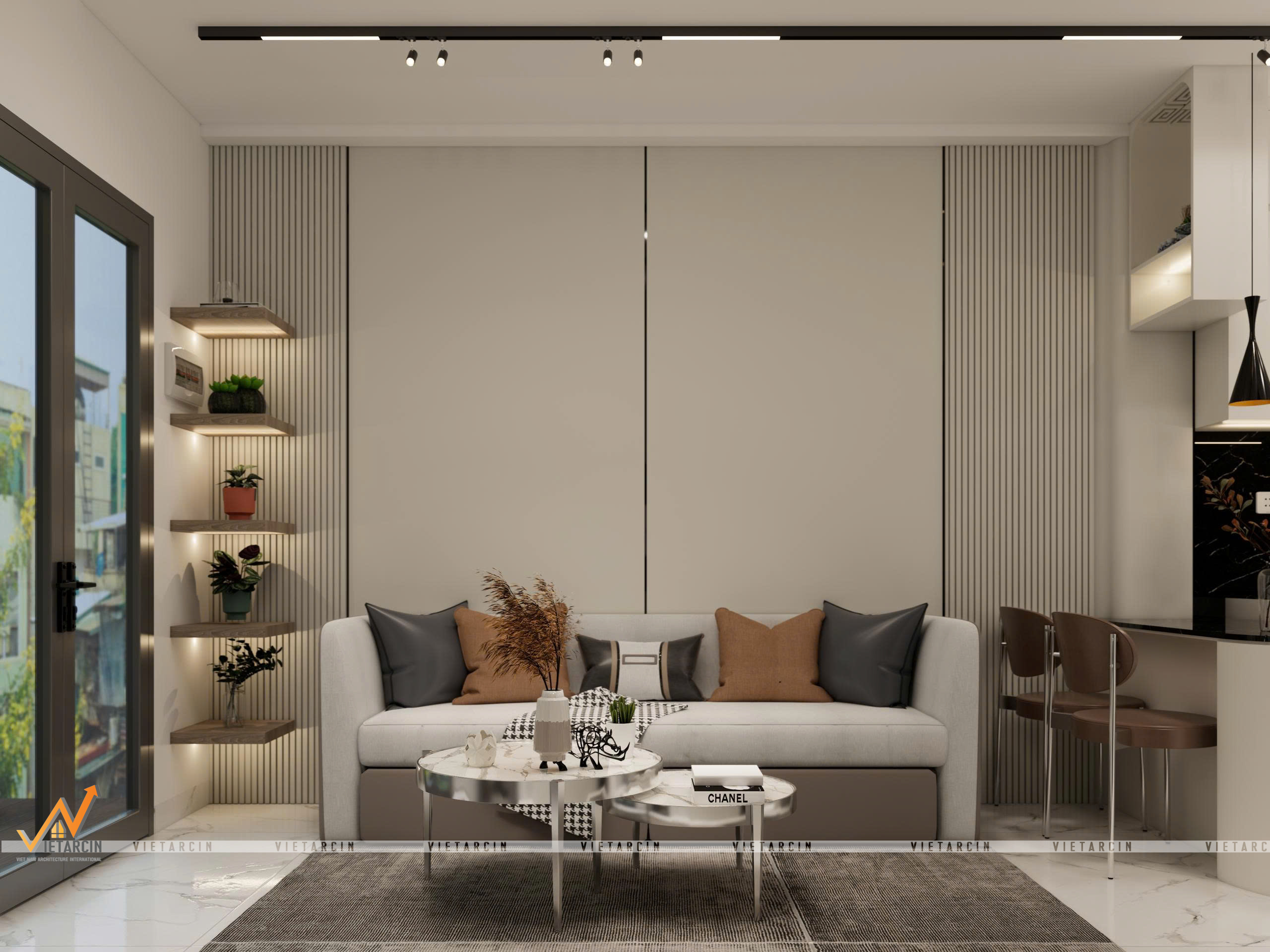 Tổng thể căn hộ được khoác lên mình gam màu trắng – be chủ đạo để “kéo rộng” không gian về mặt thị giác. Tuy nhiên, để tạo chiều sâu và tránh sự nhàm chán, chúng tôi sử dụng các điểm nhấn màu đen và xám ghi từ khung cửa kính, hệ đèn ray nam châm và các mảng tường ốp vách trang trí.