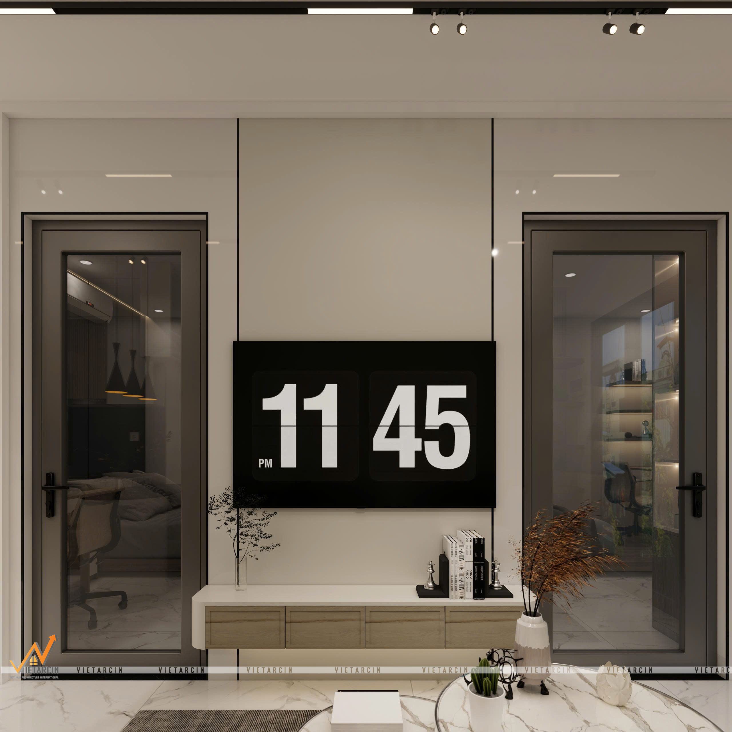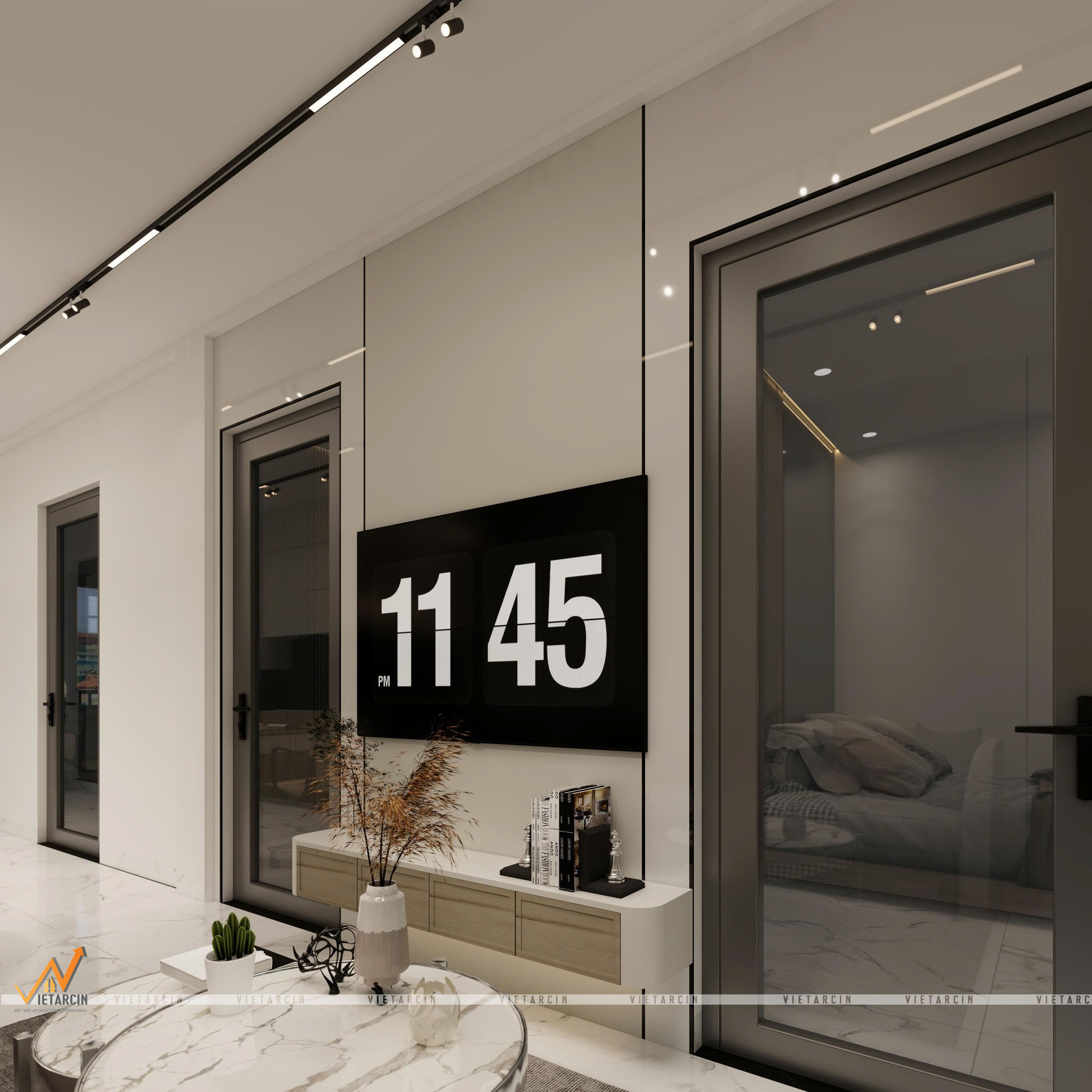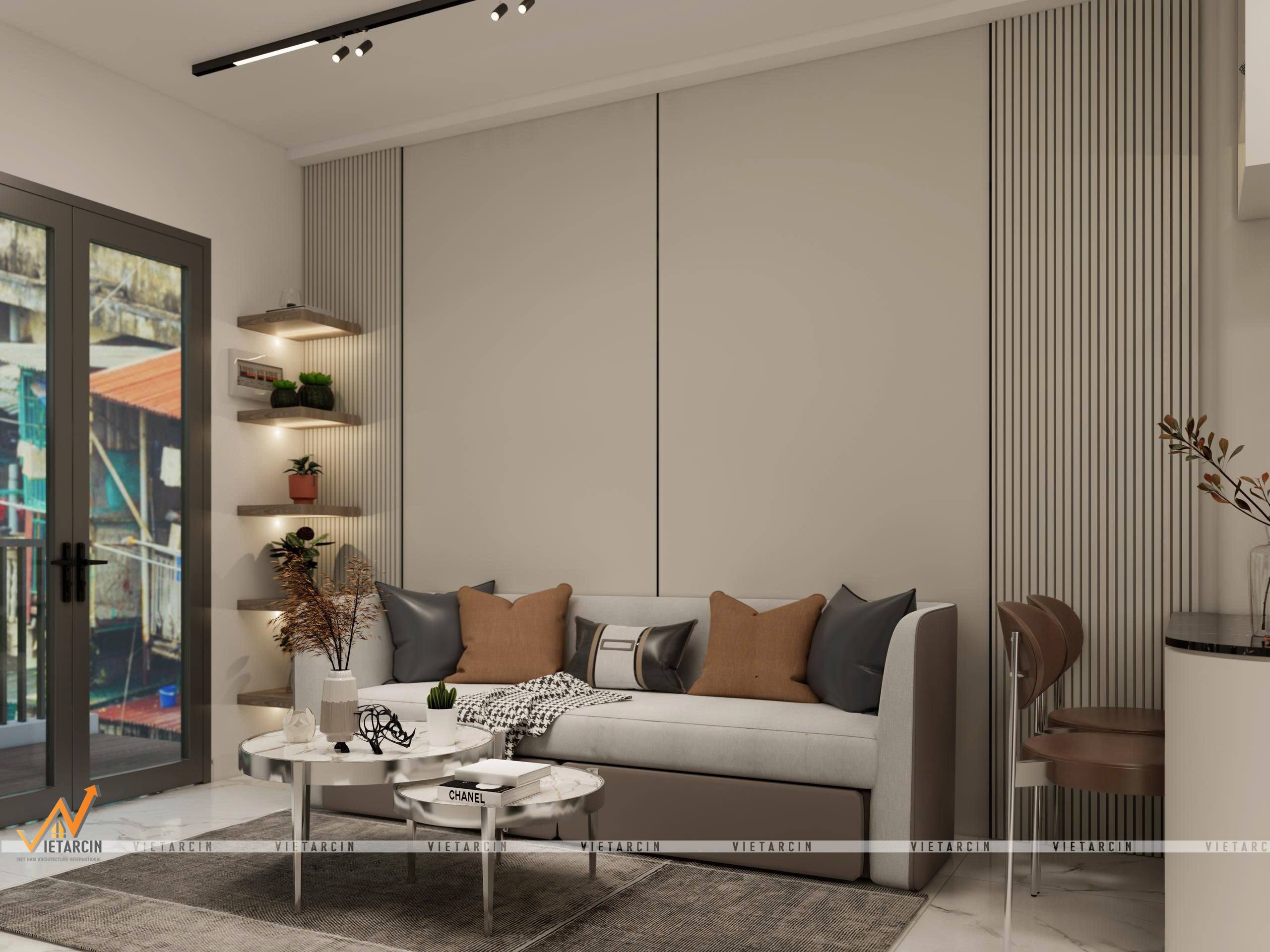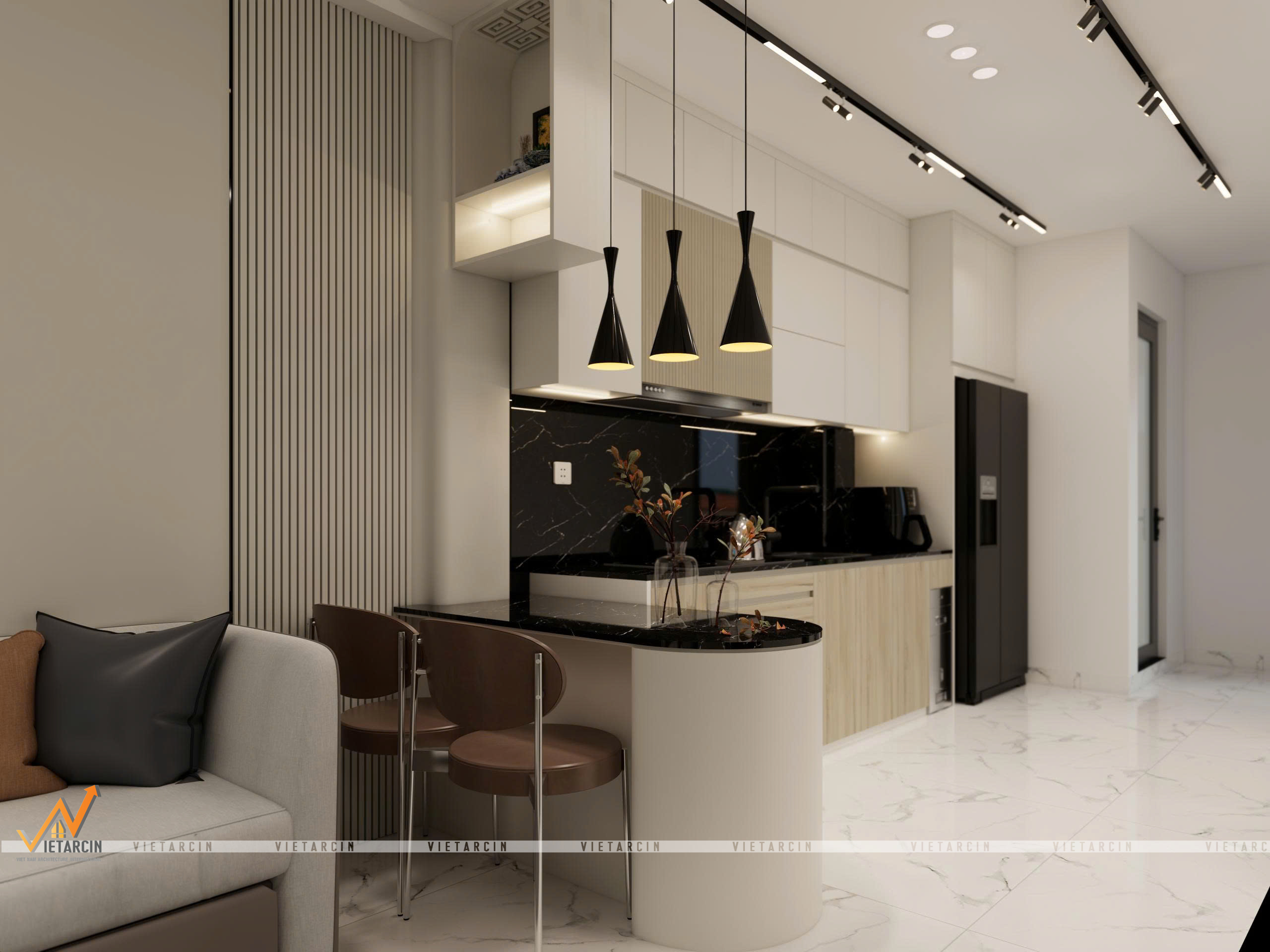 Tổng thể căn hộ được khoác lên mình gam màu trắng – be chủ đạo để “kéo rộng” không gian về mặt thị giác. Tuy nhiên, để tạo chiều sâu và tránh sự nhàm chán, chúng tôi sử dụng các điểm nhấn màu đen và xám ghi từ khung cửa kính, hệ đèn ray nam châm và các mảng tường ốp vách trang trí.