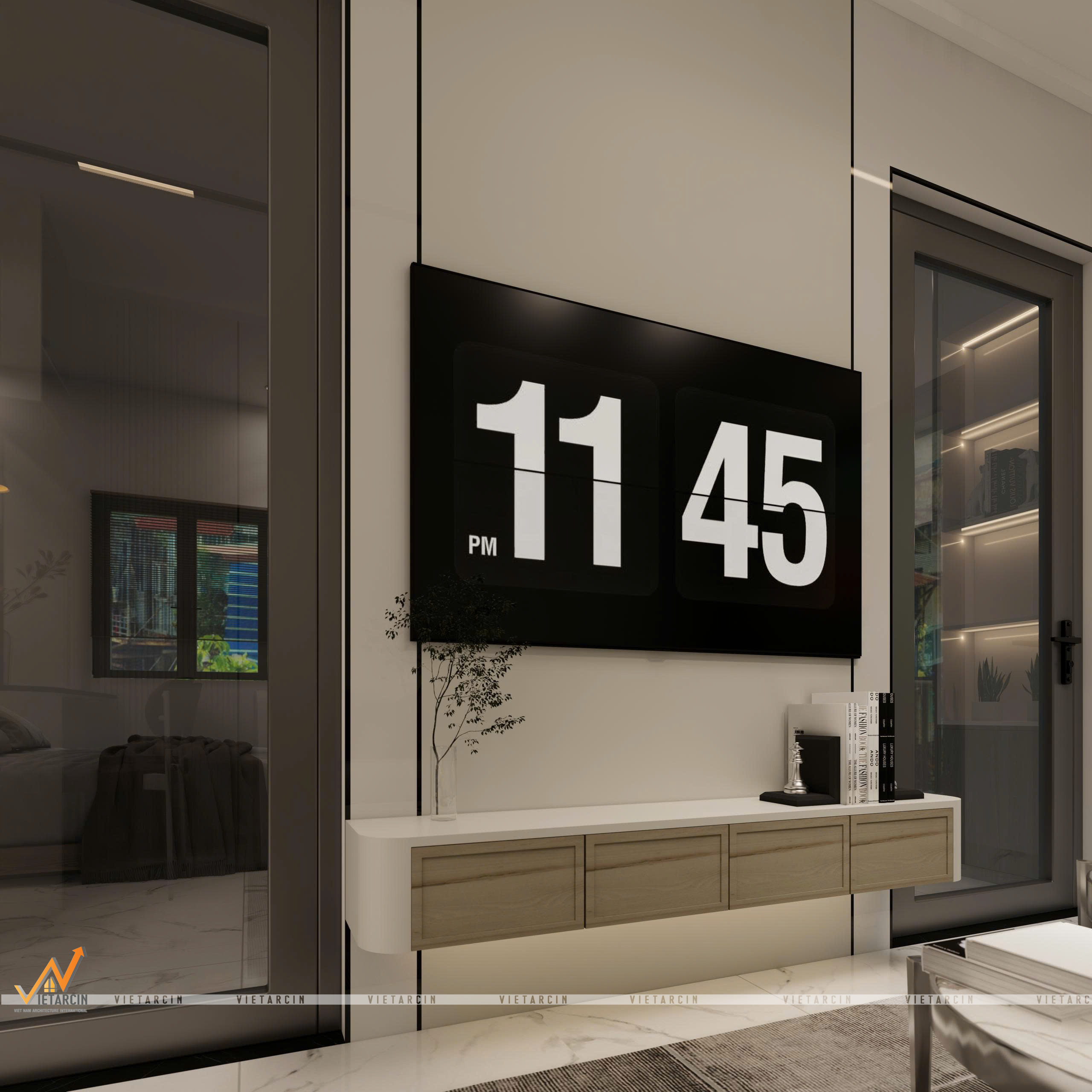 - Mảng tường sau sofa và vách TV được xử lý bằng sự kết hợp giữa gỗ phẳng và lam sóng sơn trắng/be đồng bộ.