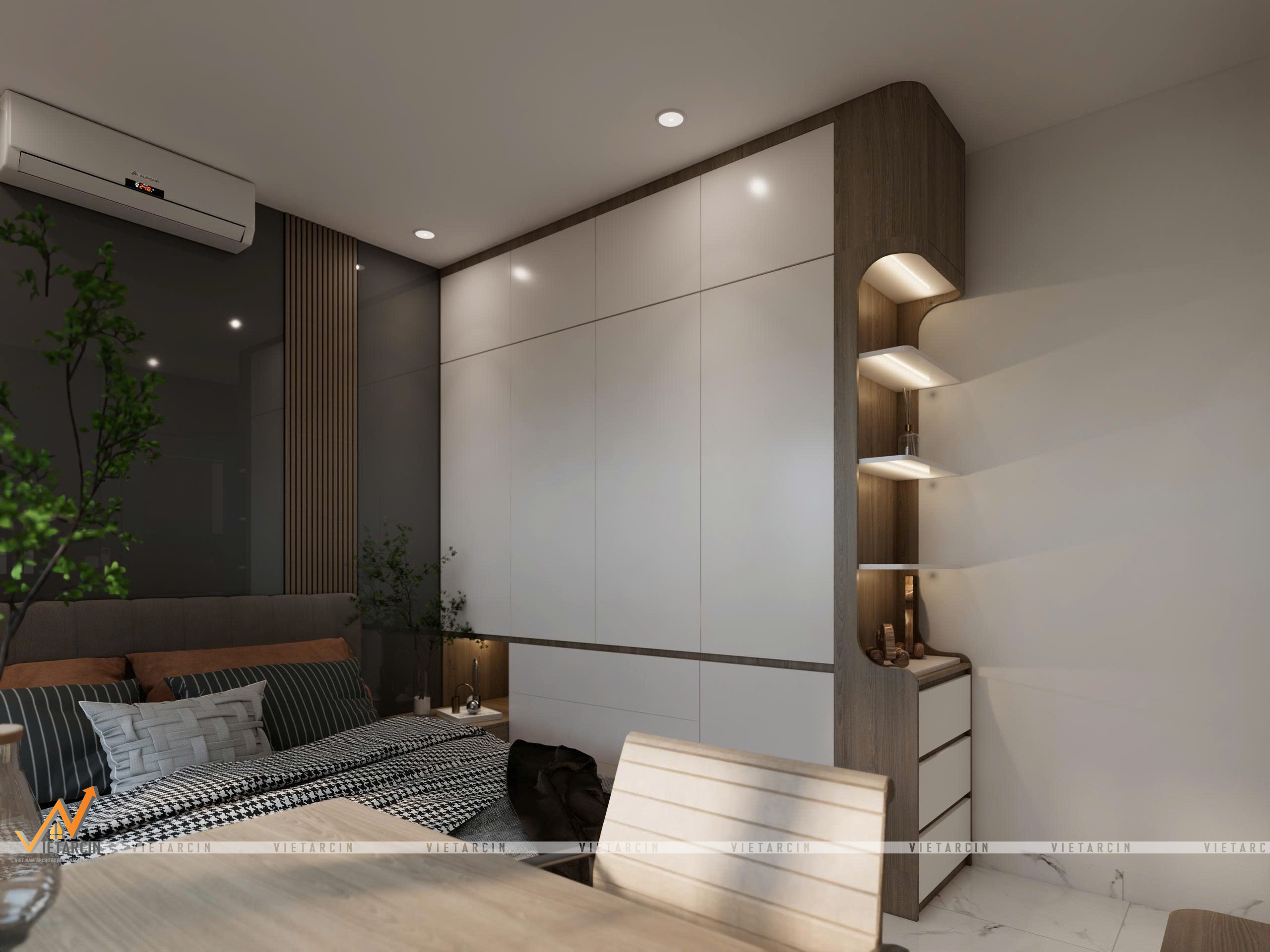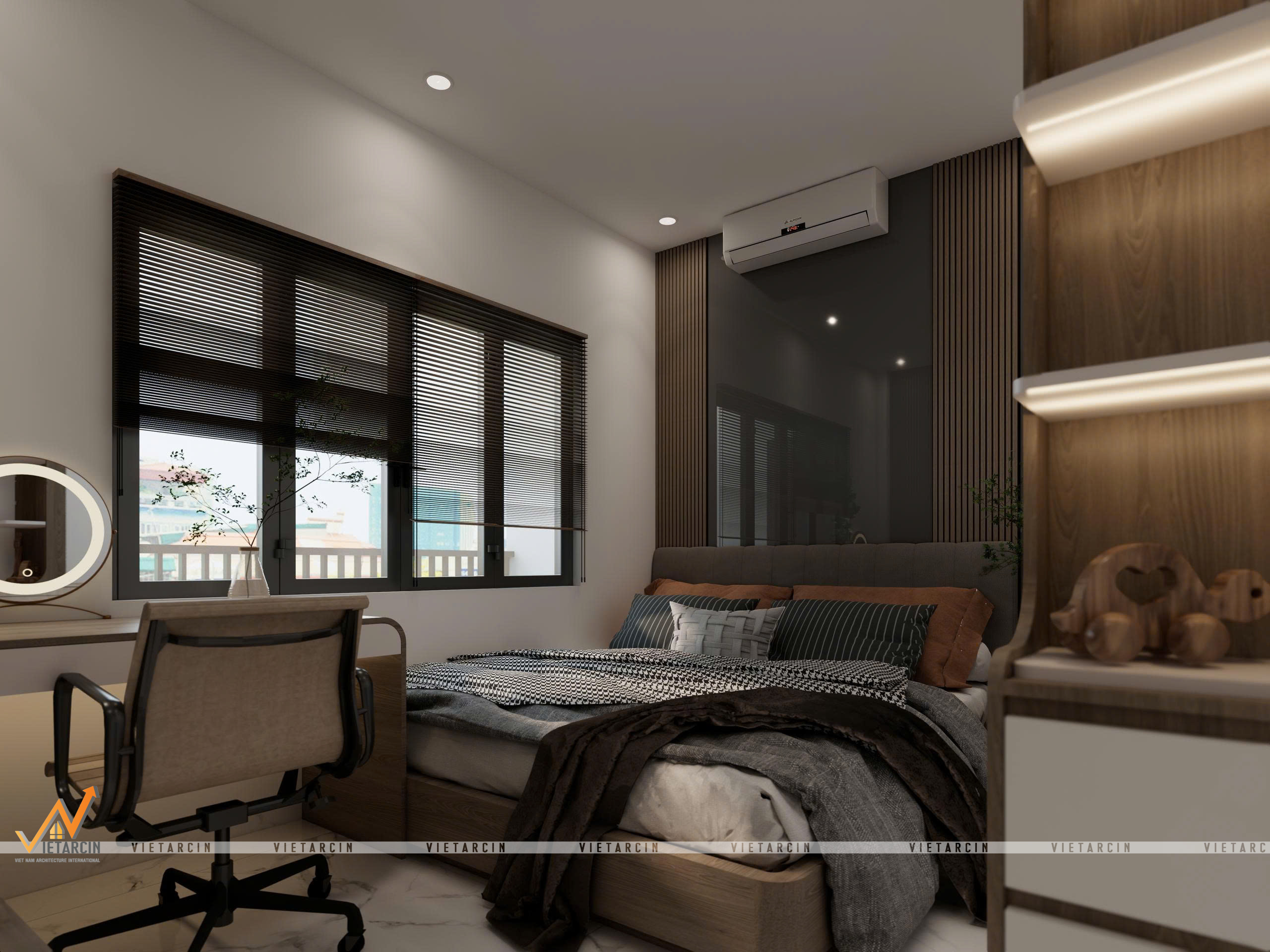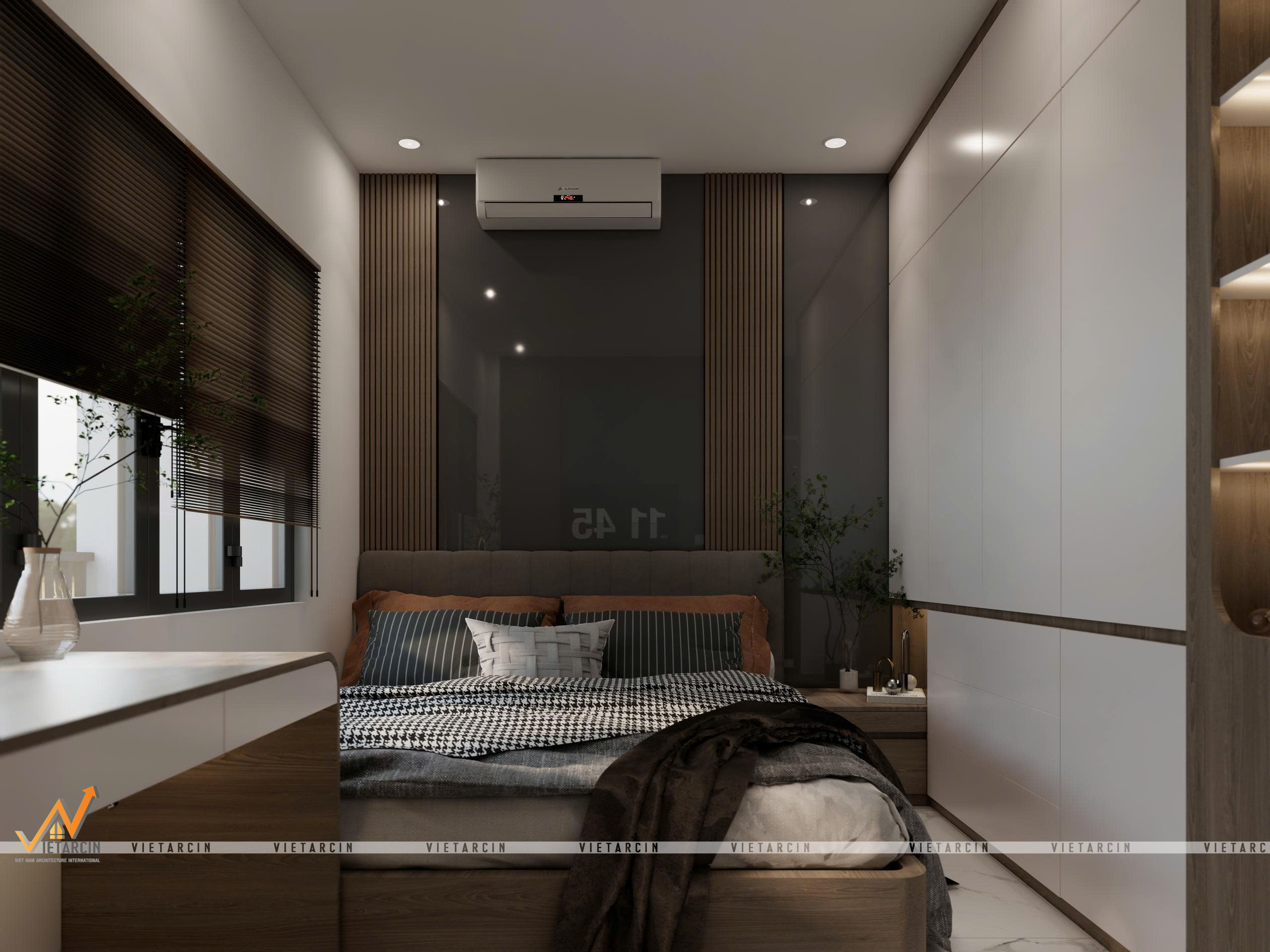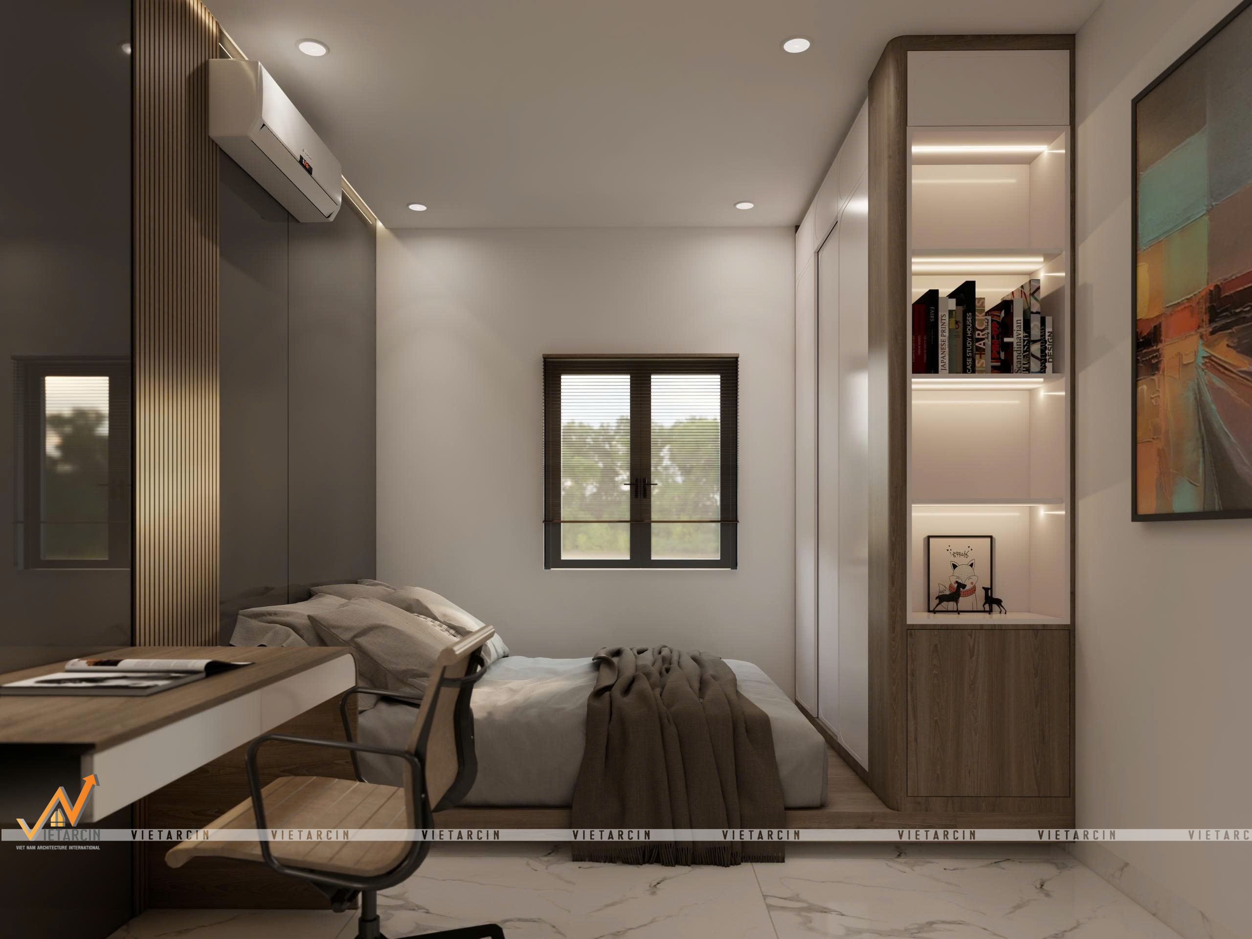 - Nội thất “May đo”: Toàn bộ hệ tủ, giường đều được thiết kế kịch trần hoặc tích hợp đa năng (giường dạng bục – platform bed). Các chi tiết như vách lam sóng, tủ trưng bày âm tường được tính toán kỹ lưỡng để vừa trang trí, vừa là nơi lưu trữ đồ đạc gọn gàng.