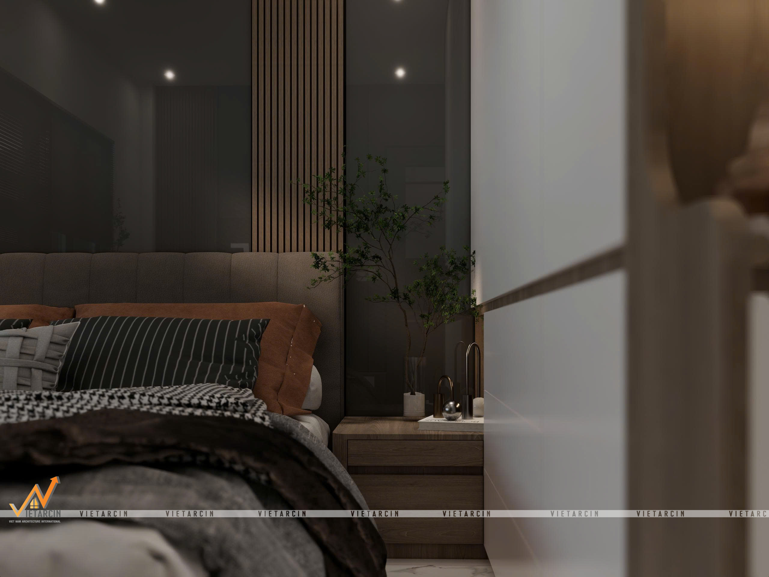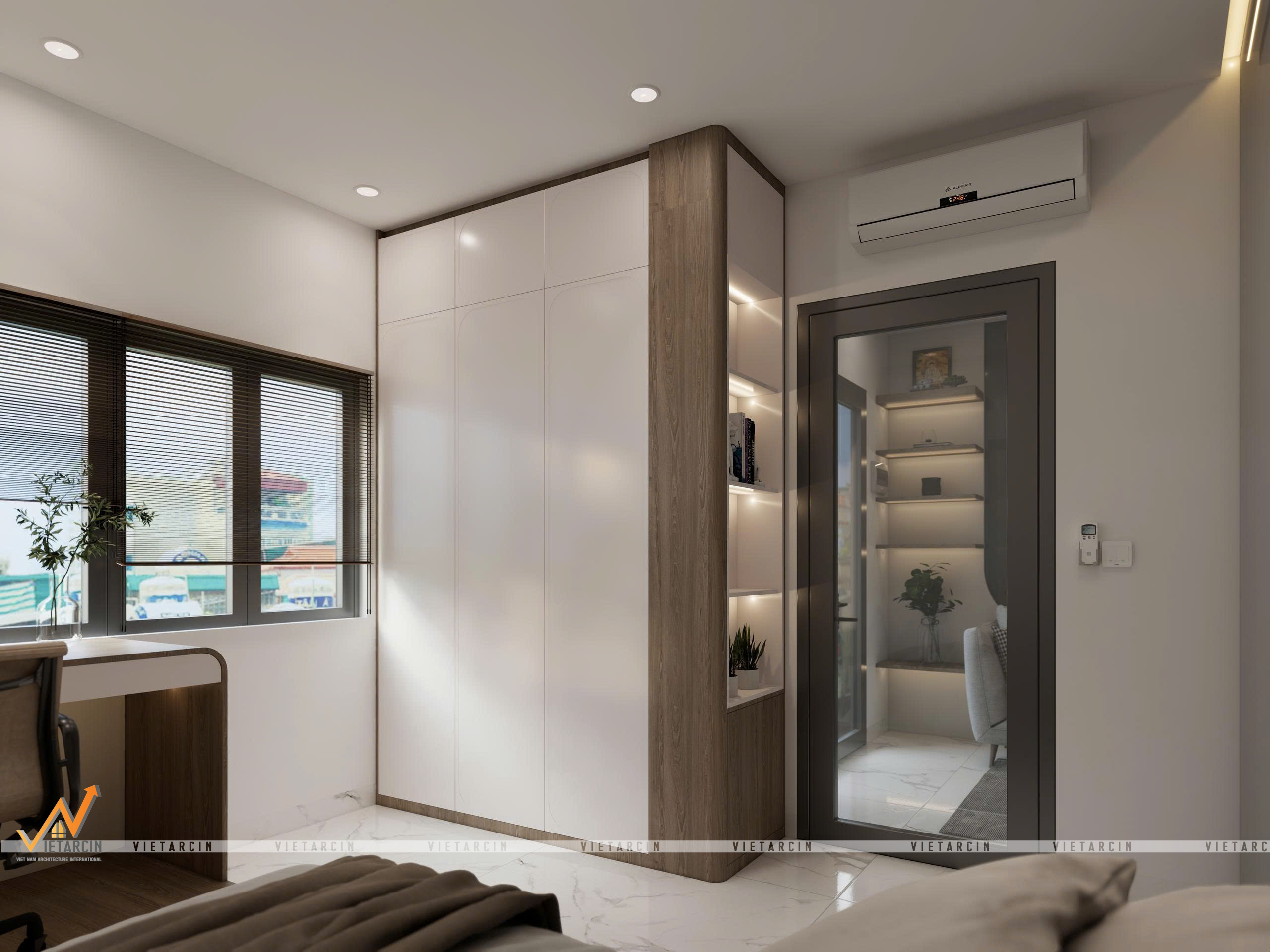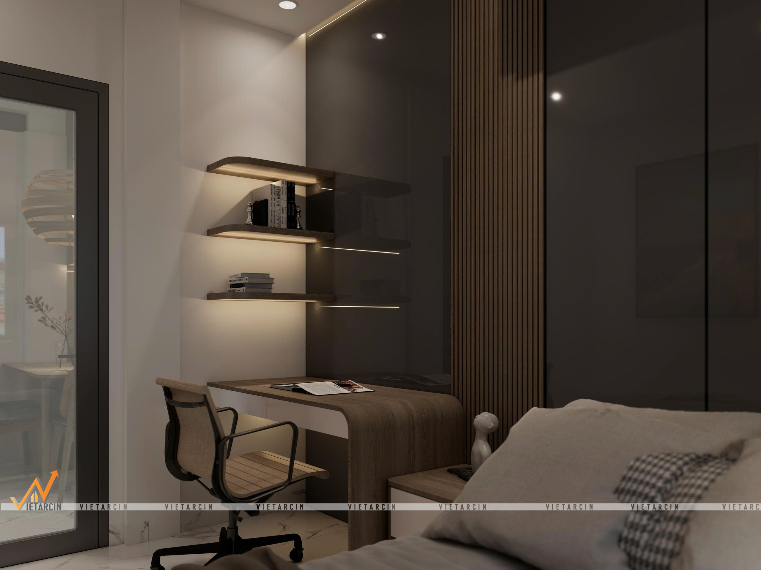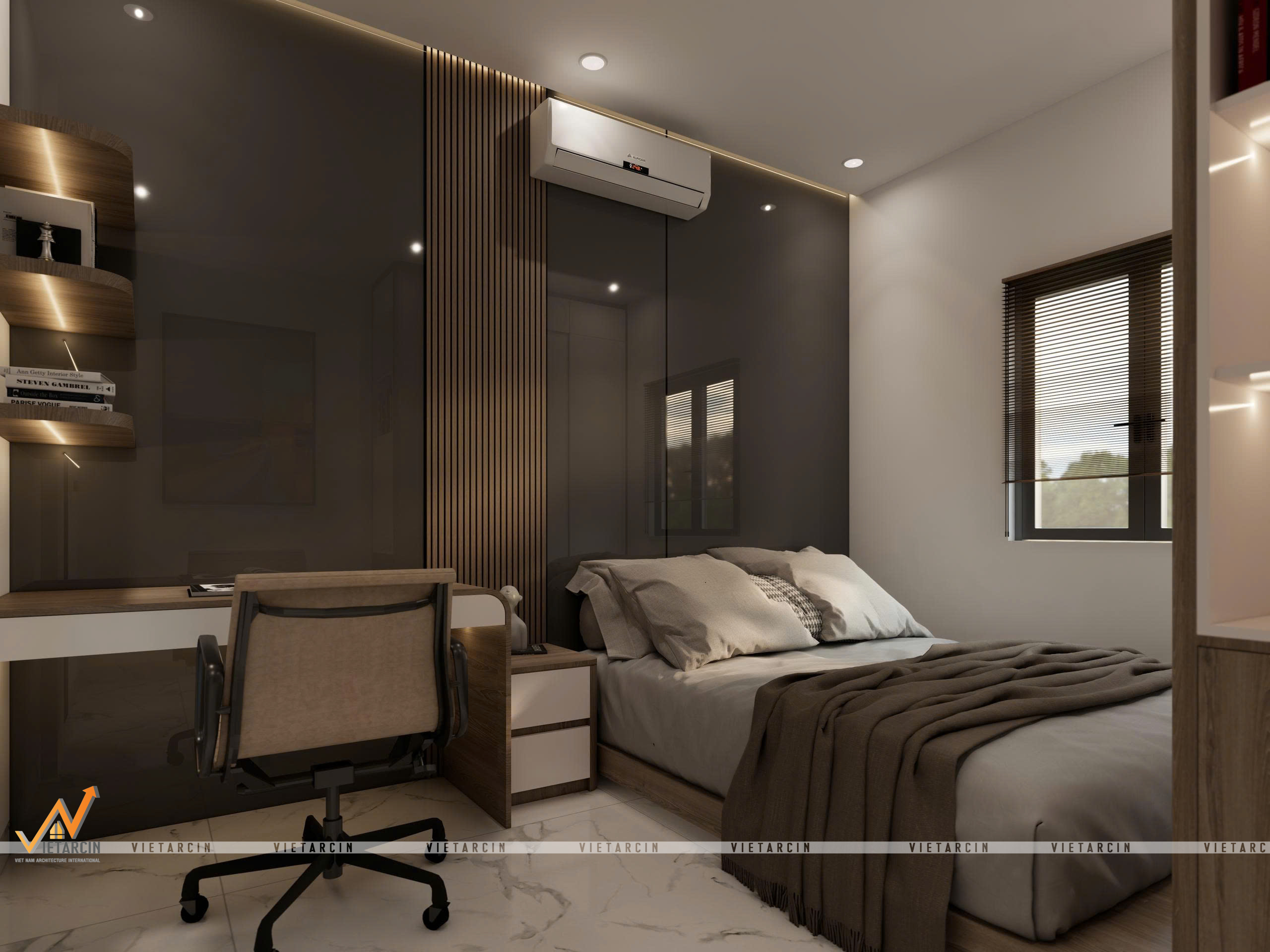 - Nội thất “May đo”: Toàn bộ hệ tủ, giường đều được thiết kế kịch trần hoặc tích hợp đa năng (giường dạng bục – platform bed). Các chi tiết như vách lam sóng, tủ trưng bày âm tường được tính toán kỹ lưỡng để vừa trang trí, vừa là nơi lưu trữ đồ đạc gọn gàng.