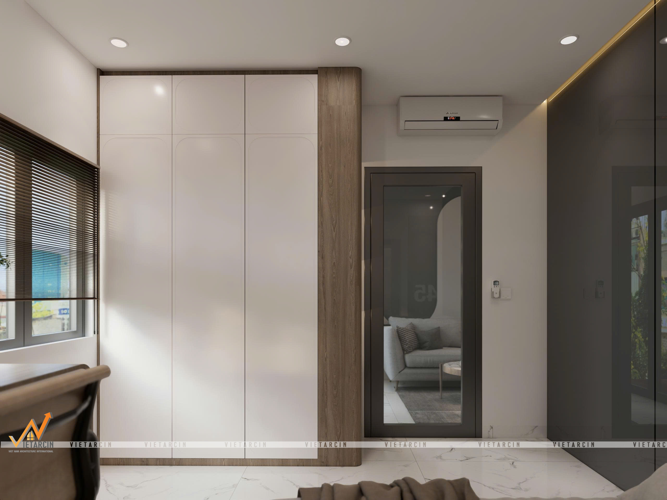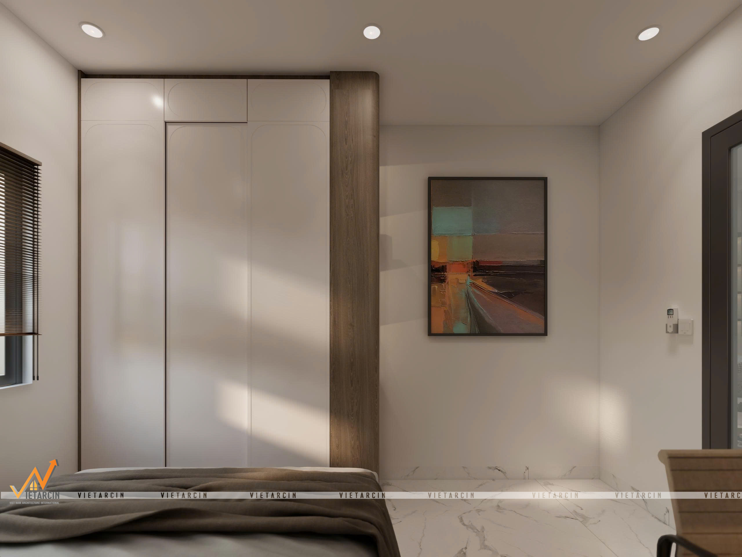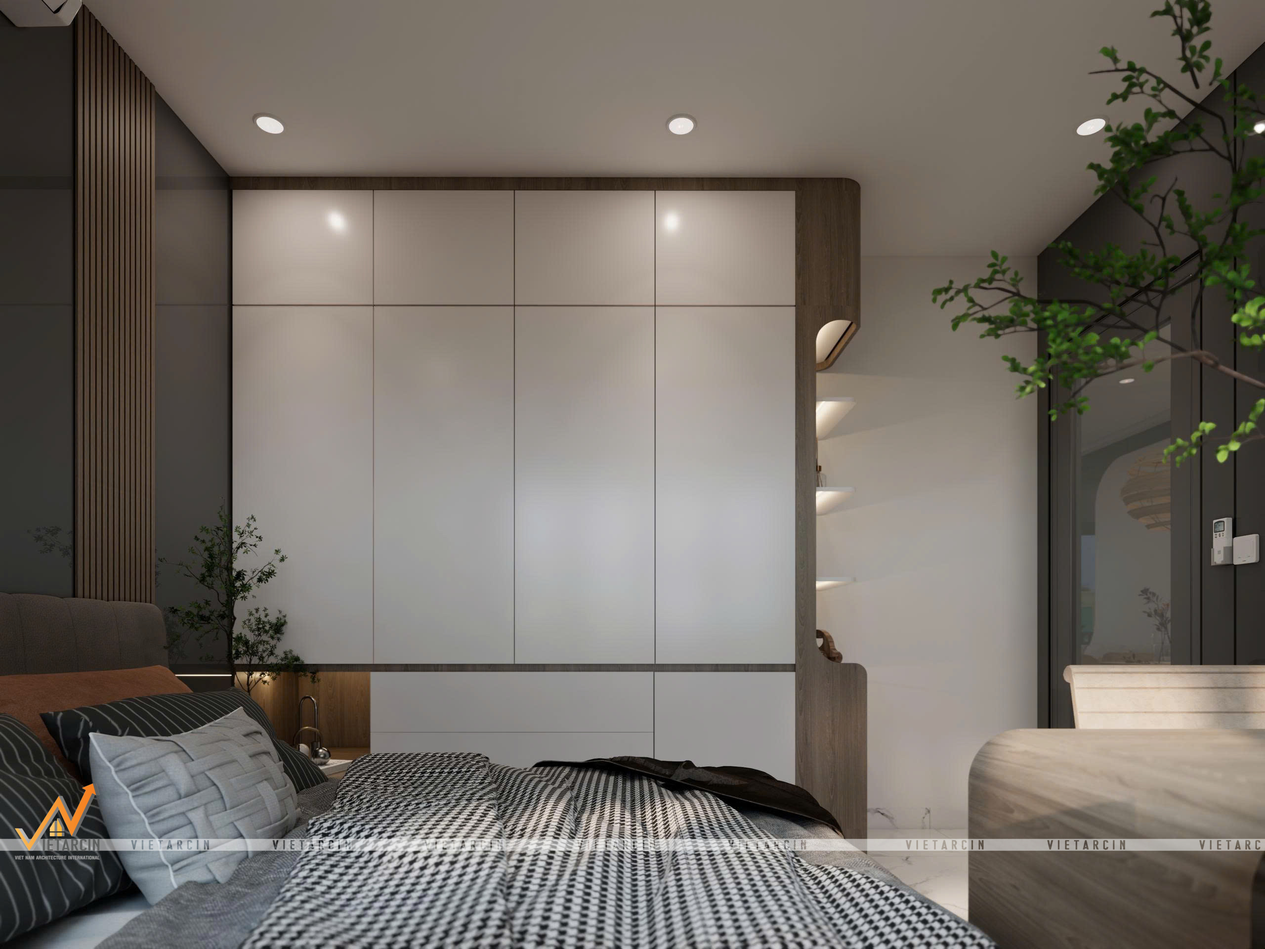 - Tủ quần áo được thiết kế nối liền mạch với giường ngủ, sử dụng cánh tủ phẳng màu trắng để giảm cảm giác nặng nề.
