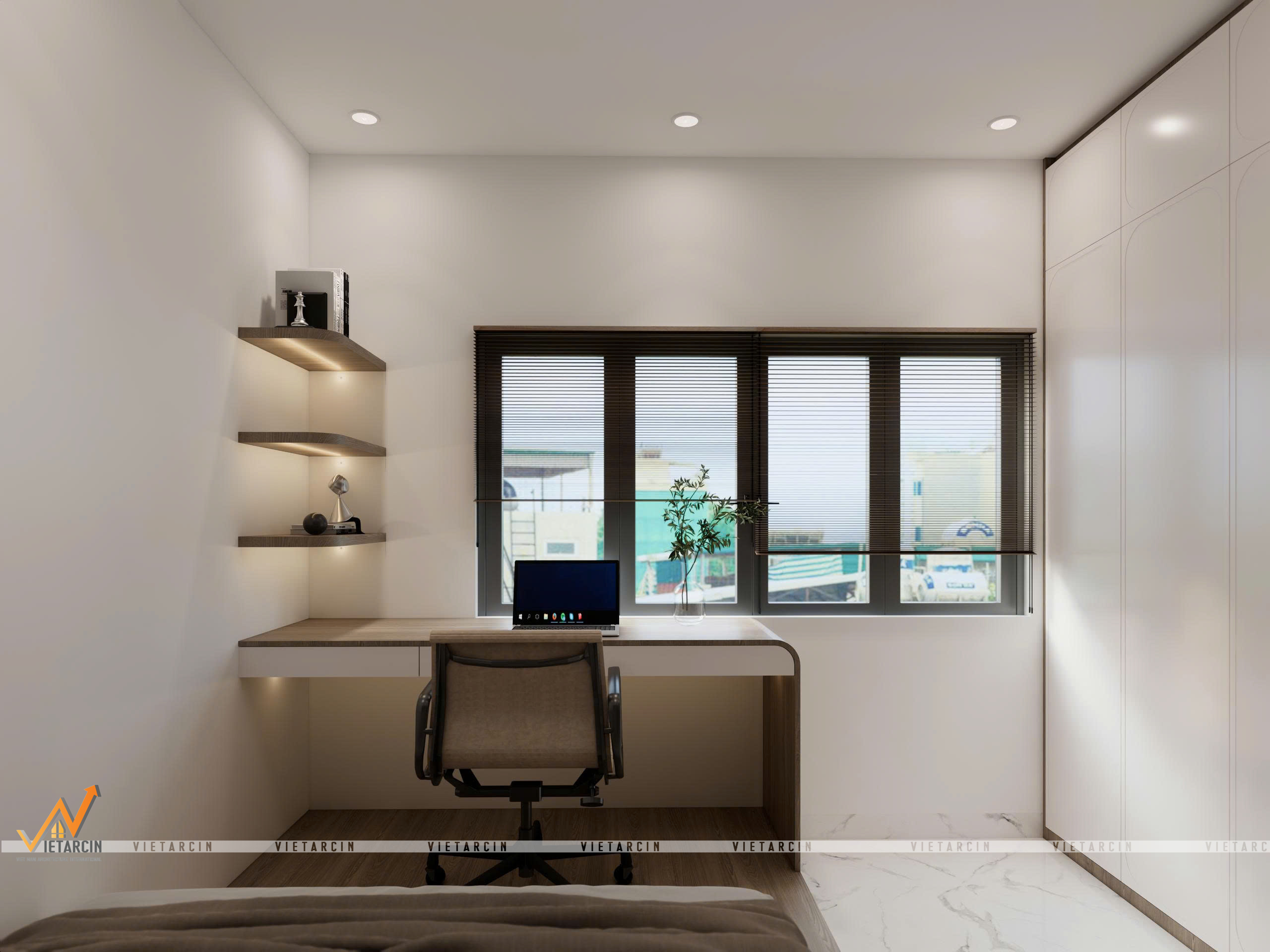 Tối ưu ánh sáng tự nhiên: Bàn làm việc được bố trí chạy dọc theo khung cửa sổ lớn. Chúng tôi sử dụng rèm sáo nhôm/gỗ màu tối để kiểm soát ánh sáng linh hoạt. Ánh sáng tự nhiên tràn ngập giúp căn phòng nhỏ luôn tràn đầy năng lượng tích cực.