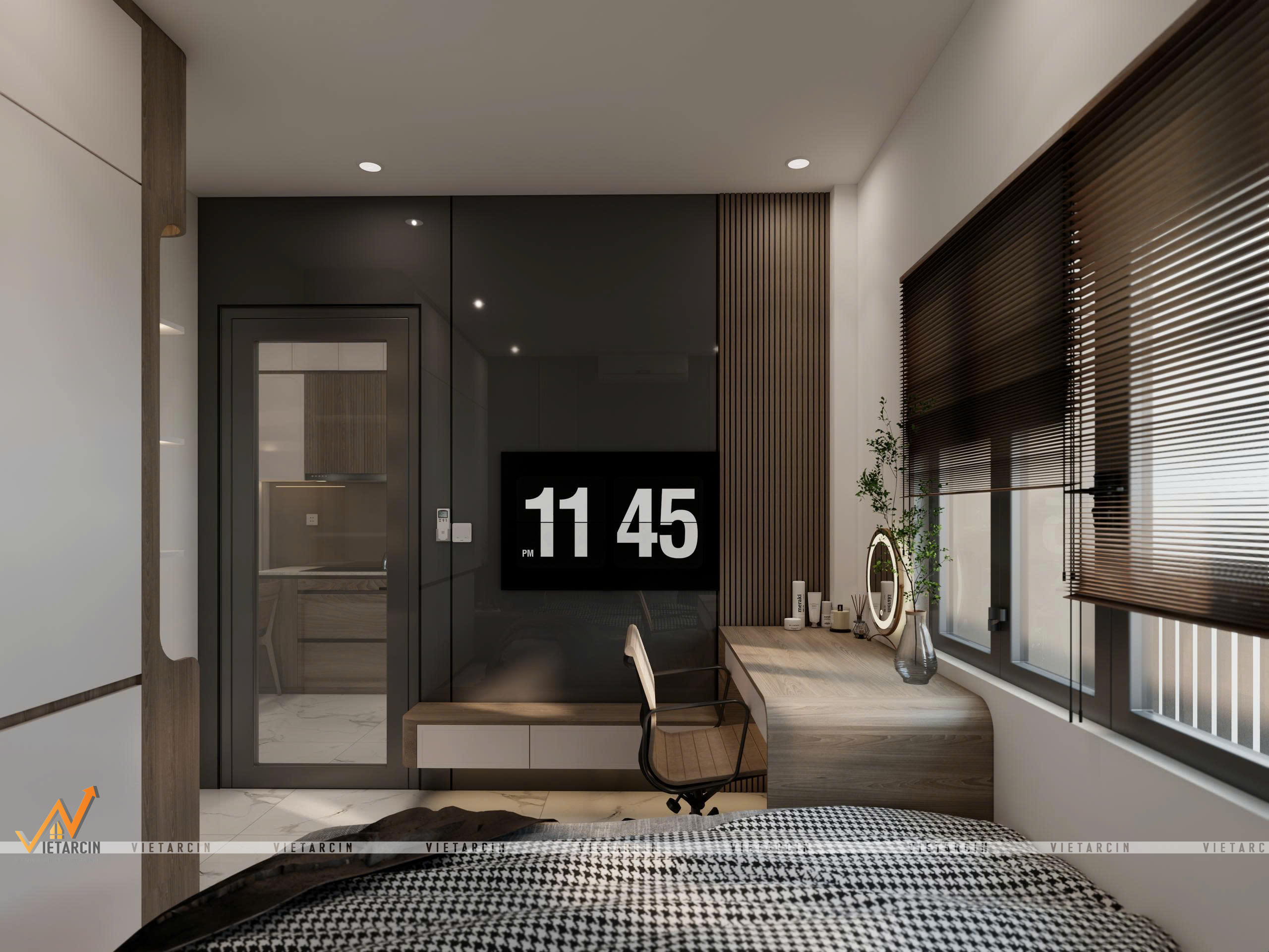 - Tương tự như phòng Master, tôi tiếp tục sử dụng mảng ốp Acrylic bóng gương màu đen kết hợp nan gỗ sọc.