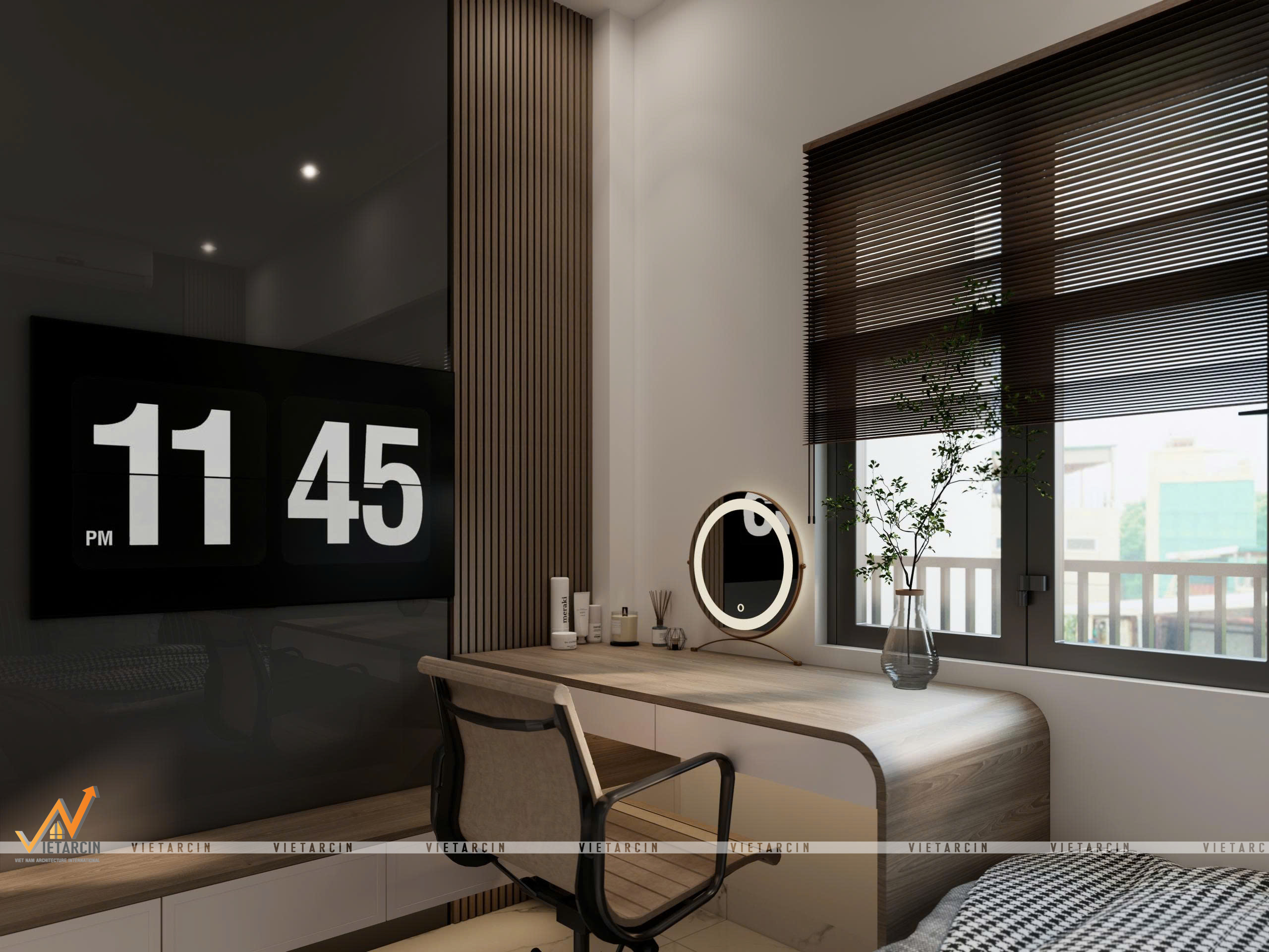 - Vị trí bàn được đặt ngay cạnh cửa sổ lớn đón trọn ánh sáng tự nhiên. Chúng tôi sử dụng rèm sáo gỗ màu tối đồng bộ, giúp điều tiết ánh sáng linh hoạt và giữ được sự riêng tư cần thiết.