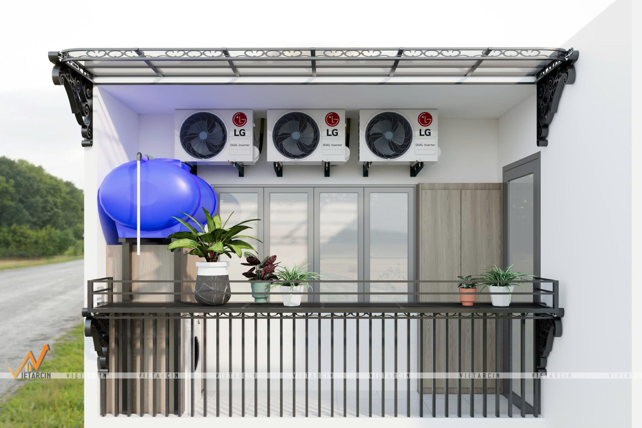 - Bồn nước dự trữ: Đây là yêu cầu riêng của chị Xuân để đảm bảo nguồn nước sinh hoạt ổn định. Do bồn nước có kích thước lớn và màu xanh đặc trưng khá “thô”, chúng tôi đã bố trí nó vào góc khuất, đặt trên hệ khung thép gia cố chịu lực, đảm bảo an toàn tuyệt đối mà không chắn tầm nhìn từ trong nhà nhìn ra.