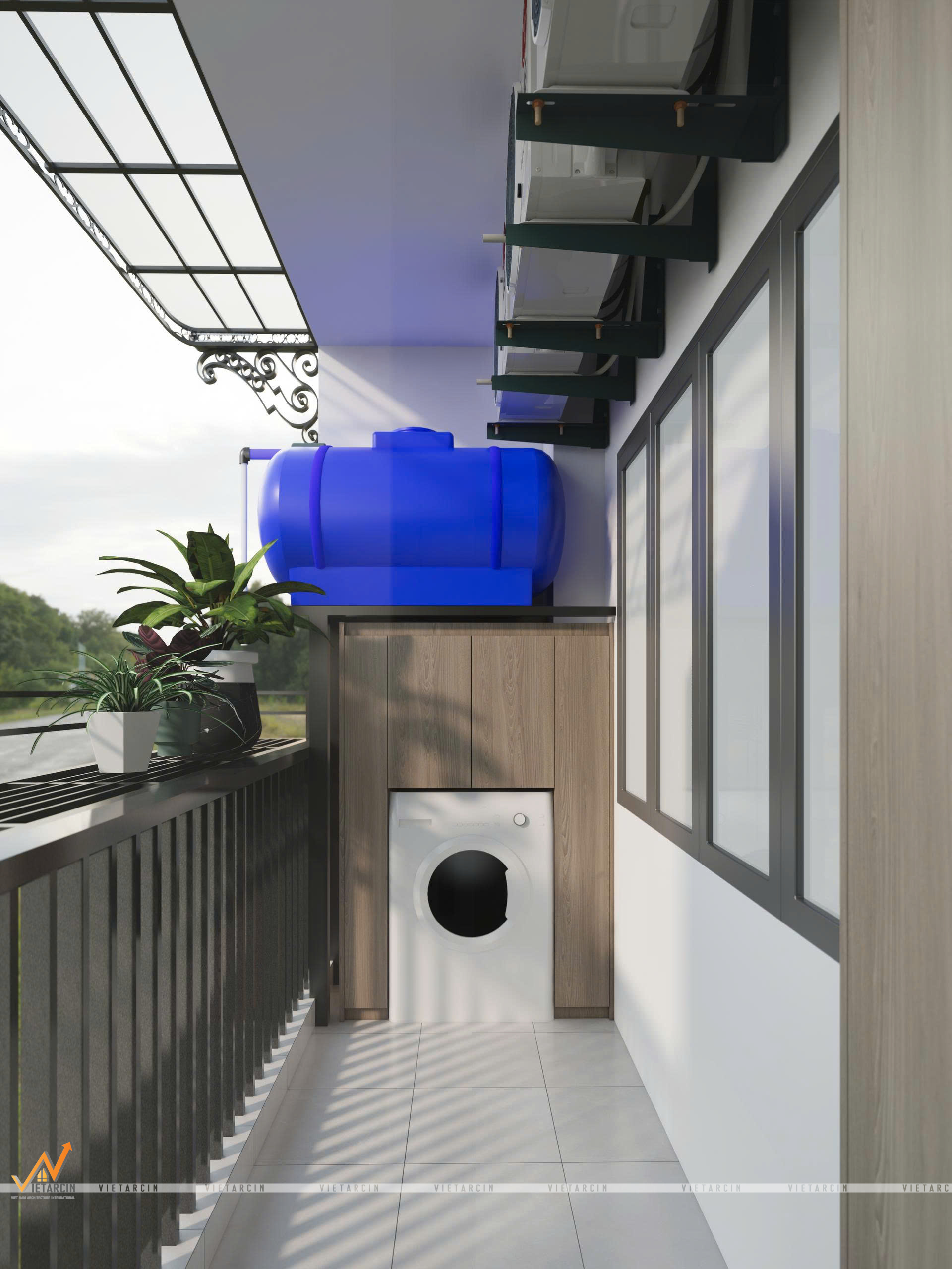 Với diện tích hạn chế của chung cư, việc “nhồi nhét” bồn nước dự trữ (theo yêu cầu đặc biệt của gia chủ), giàn nóng máy lạnh và máy giặt vào một không gian nhỏ hẹp là bài toán không dễ. Vaidecor đã giải quyết bằng tư duy “Sắp xếp theo chiều dọc”.