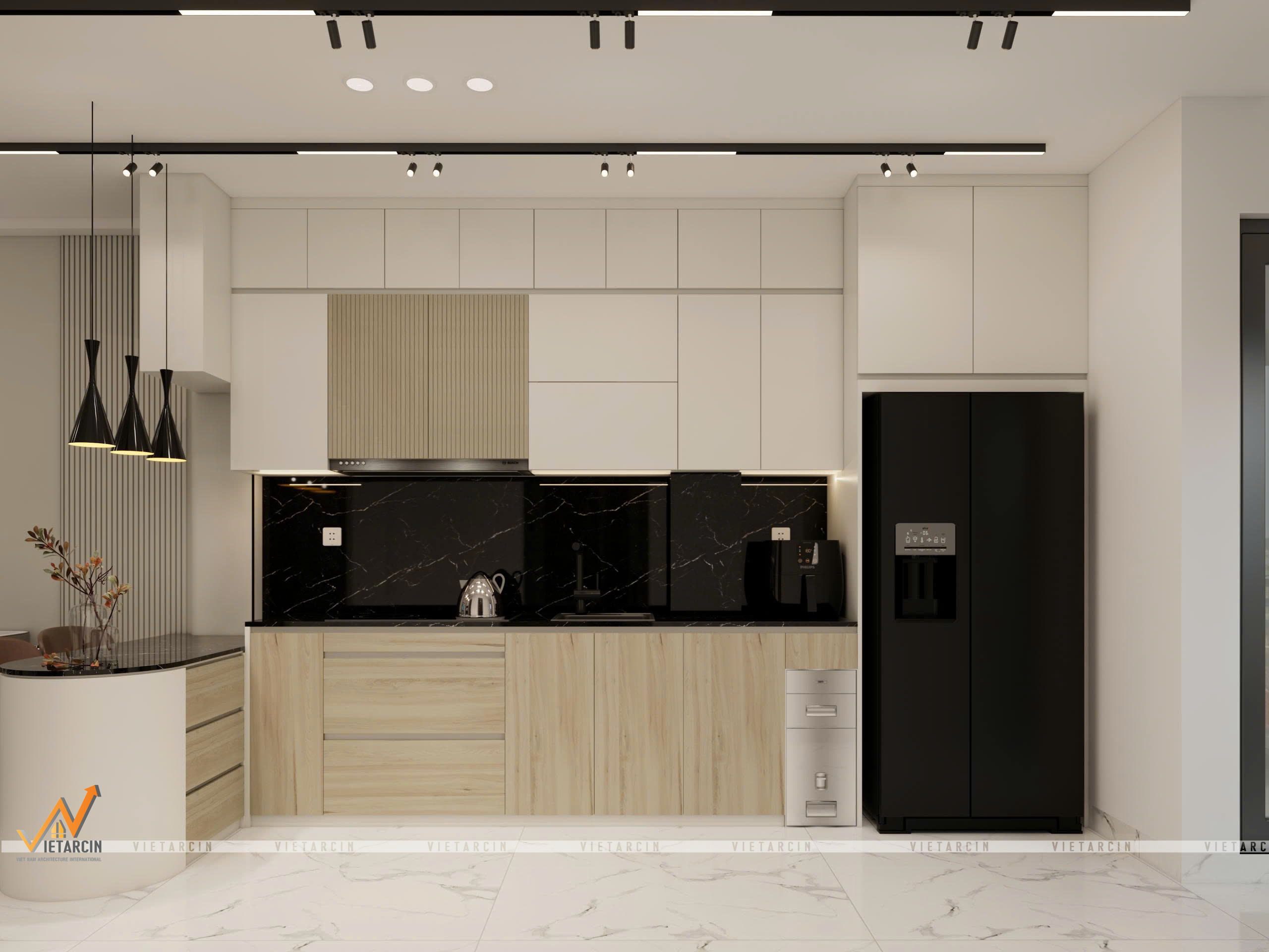 Tích hợp thiết bị thông minh: Tủ lạnh Side-by-side màu đen được đặt trong hốc tủ đo ni đóng giày, tạo thành một mặt phẳng liền mạch, không có chi tiết thừa. Các thiết bị như lò nướng, hút mùi đều được tính toán lắp âm để tối ưu thẩm mỹ.
