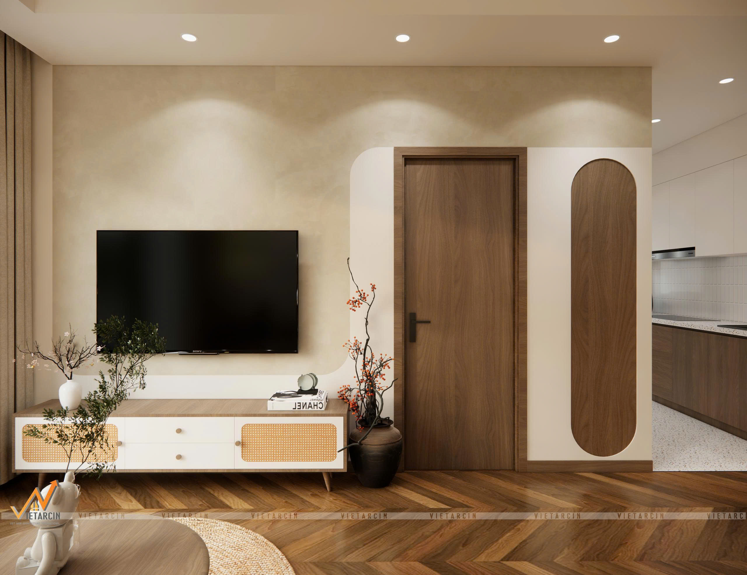 - Vách TV: Sự kết hợp giữa mảng tường sơn hiệu ứng màu kem nhạt (Wabi Sabi) và mảng tường trắng tạo thành một khối chữ ‘L’ mềm mại, có các góc bo tròn lớn. Giải pháp này giúp làm mềm không gian và tạo ra phông nền hoàn hảo cho chiếc TV.