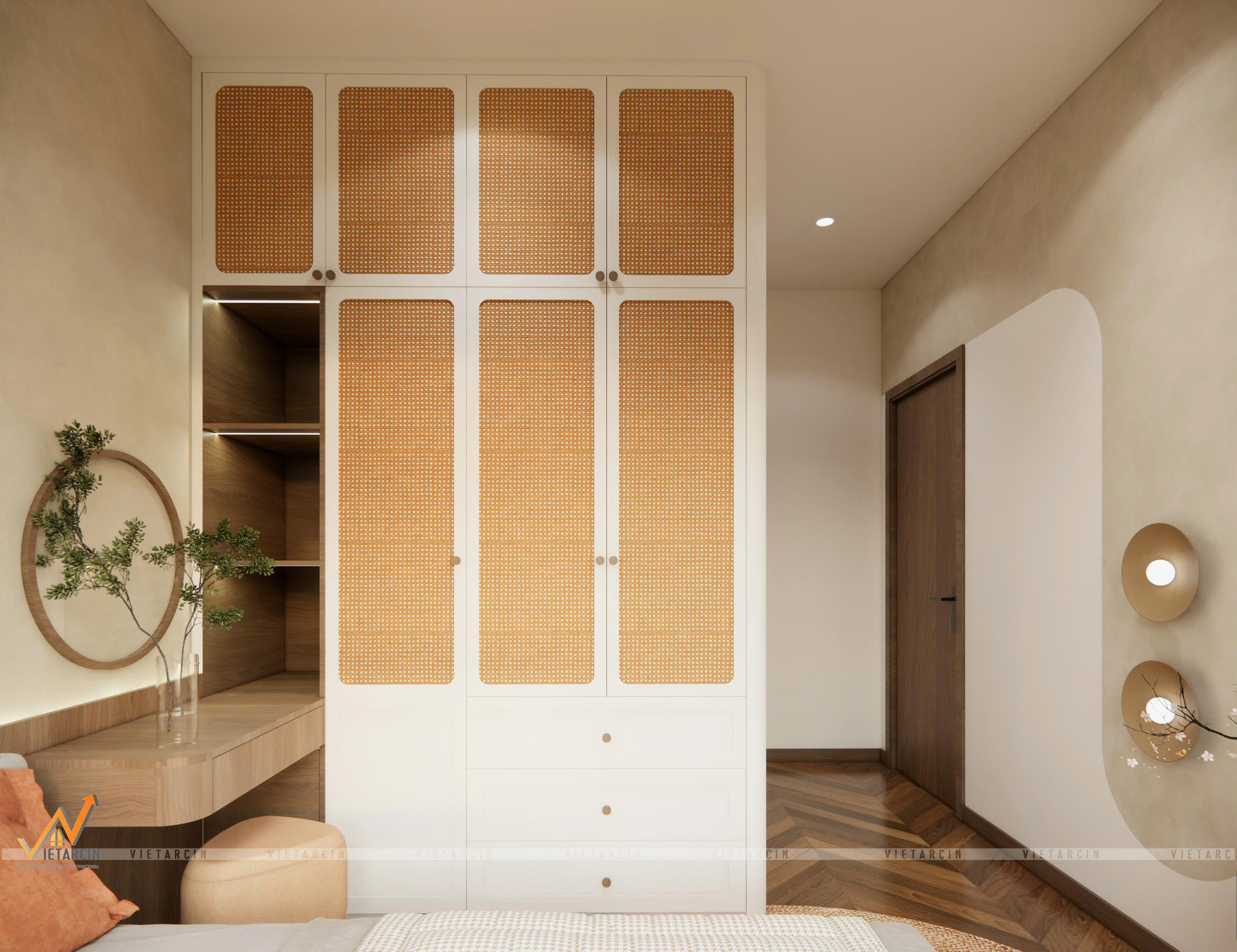 - Tủ quần áo: Đây là điểm nhấn lớn nhất của phòng. Tủ được thiết kế cao sát trần, màu trắng chủ đạo, nhưng các cánh tủ lớn (tủ đồ khô) sử dụng vật liệu mây đan hoặc lưới mắt cáo màu vàng cam nhạt. Sự kết hợp này mang lại cảm giác nhẹ nhàng, thông thoáng và rất “Wabi Sabi”, trong khi vẫn đảm bảo công năng lưu trữ tối đa.