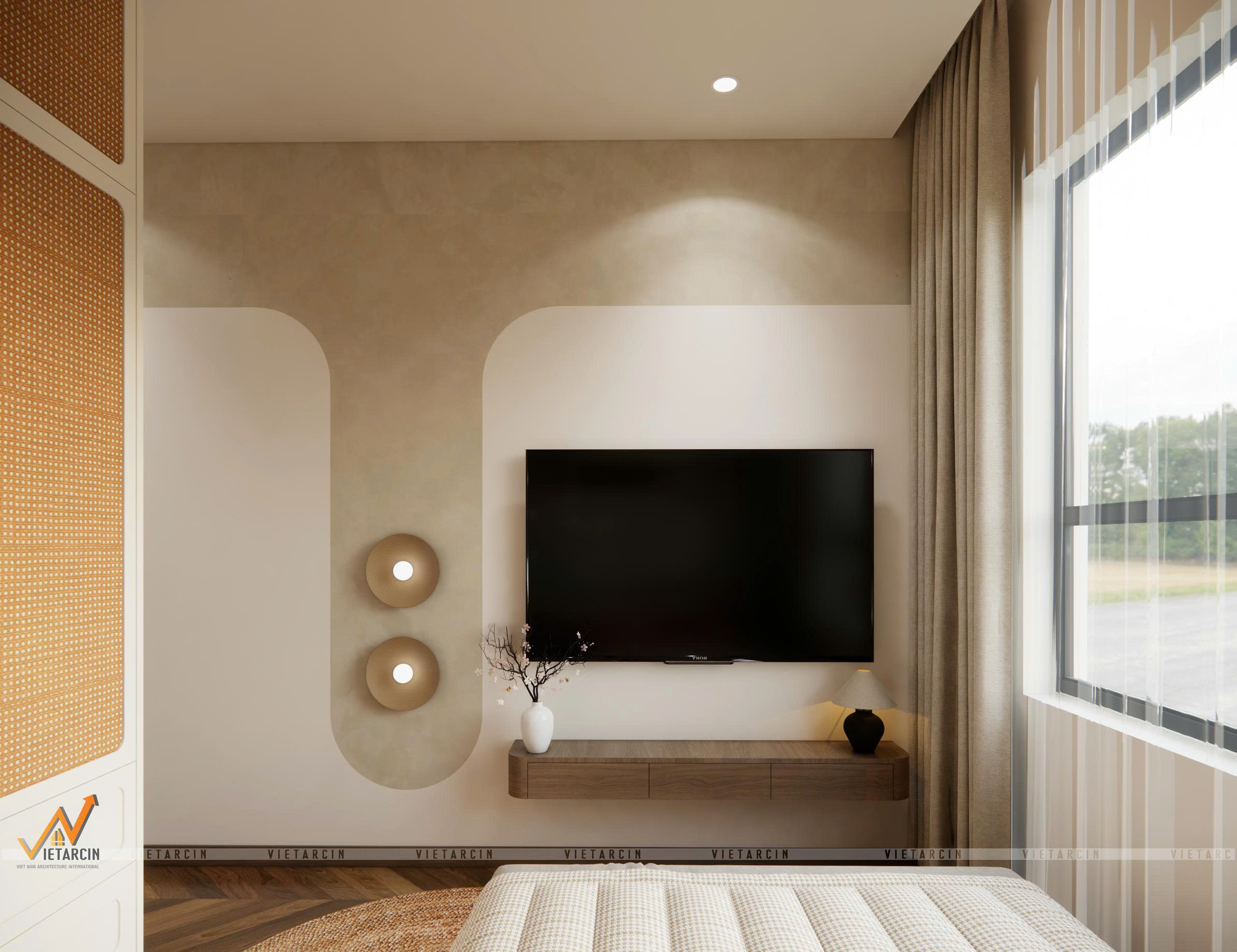 - Vách TV phòng ngủ: Tương tự vách phòng khách, vách TV phòng ngủ cũng sử dụng hình khối bo tròn lớn, kết hợp sơn hiệu ứng màu kem và hai chiếc đèn treo tường hình học ánh sáng vàng ấm, tạo nên một không gian xem thư giãn, thẩm mỹ hơn hẳn một bức tường TV thông thường.