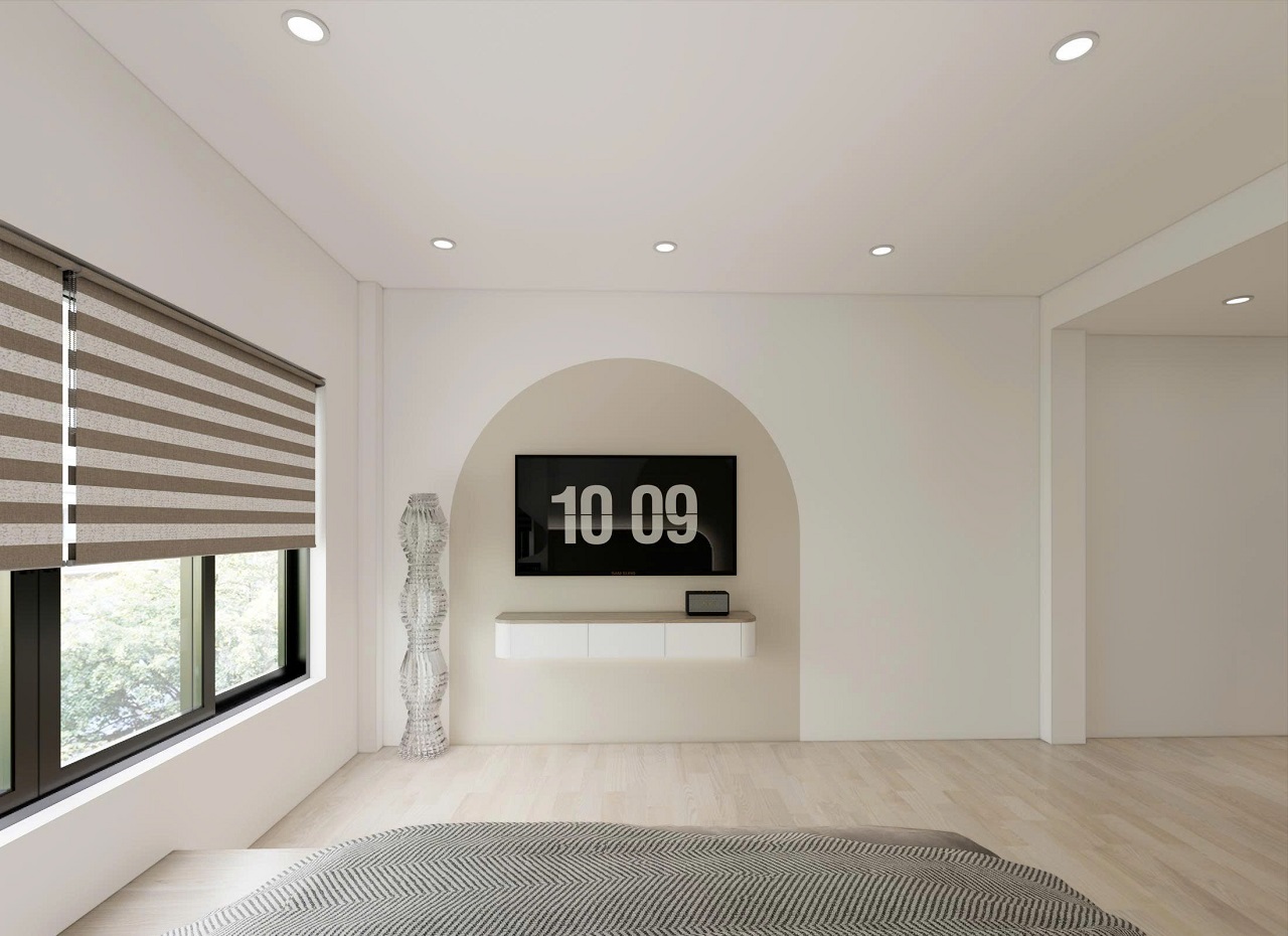 - Tường cong và TV âm tường: Các chi tiết tường cong và TV được treo trên kệ nổi không chỉ là điểm nhấn về mặt thẩm mỹ mà còn tạo cảm giác mềm mại cho không gian.
