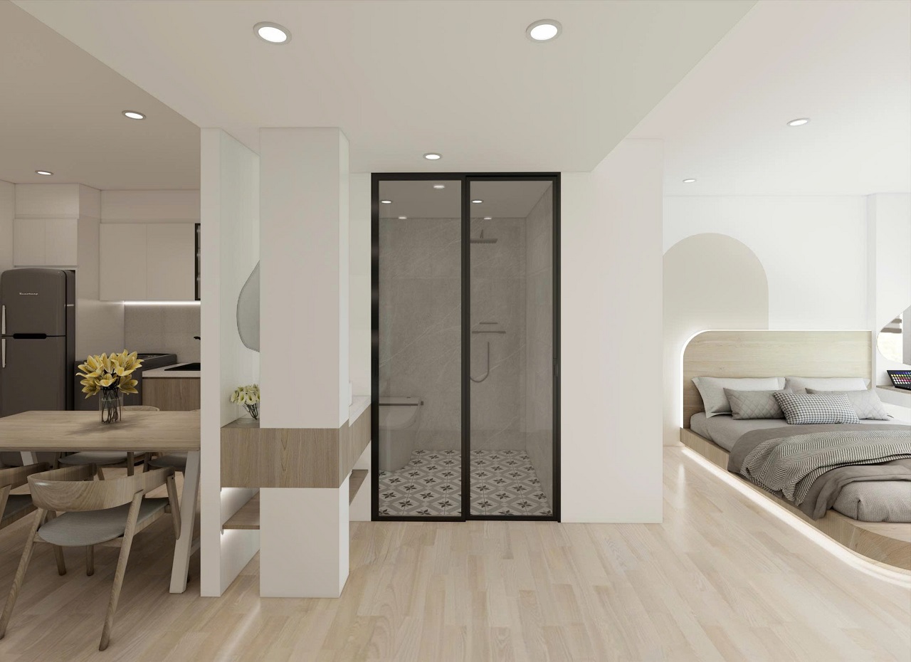 - Tách biệt khu vực lavabo: Lavabo được tách ra khỏi khu vực vệ sinh, đặt ngay cạnh phòng ngủ và khu bếp. Giải pháp này giúp tối ưu hóa không gian, cho phép một người sử dụng lavabo trong khi người khác đang sử dụng phòng vệ sinh, rất tiện lợi cho khách thuê.