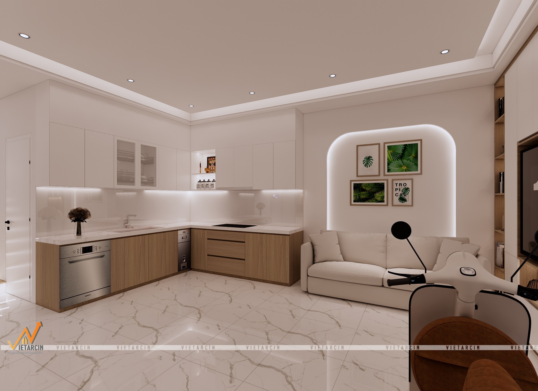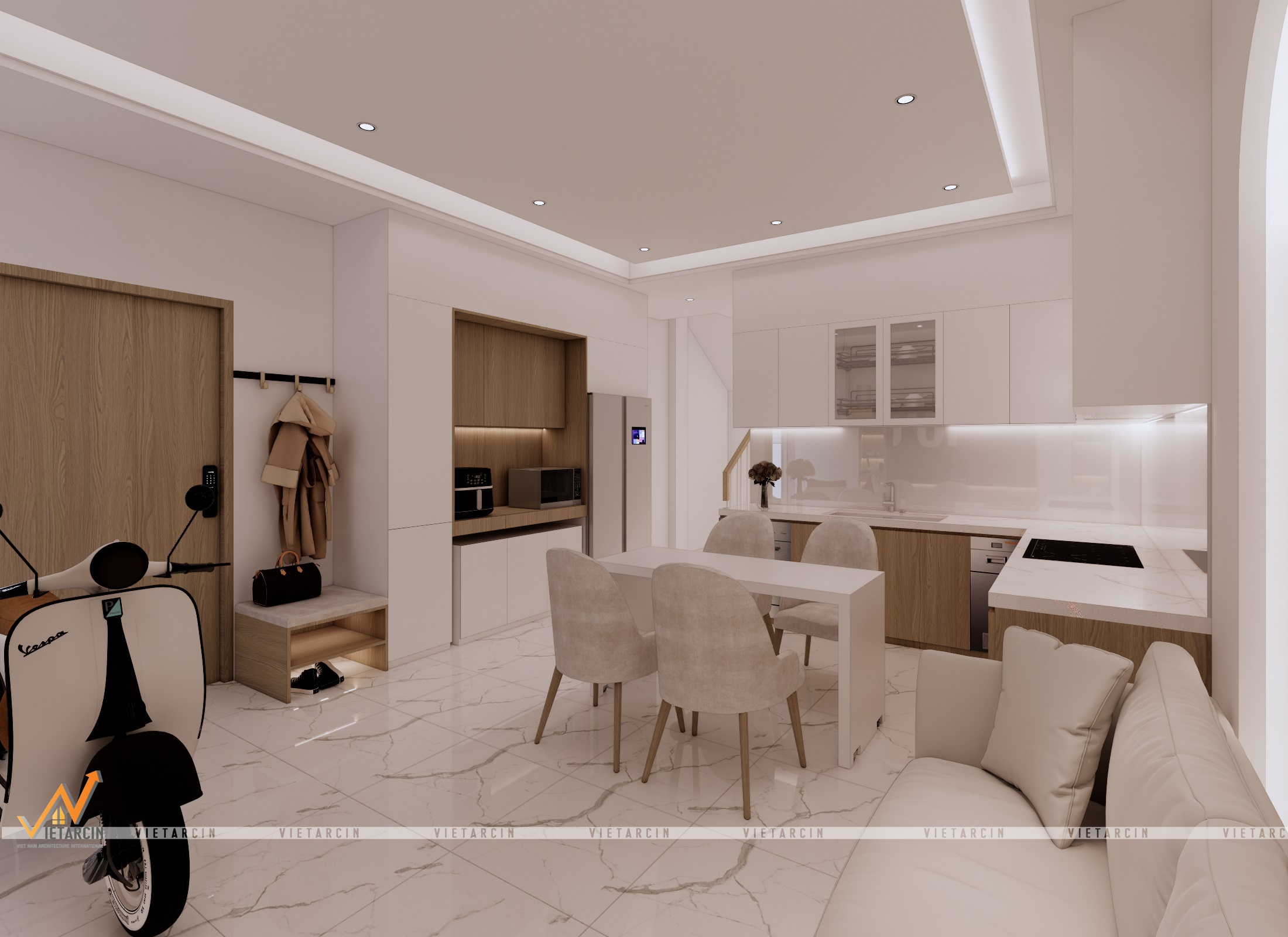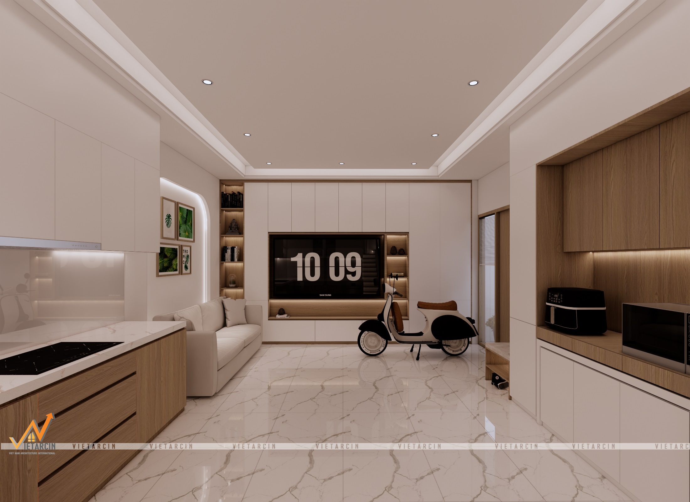 - Sử dụng vật liệu cao cấp & Màu sắc: Chúng tôi thay thế nền gạch cũ bằng gạch vân đá marble trắng sang trọng cho sàn nhà, tạo sự phản chiếu ánh sáng tuyệt vời. Tone màu chủ đạo là trắng kết hợp với gỗ công nghiệp màu nâu ấm.