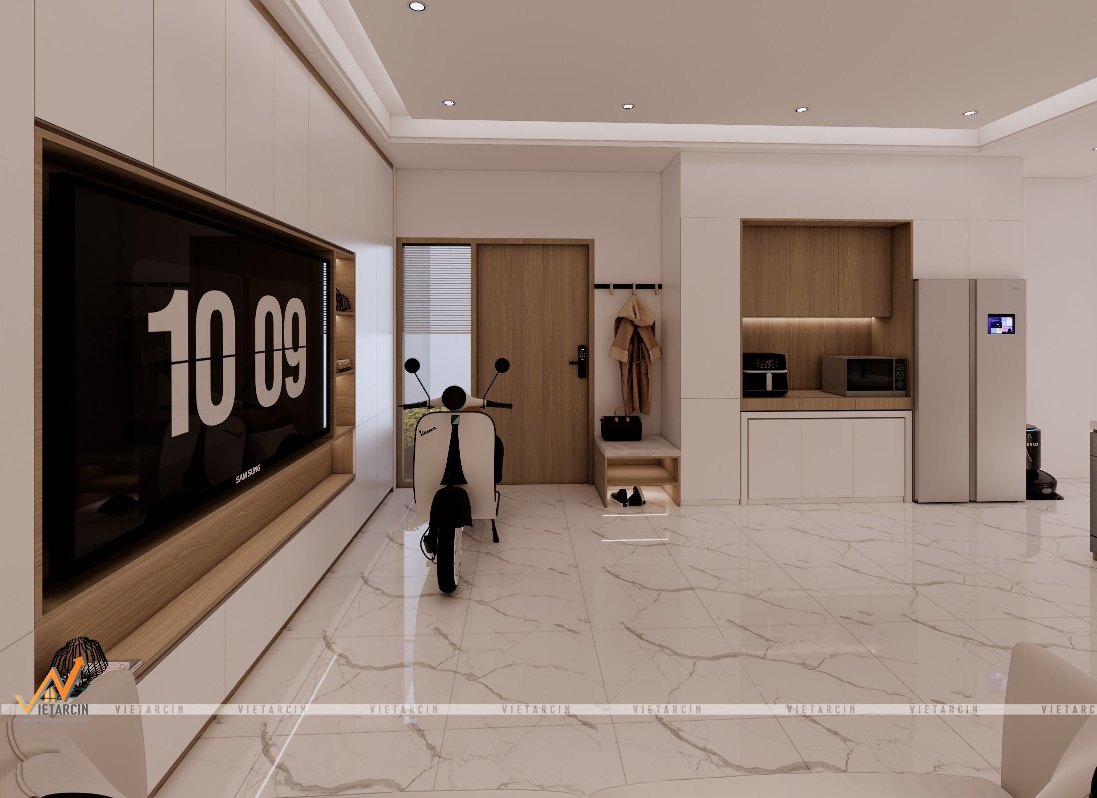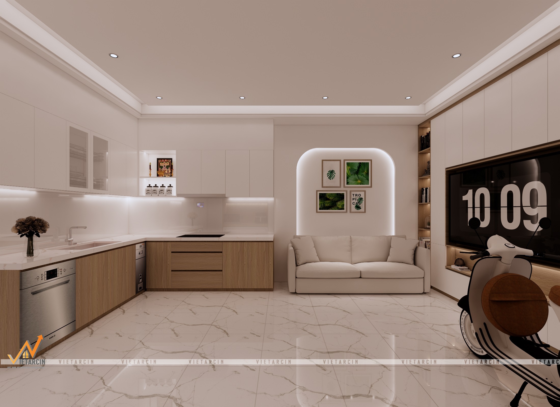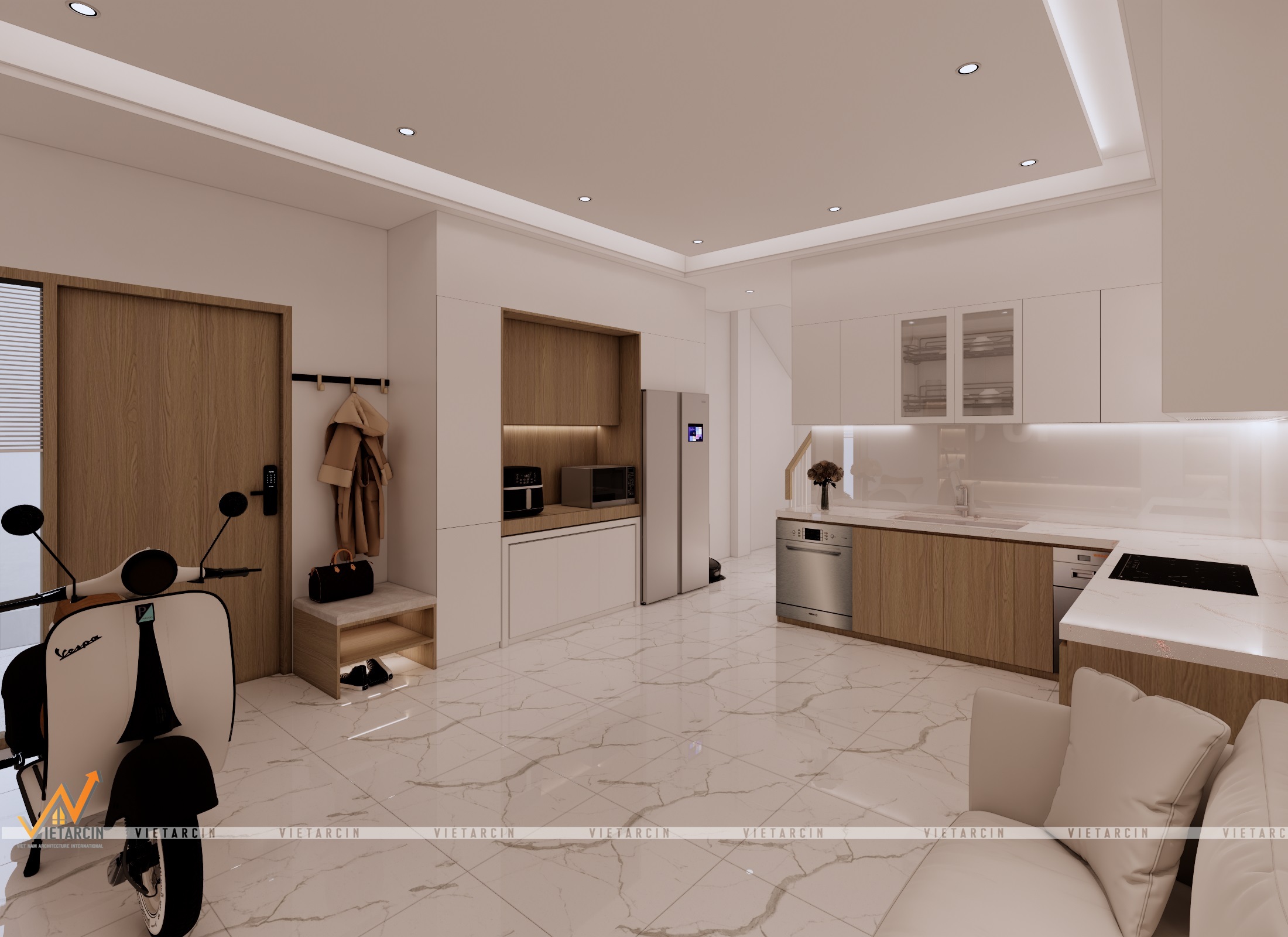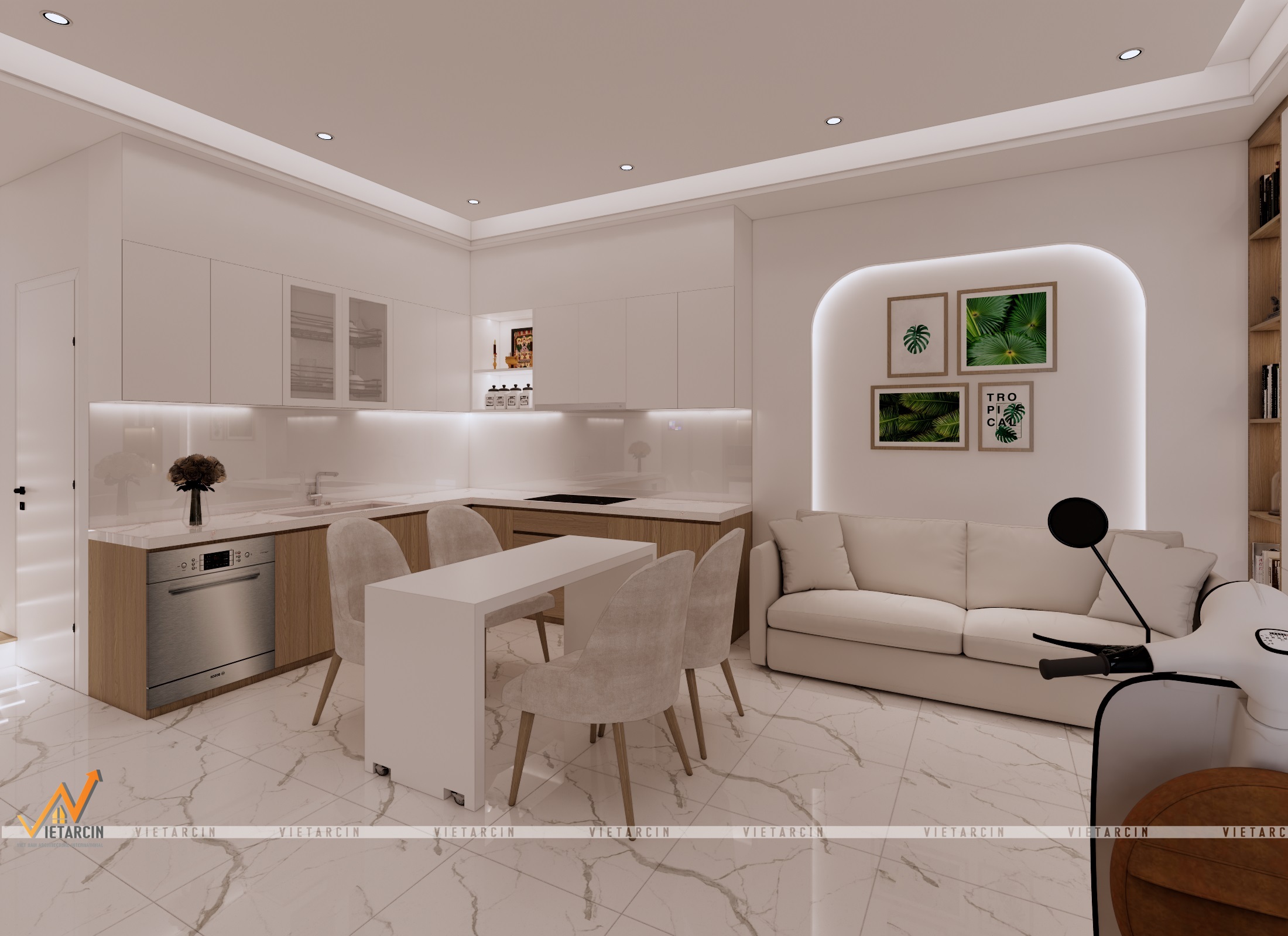 - Sử dụng vật liệu cao cấp & Màu sắc: Chúng tôi thay thế nền gạch cũ bằng gạch vân đá marble trắng sang trọng cho sàn nhà, tạo sự phản chiếu ánh sáng tuyệt vời. Tone màu chủ đạo là trắng kết hợp với gỗ công nghiệp màu nâu ấm.