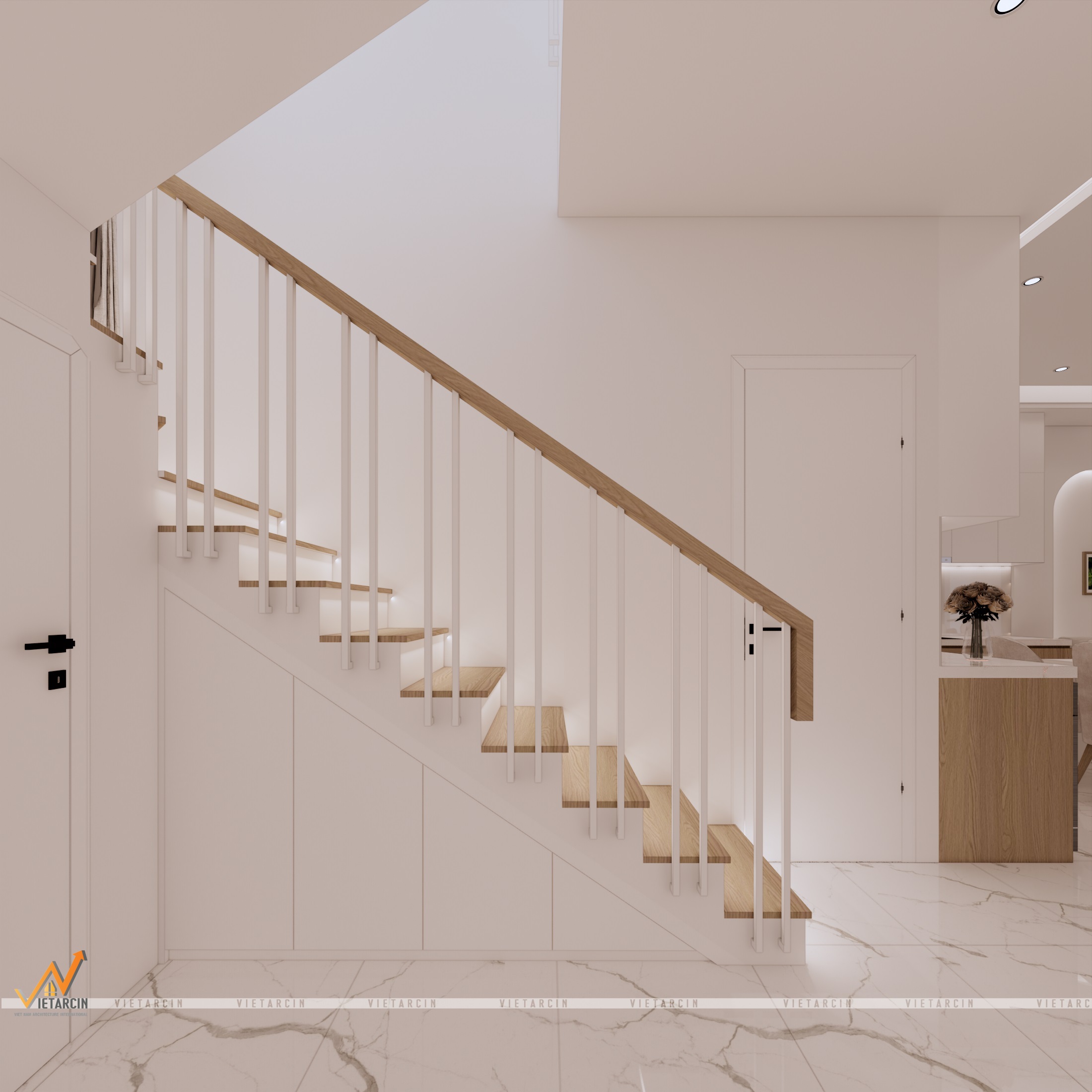 - Tận dụng góc chết: Khi dời cầu thang về cuối nhà, chúng tôi không để phí bất kỳ centimet nào. Hệ tủ gầm cầu thang (Hình 11) được thiết kế phẳng mặt, tiệp màu với tường để lưu trữ những vật dụng ít dùng, giúp ngôi nhà luôn ngăn nắp.