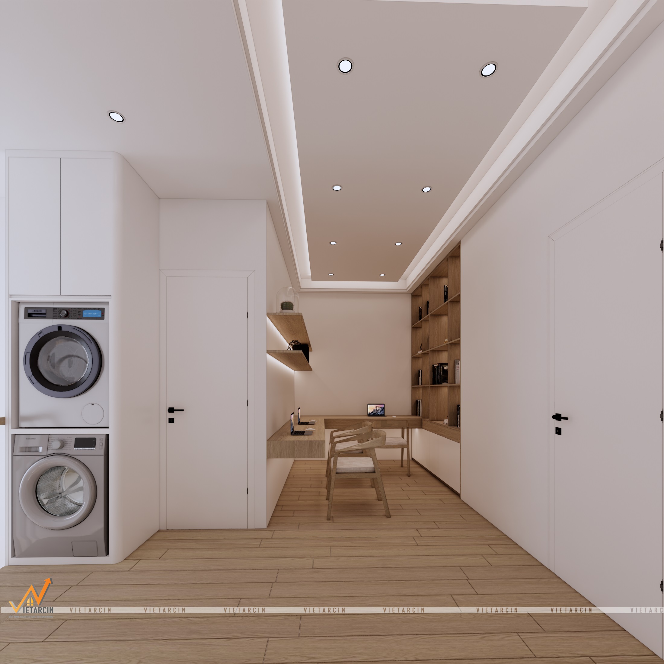 - Tận dụng hành lang làm khu giặt sấy: Một giải pháp cực kỳ thông minh của Vaidecor là đưa hệ máy giặt – sấy chồng tầng vào một hốc tủ phẳng mặt tại khu vực sảnh tầng (Hình 13, 16). Điều này giúp giải phóng hoàn toàn diện tích cho nhà vệ sinh và khu vực ban công, giữ cho ngôi nhà luôn gọn gàng như một khách sạn 5 sao.