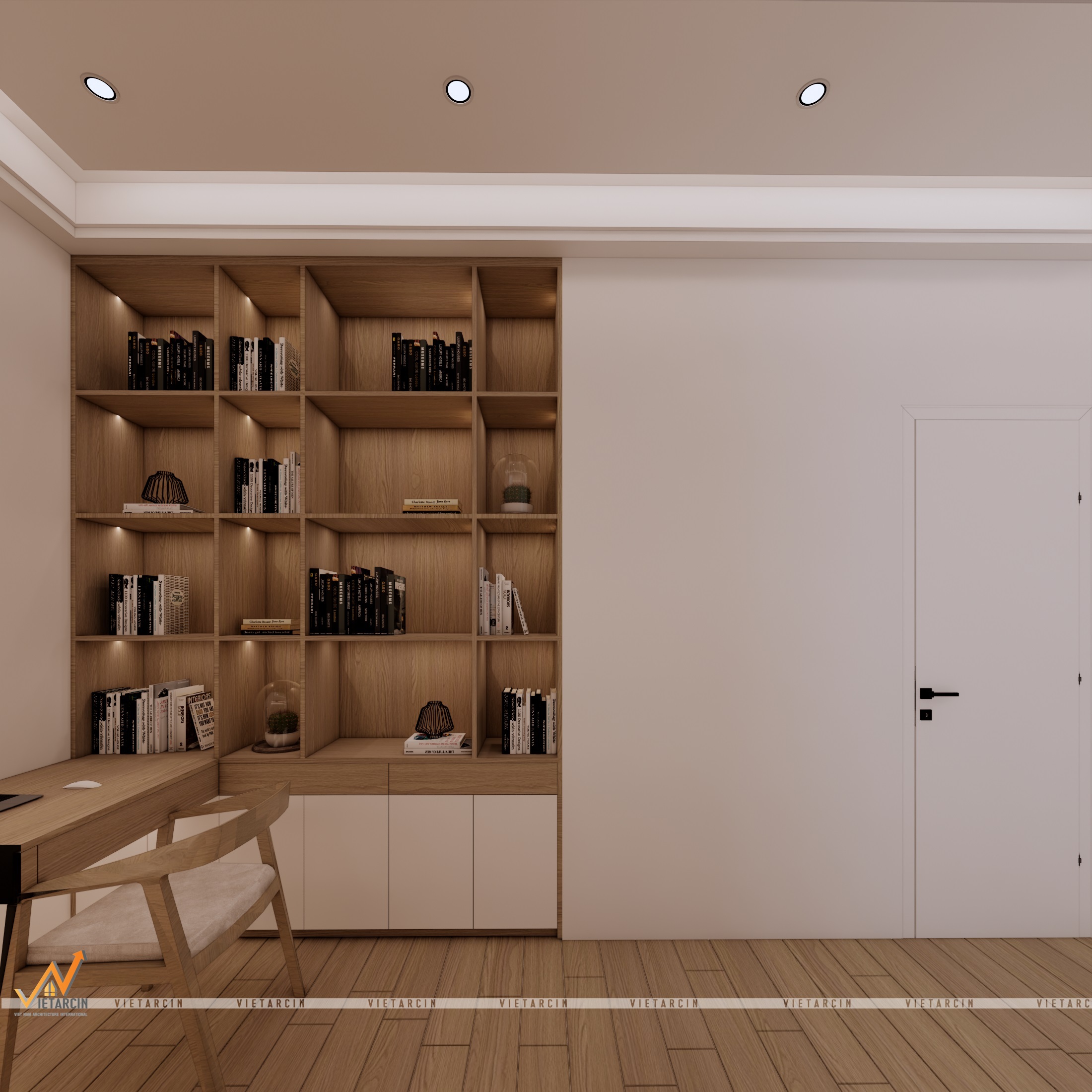 - Thư viện tại gia: Hệ tủ sách kịch trần với các ngăn chia linh hoạt được tích hợp đèn LED âm tủ. Đây không chỉ là nơi lưu trữ tài liệu mà còn là “back-ground” lý tưởng cho các cuộc họp online của anh Tiến.