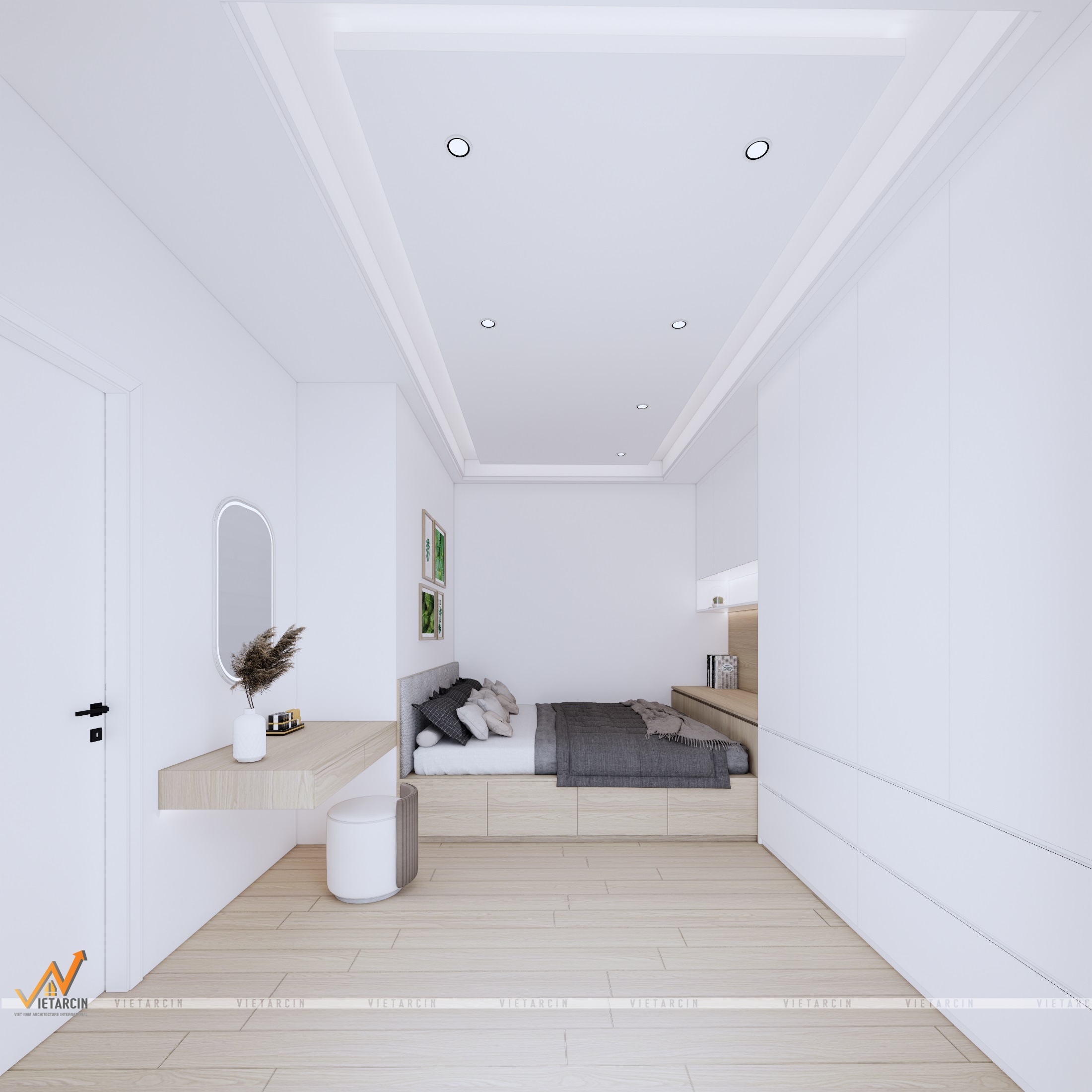 - Hệ tủ quần áo kịch trần: Tủ áo được thiết kế cánh phẳng, màu trắng đồng nhất với màu tường, tạo cảm giác như một bức tường phẳng, giúp căn phòng không bị cảm giác chật chội bởi nội thất.