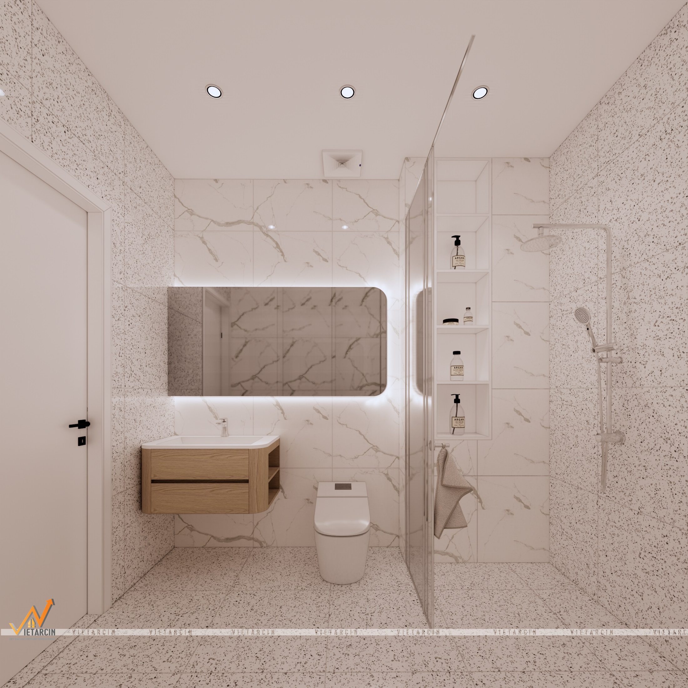 - Vật liệu hiện đại: Chúng tôi sử dụng gạch Terrazzo hạt mịn cho sàn và gạch vân đá Marble trắng cho tường, tạo nên vẻ đẹp vượt thời gian và cảm giác sạch sẽ.