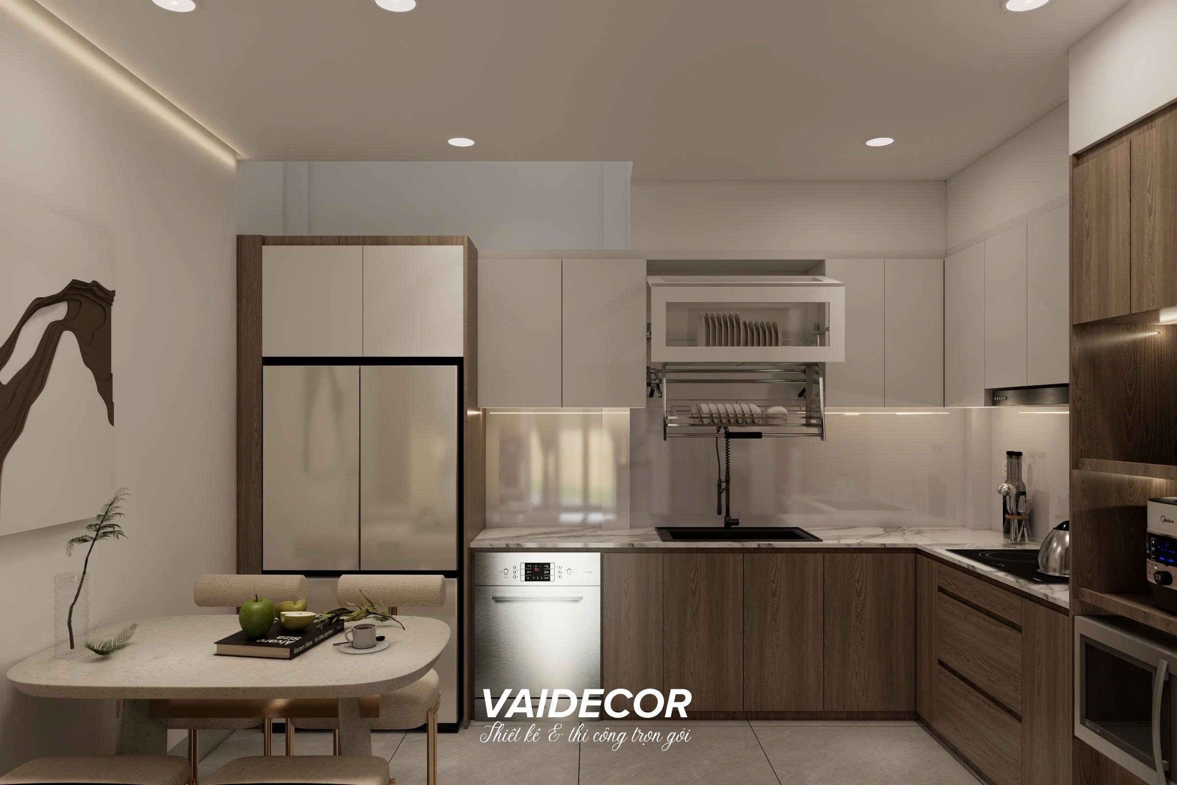 - Đồng bộ hóa thiết bị: Tủ lạnh, lò nướng, máy rửa bát đều được thiết kế âm tủ hoặc có khoang chứa vừa vặn, tạo nên một bề mặt phẳng liền mạch, hiện đại và vô cùng sạch sẽ.