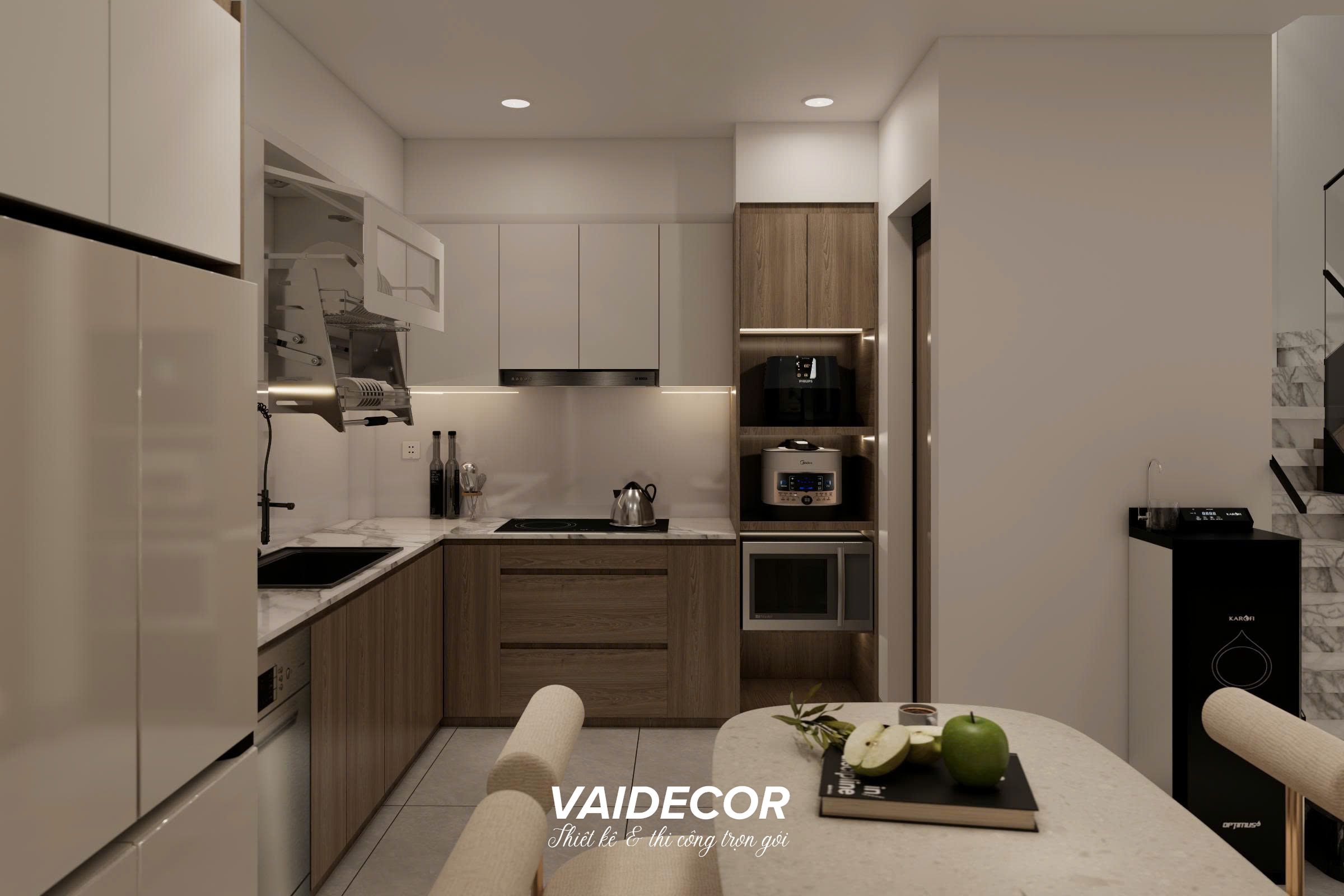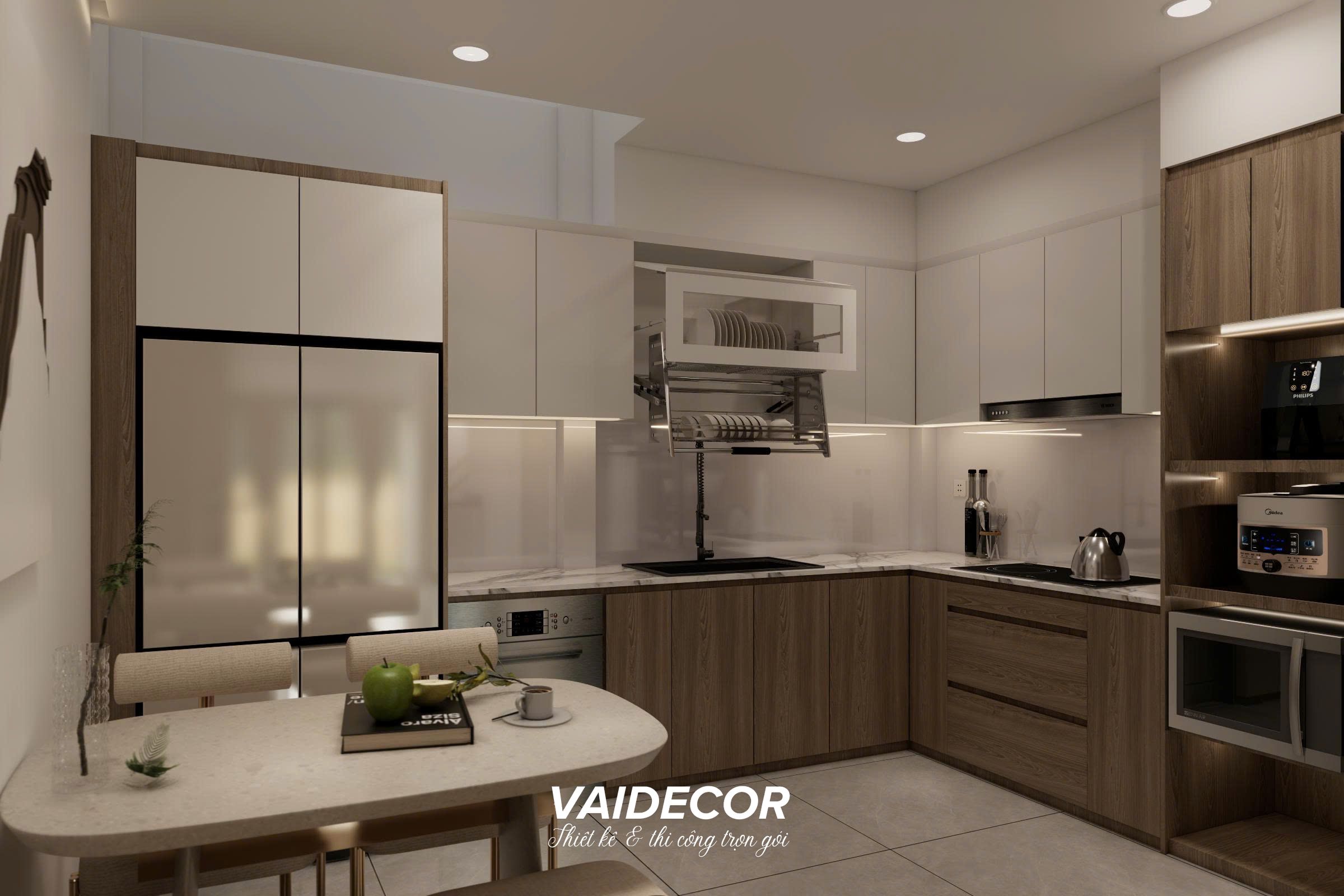 - Tối ưu lưu trữ với tủ kịch trần: Hệ tủ bếp trên được thiết kế cao đụng trần, phối hợp màu trắng bóng để phản xạ ánh sáng, giúp bếp trông rộng hơn. Tủ dưới dùng vân gỗ đồng bộ với tổng thể nhà để giữ cảm giác ấm áp, chống bám bẩn tốt.