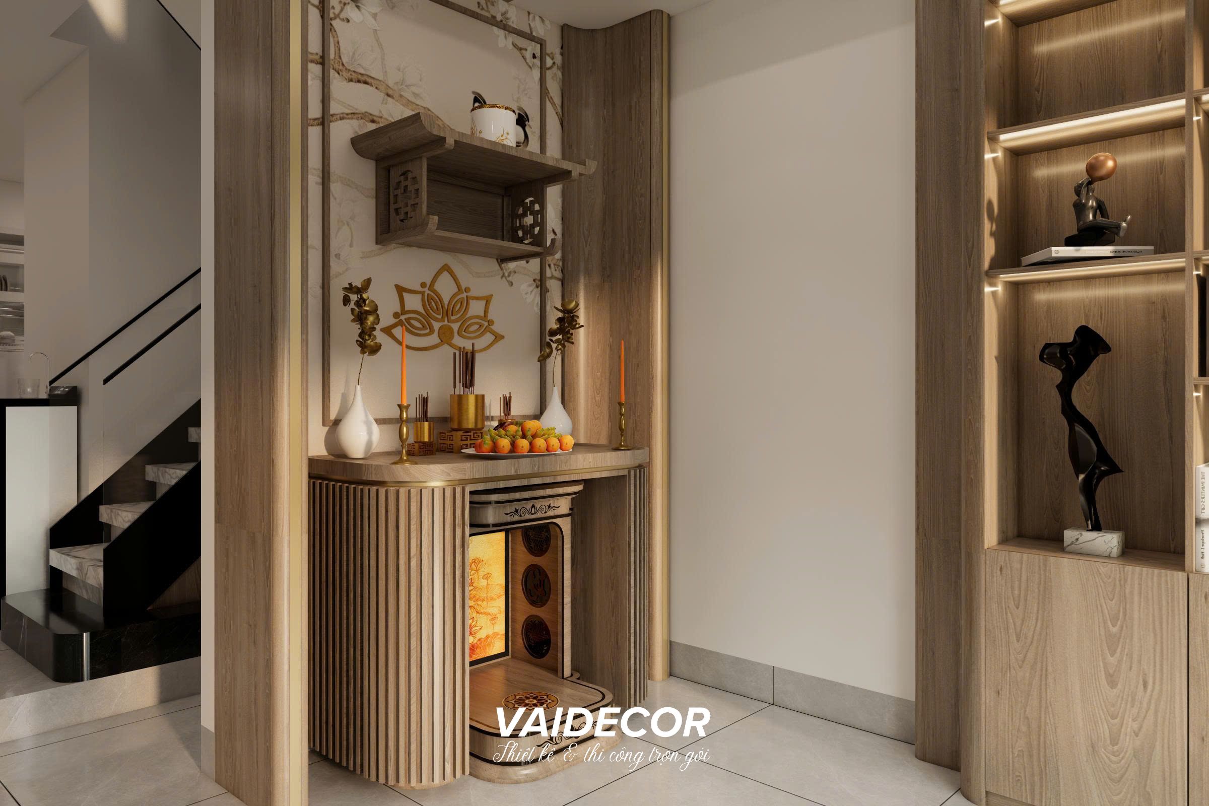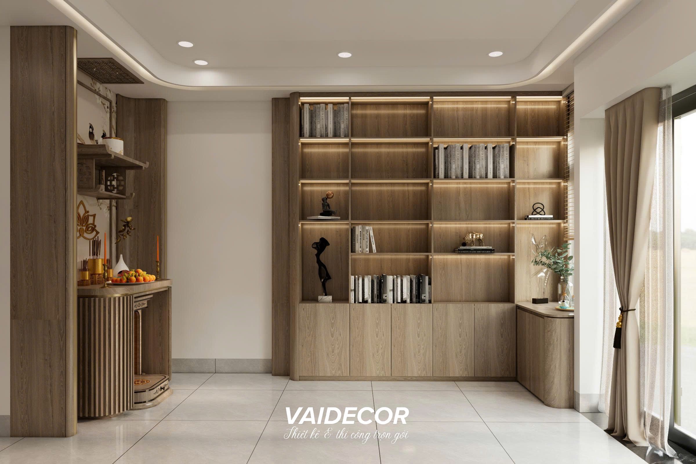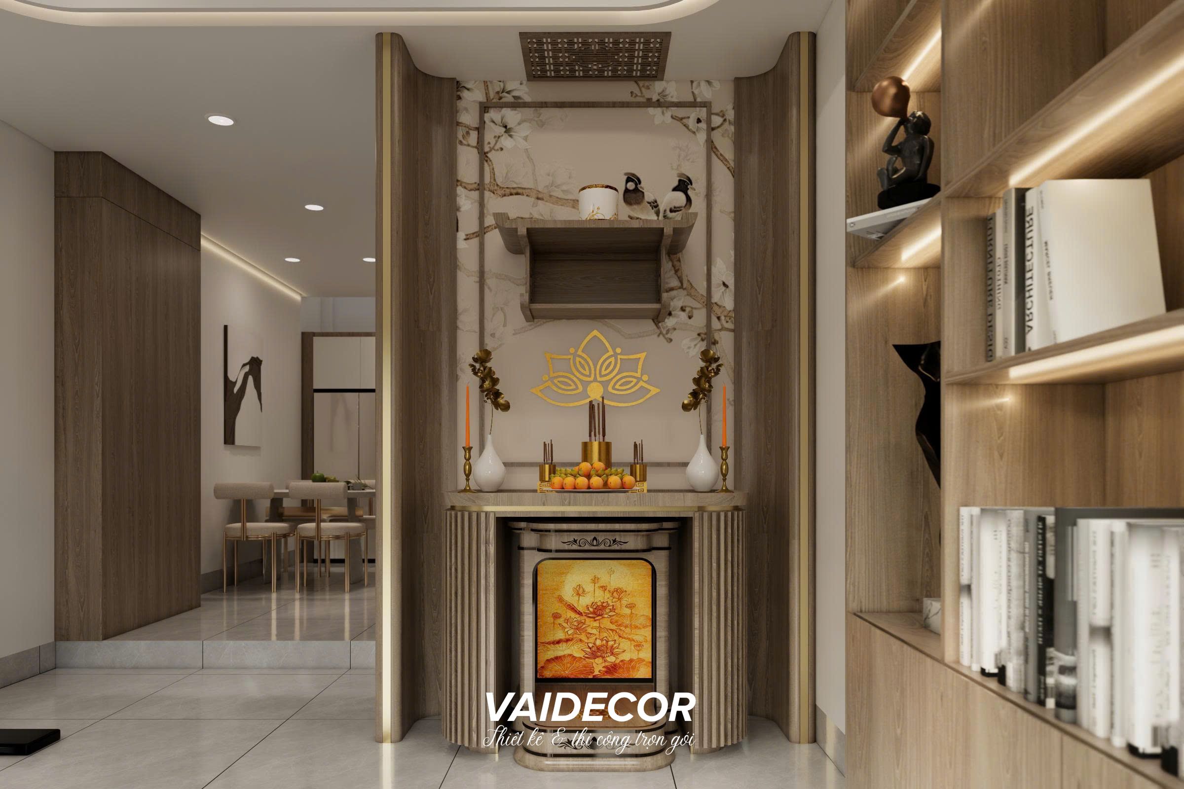 - Góc tâm linh (Tĩnh): Bàn thờ gia tiên được đặt trang trọng ngay cạnh hệ kệ sách. Để giữ sự tôn nghiêm mà không phá vỡ nét Hiện Đại, tôi thiết kế một hệ vách CNC họa tiết hoa sen mạ vàng làm phông nền, kết hợp vách lam gỗ bo góc mềm mại hai bên. Bàn thờ đứng được đặt vừa vặn vào khoảng lõm, tạo cảm giác bề thế nhưng vô cùng gọn gàng, không lấn chiếm lối đi.