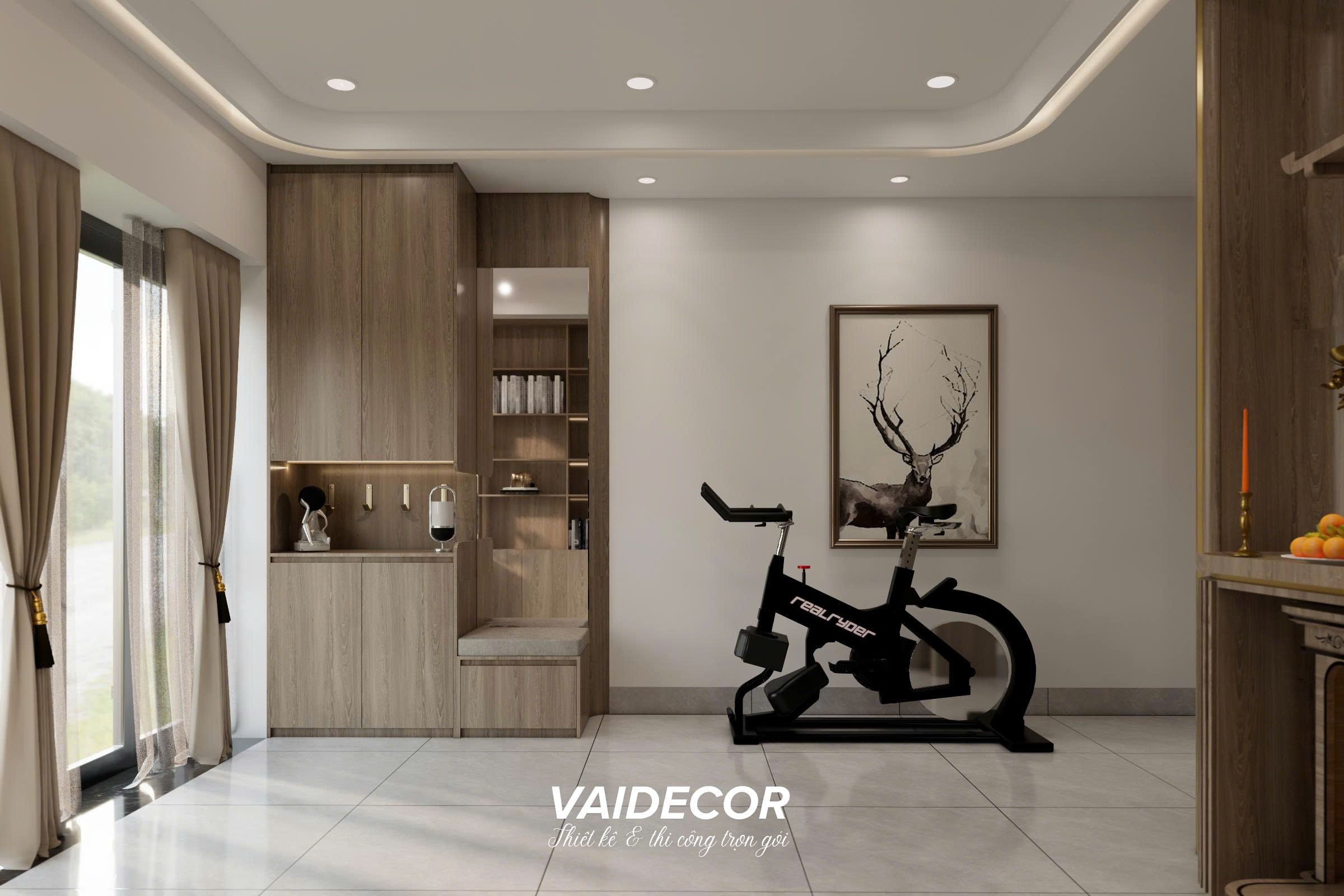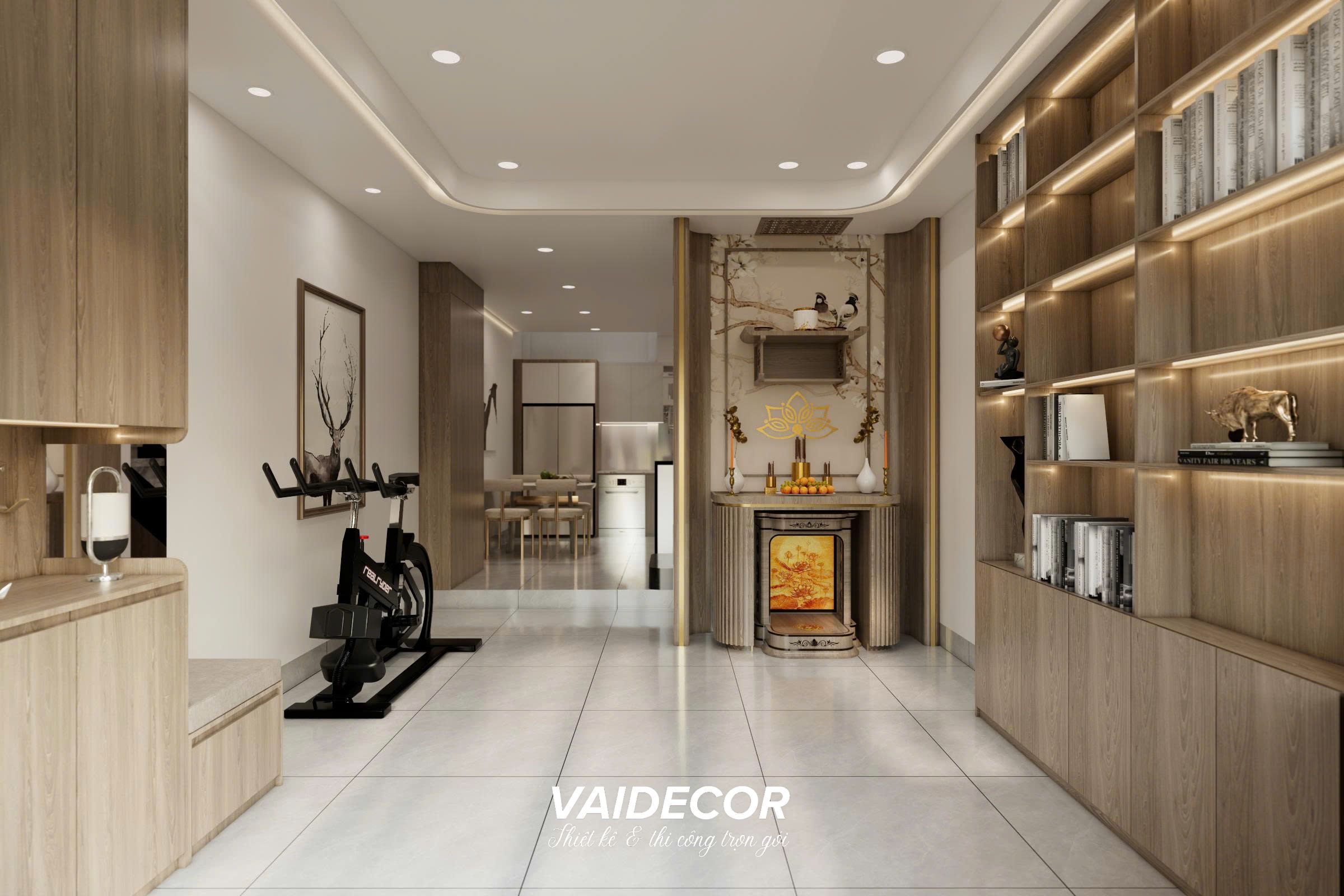 - Thiết kế không gian mở đa năng tại tầng trệt: Xóa bỏ ranh giới giữa các phòng. Khu vực sinh hoạt chung là sự hòa quyện liền mạch giữa gian bếp hiện đại và không gian tập luyện thể thao. Đặc biệt, bàn thờ gia tiên được chúng tôi tích hợp vách CNC mạ vàng kết hợp ánh sáng hắt, đặt gọn gàng trong hệ tủ kệ trang trí bằng gỗ óc chó kịch trần. Cách làm này vừa tôn lên vẻ trang nghiêm, vừa tạo điểm nhấn kiến trúc Á Đông cực kỳ sang trọng.