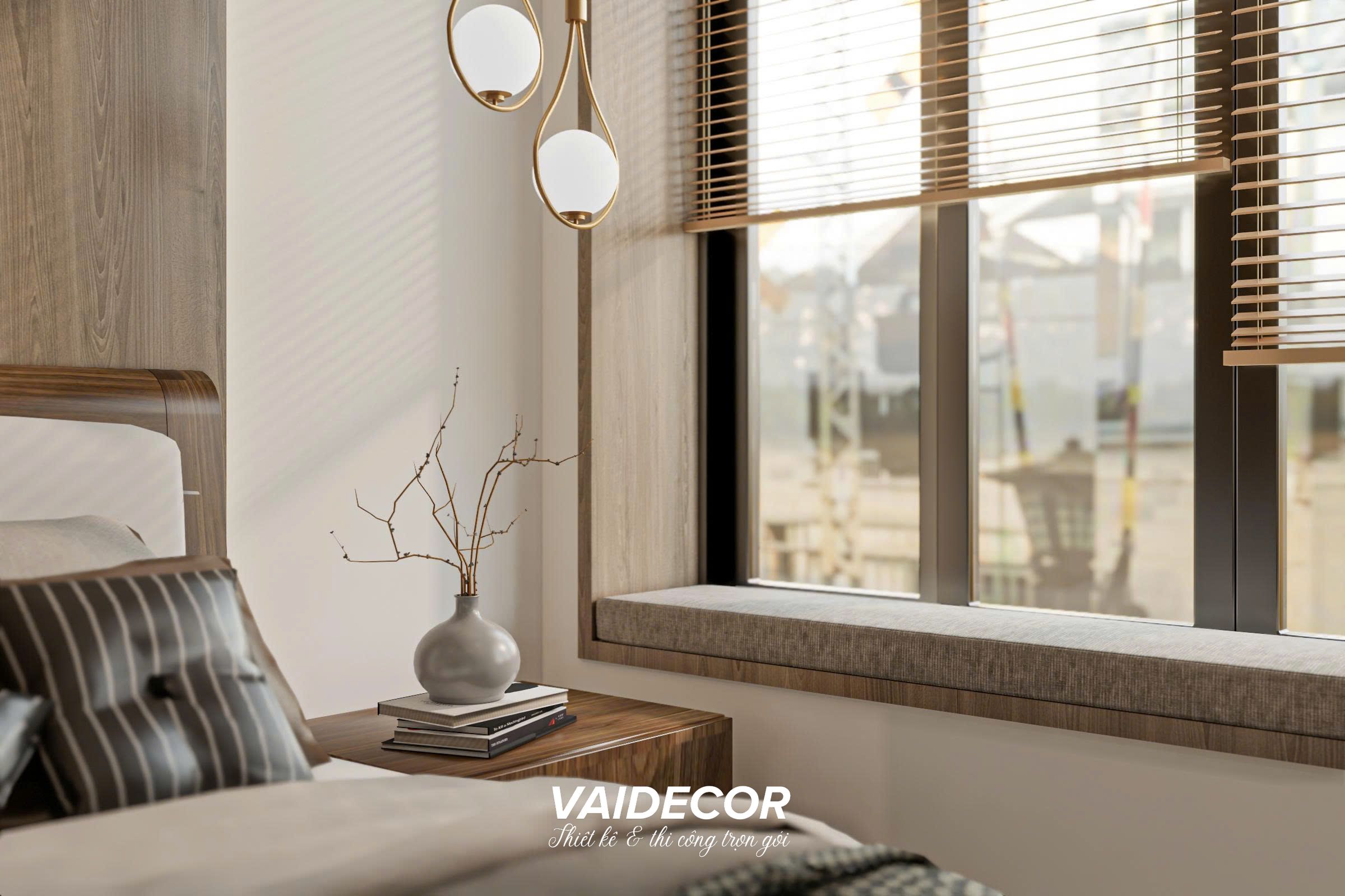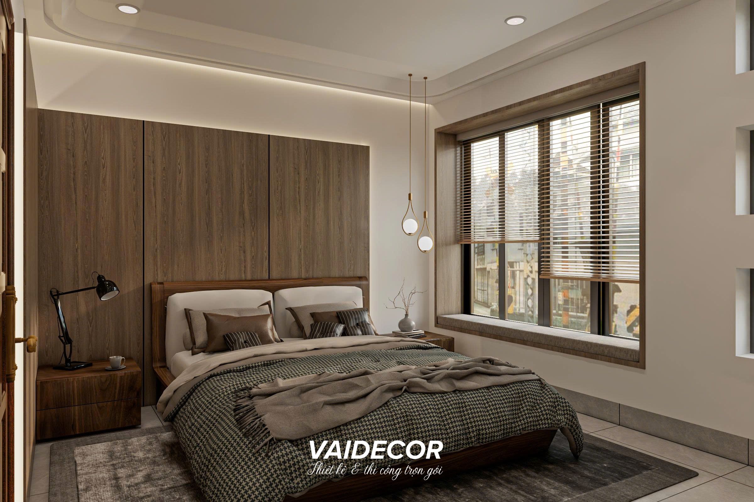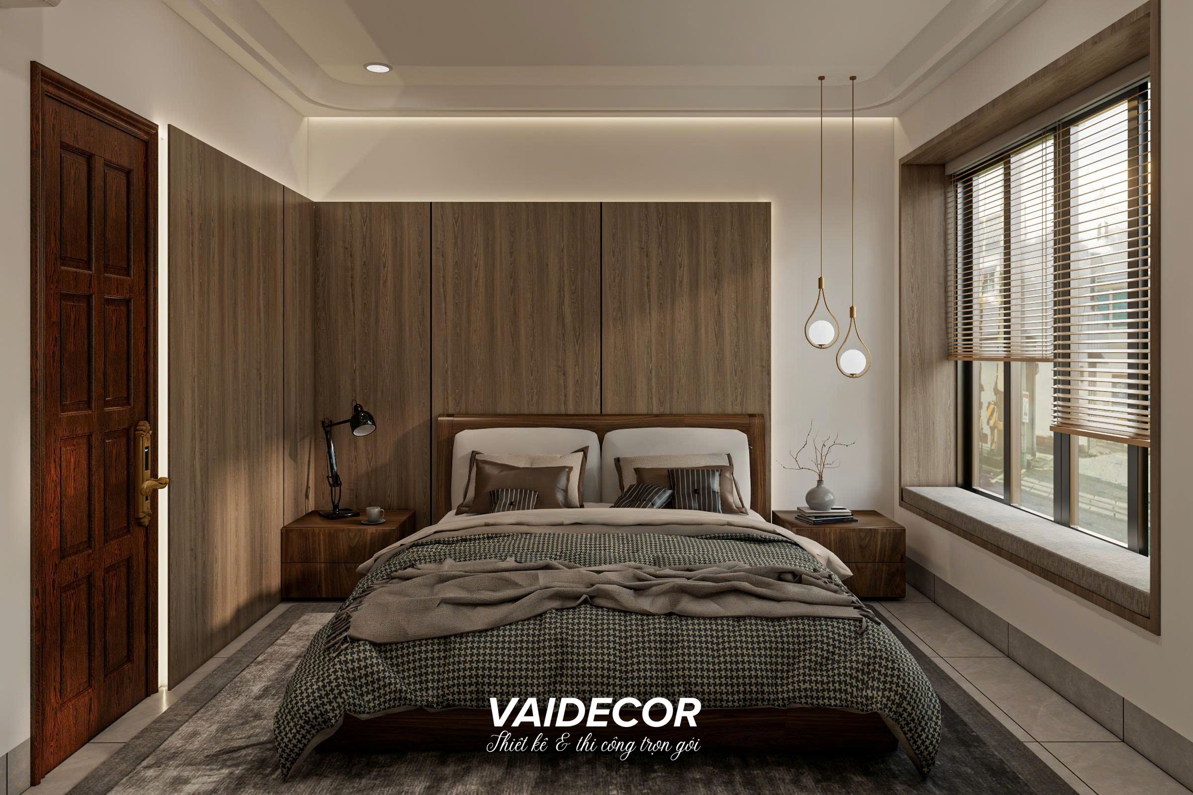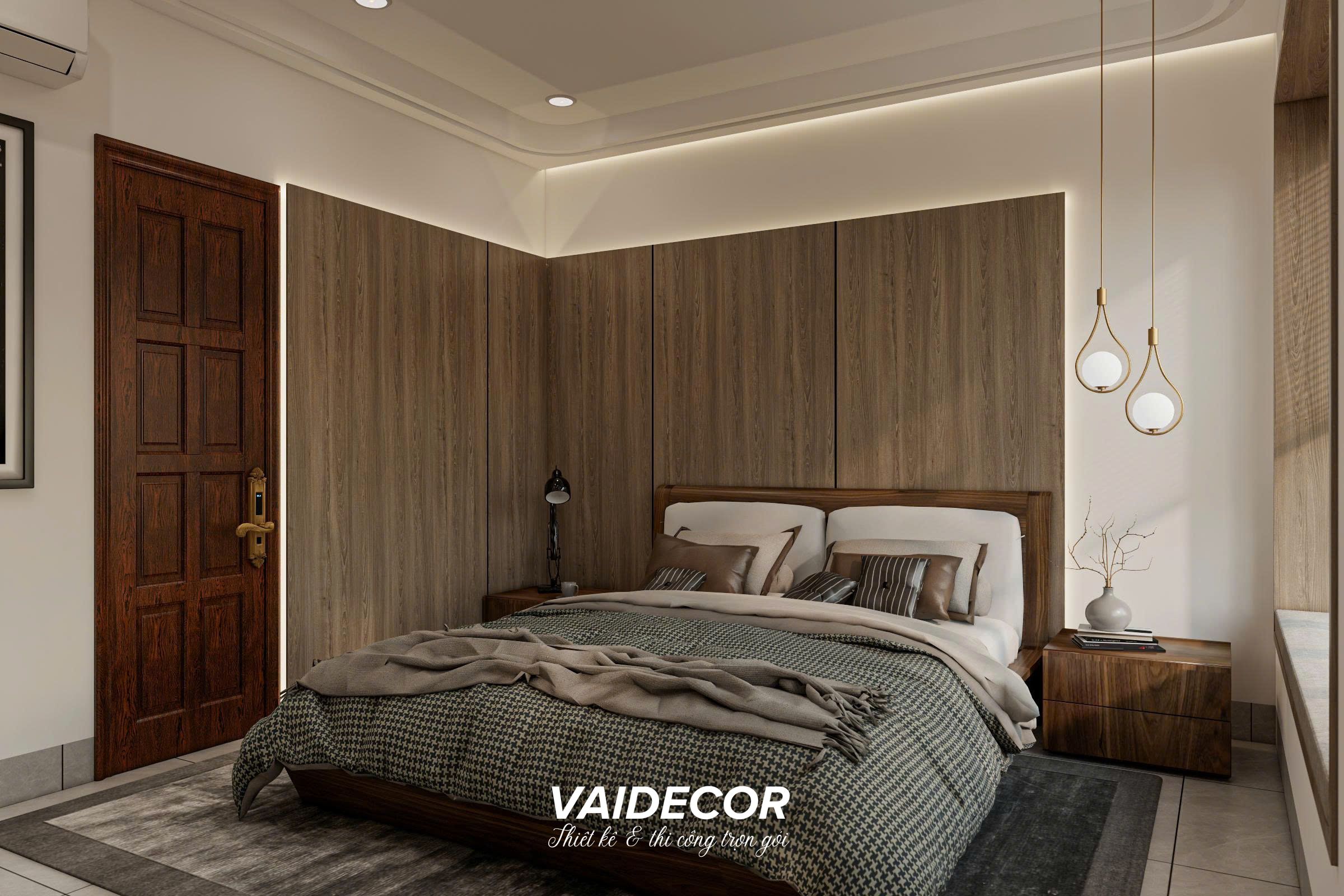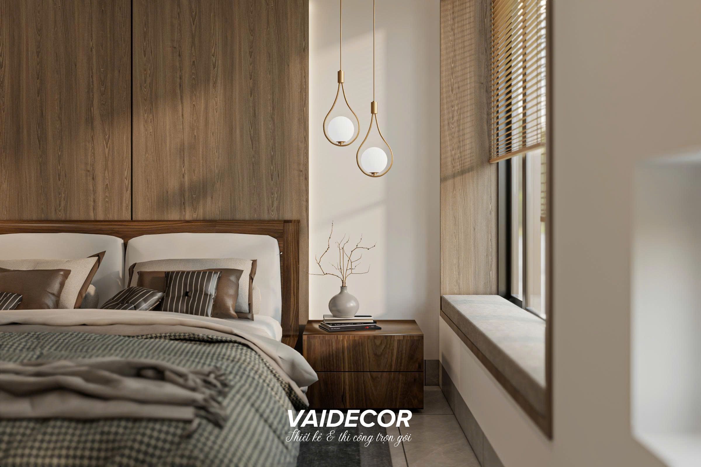 - Hệ vách ốp đầu giường liền khối: Thay vì để những mảng tường sơn trống trải, tôi sử dụng hệ vách ốp gỗ công nghiệp đan xen các đường ron tinh tế chạy dọc toàn bộ mảng tường đầu giường. Giải pháp này giúp đánh lừa thị giác, làm trần nhà có vẻ cao hơn và tạo ra một phông nền cực kỳ sang trọng cho chiếc giường bọc nệm êm ái. Đèn thả trần với thiết kế vòng kim loại mạ vàng tạo điểm nhấn Á Đông nhẹ nhàng, thanh lịch.