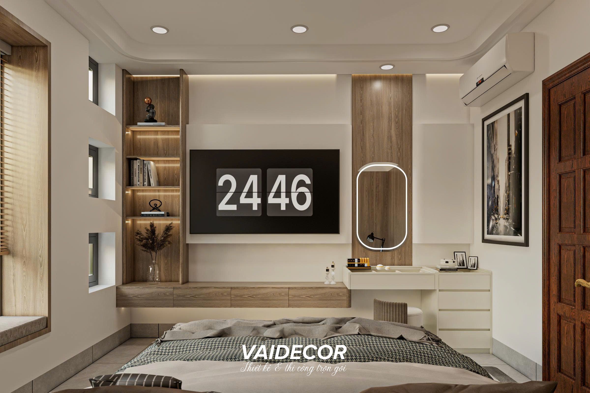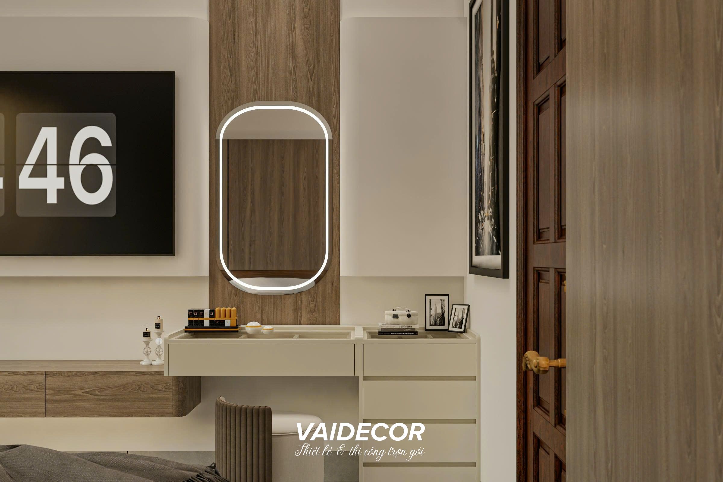 - Hệ nội thất đa năng: Điểm nhấn thông minh nhất của căn phòng nằm ở vách tường đối diện. Tôi đã thiết kế một hệ thống liên hoàn bao gồm: Kệ tivi treo tường kéo dài liền mạch sang bàn trang điểm, kết hợp cùng hệ kệ trưng bày đụng trần. Gương trang điểm hình oval với viền LED hắt sáng mềm mại đã phá vỡ sự cứng nhắc của các đường nét vuông vức.