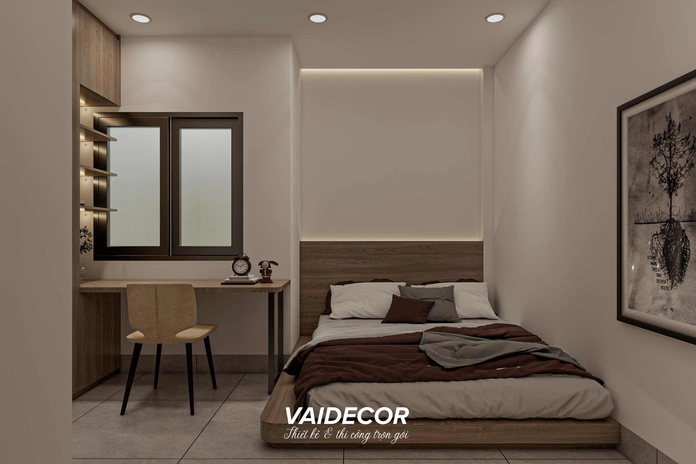 Phòng ngủ phía sau có diện tích khiêm tốn hơn hẳn, đặt ra thách thức lớn về việc phải bố trí đầy đủ giường, tủ, bàn làm việc và kệ tivi mà không gây ngột ngạt. Tại đây, giải pháp sử dụng nội thất thông minh & đồng bộ đã phát huy tối đa sức mạnh.