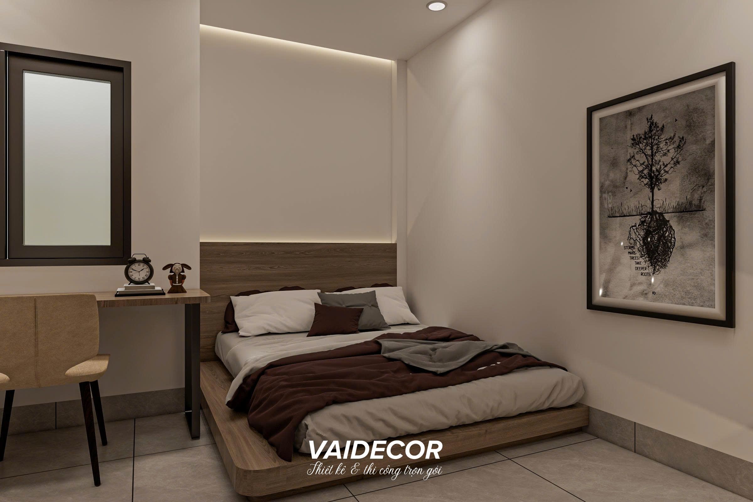 - Giường ngủ dạng bục: Đây là “vũ khí bí mật” cho các căn phòng nhỏ. Thay vì mua một chiếc giường bán sẵn, tôi thiết kế một hệ bục gỗ nâng cao so với mặt sàn. Bục này vừa làm khung giường vững chãi, vừa tích hợp các ngăn kéo chứa đồ khổng lồ bên dưới. Việc hạ thấp trọng tâm của giường cũng giúp trần nhà trông thoáng đãng hơn.