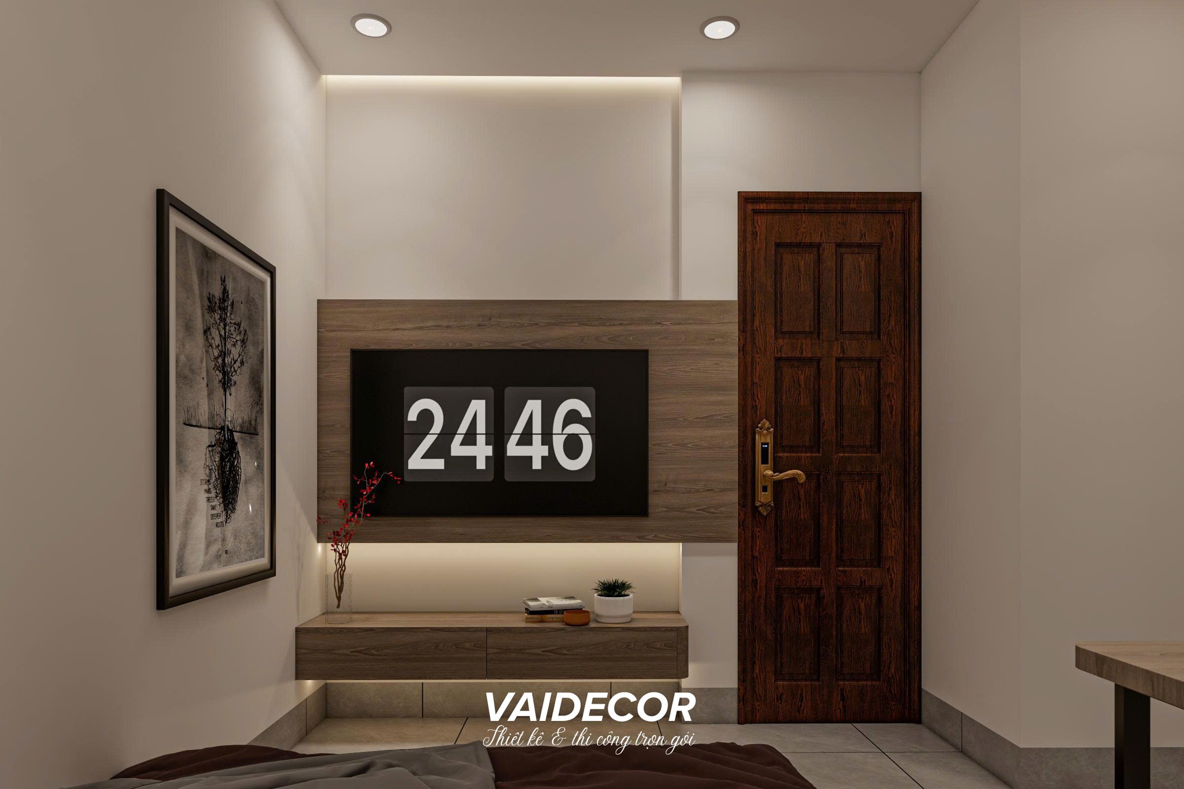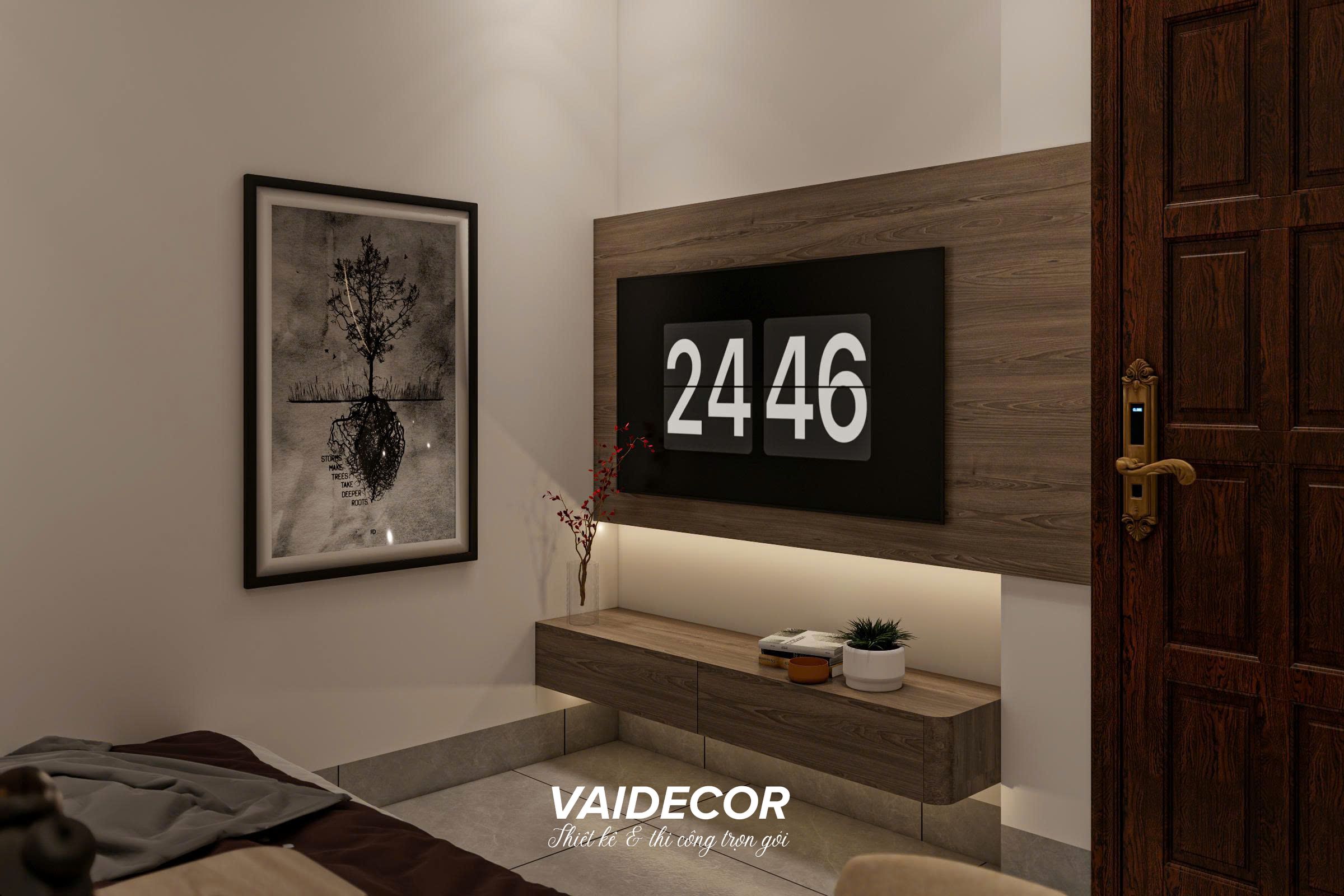 - Tối giản vách tivi: Đối diện giường ngủ, kệ tivi được làm dạng treo tường siêu mỏng trên nền vách ốp gỗ, đảm bảo lối đi lại luôn thông thoáng mà vẫn đáp ứng nhu cầu giải trí. Bức tranh nghệ thuật đen trắng với họa tiết cây cổ thụ rễ bám sâu mang lại tính nghệ thuật và chiều sâu cho căn phòng.