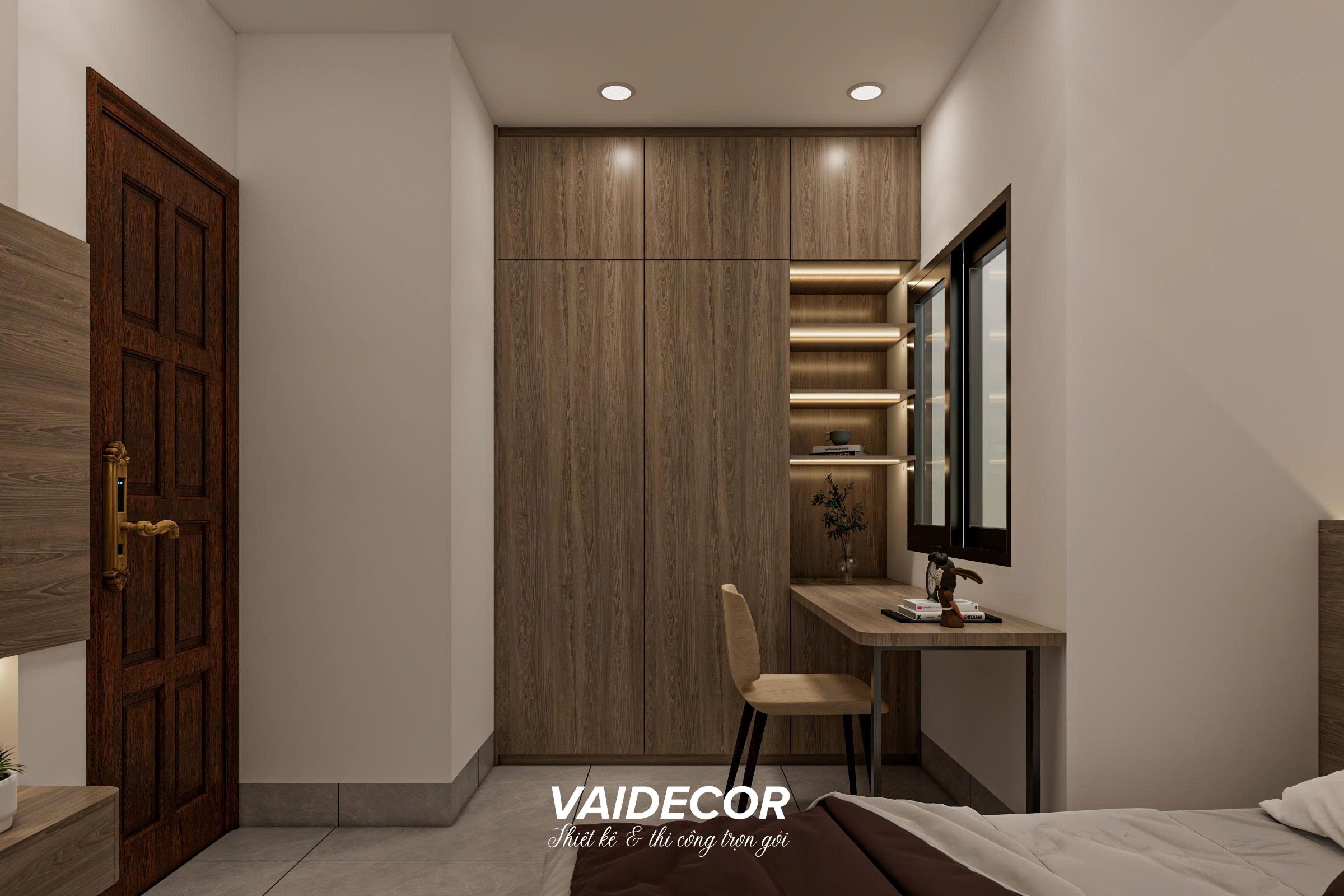 - Hệ tủ áo – bàn làm việc liền kề: Tủ quần áo đụng trần được bố trí áp sát góc tường, nối liền mạch với một chiếc bàn làm việc/bàn học treo tường thanh mảnh. Ngay trong khoang tủ áo, tôi khoét một hệ kệ hở có đèn LED để sách hoặc đồ trang trí. Cách thiết kế “vay mượn không gian” này giúp tiết kiệm diện tích tối đa.
