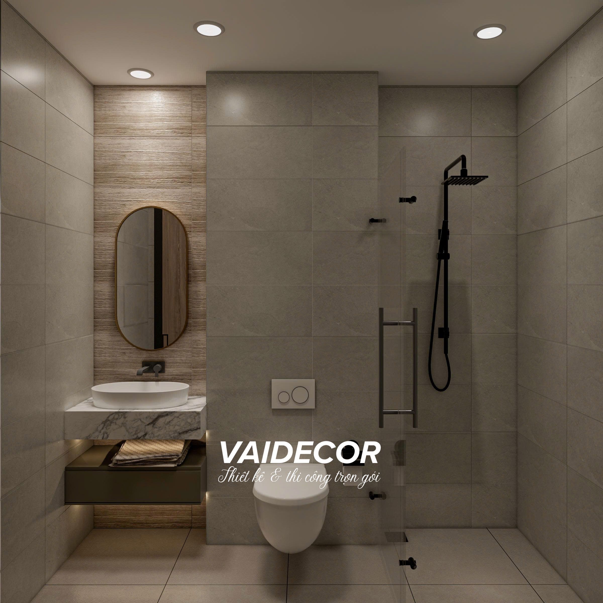 Nằm ở vị trí trung tâm, phòng vệ sinh được tối ưu hóa từng centimet. Mặc dù diện tích không quá lớn, chúng tôi vẫn phân chia rõ khu vực khô – ướt bằng vách kính cường lực. Gạch ốp tường khổ lớn màu xám xi măng kết hợp cùng lavabo đặt bàn trên bệ đá vân mây treo tường giúp không gian này luôn sạch sẽ, hiện đại và rất dễ lau chùi.