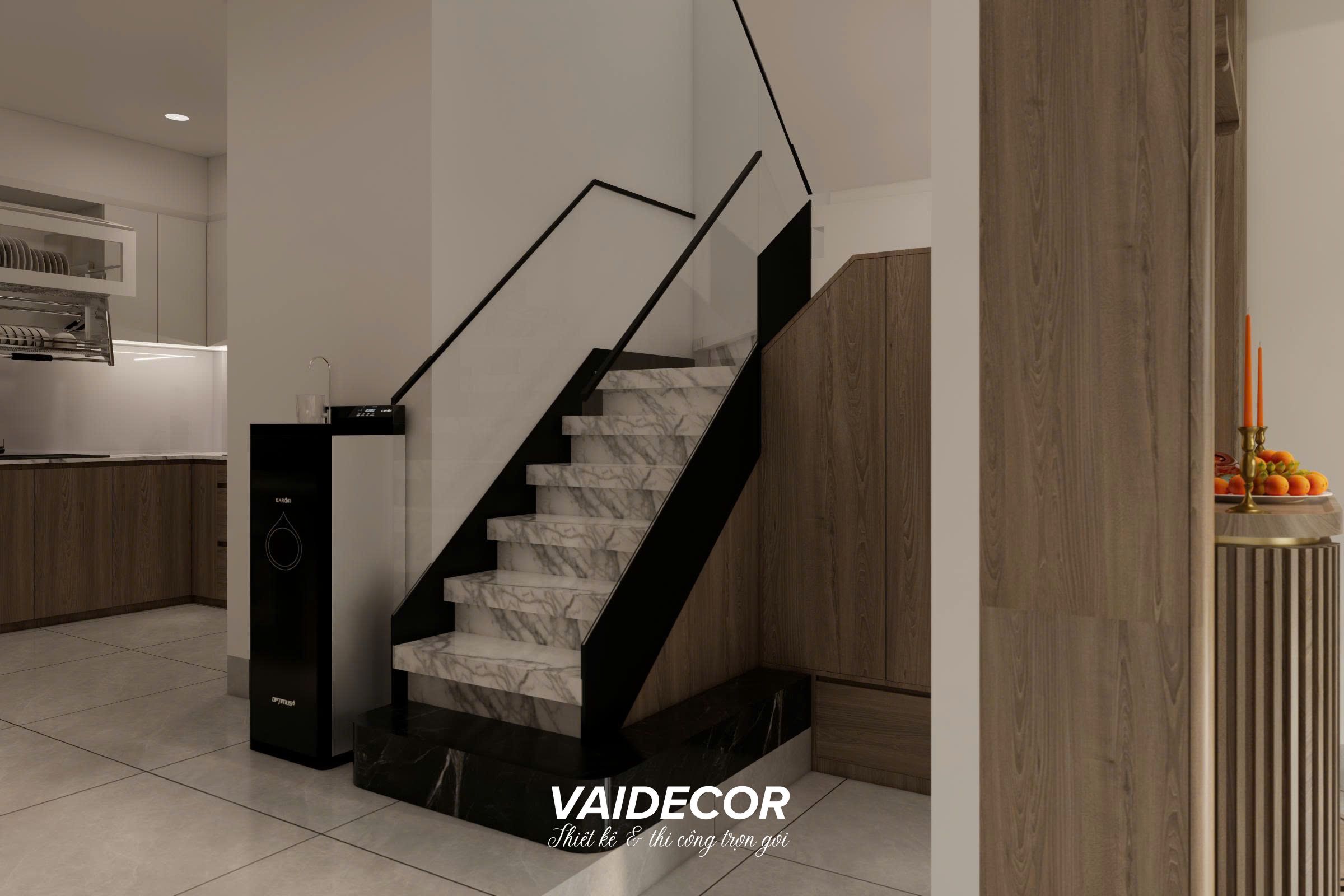- Hệ cầu thang “tàng hình”: Như đã đề cập ở phần trước, cầu thang gỗ ziczac cũ kỹ đã bị loại bỏ. Thay vào đó là những bậc thang ốp đá khối trắng vân mây, kết hợp lan can kính cường lực trong suốt và tay vịn thép hộp đen nhám mảnh mai. Thiết kế này cho phép ánh sáng thị giác đi xuyên qua, khiến khu vực giữa nhà bừng sáng. Đặc biệt, gầm cầu thang được chúng tôi biến tấu thành các hệ tủ kho cánh phẳng (seamless) tiệp màu với vách gỗ, giúp giấu kín hoàn hảo máy lọc nước và các vật dụng ít dùng.