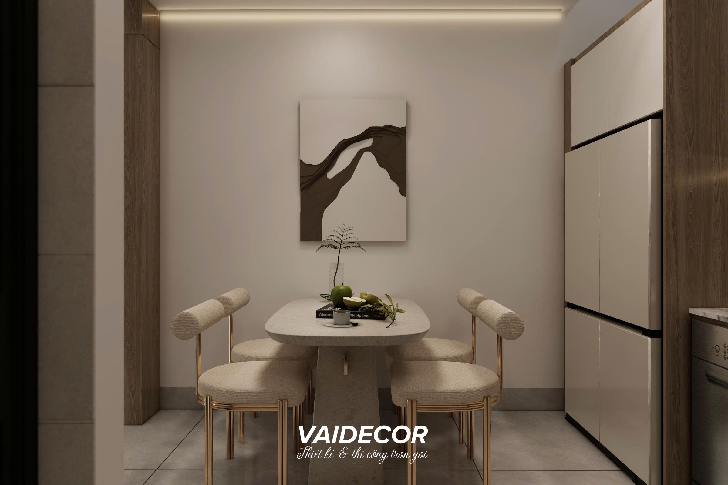 - Bàn ăn tinh tế: Nằm đối diện khu vực cầu thang là bộ bàn ăn 4 ghế với thiết kế bo tròn mềm mại, bọc nỉ cao cấp tông màu beige. Khu vực này đóng vai trò như một vùng đệm hoàn hảo, phân tách nhẹ nhàng không gian sảnh ngoài và gian bếp bên trong mà không làm đứt gãy mạch liên kết.