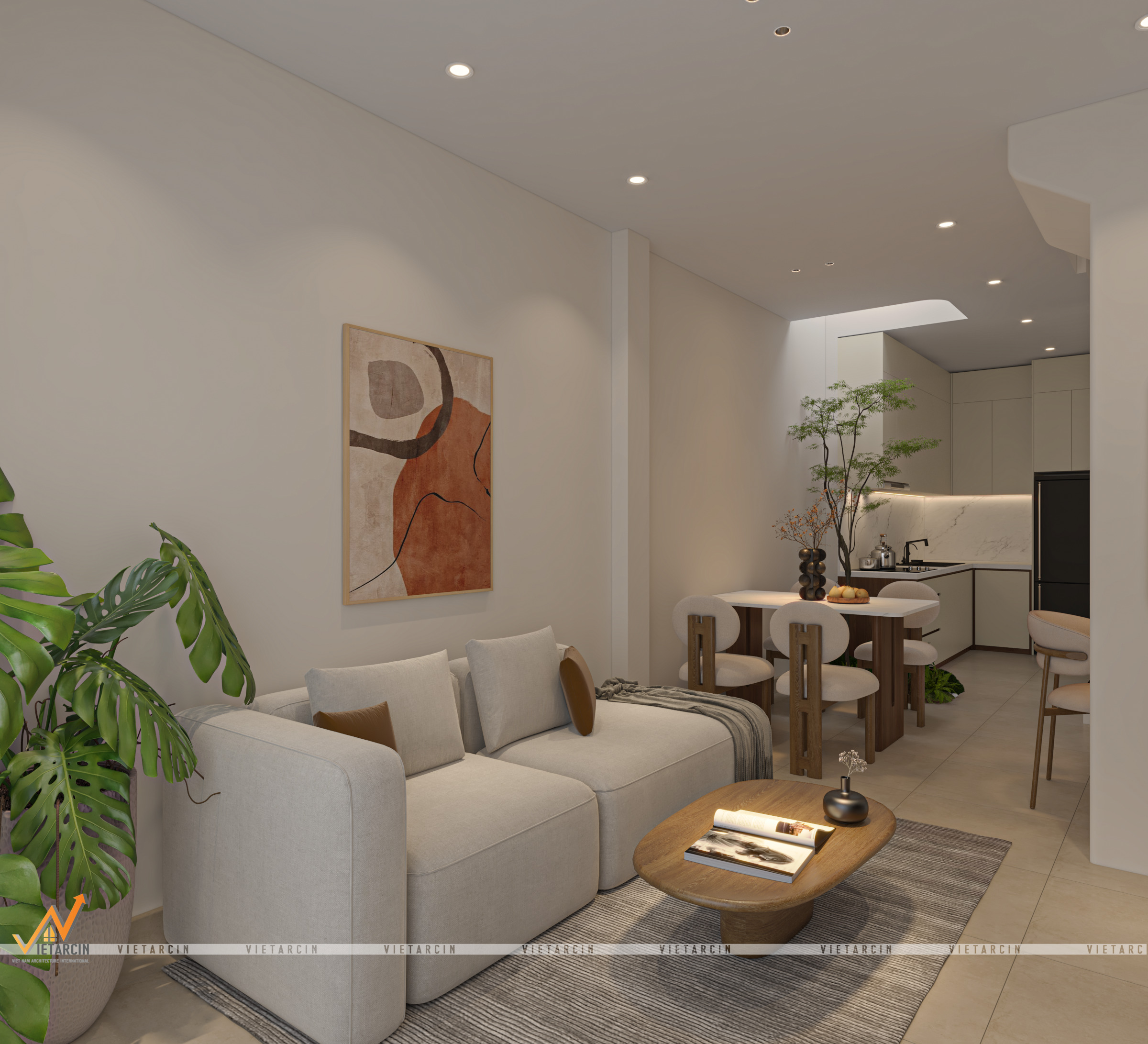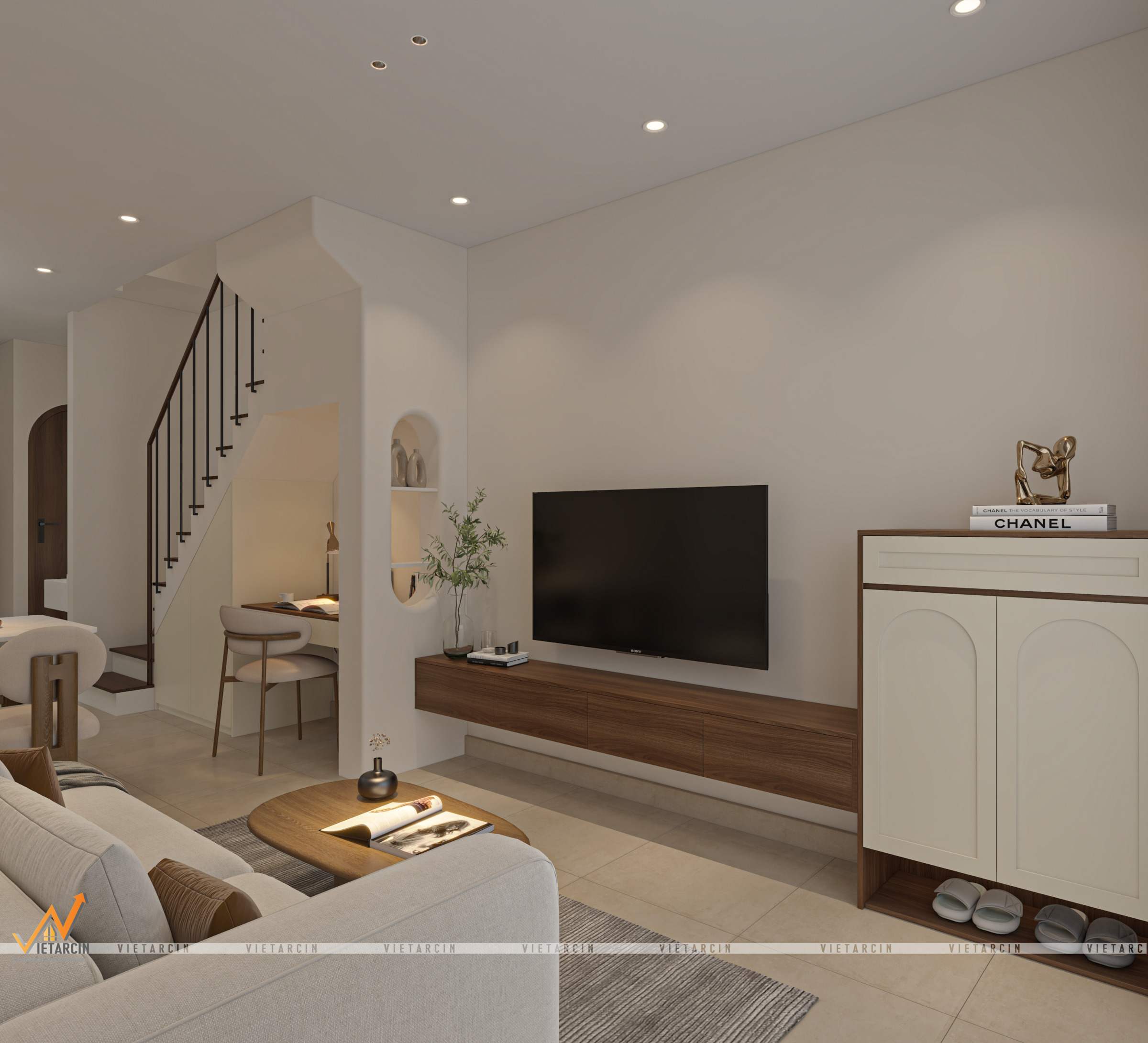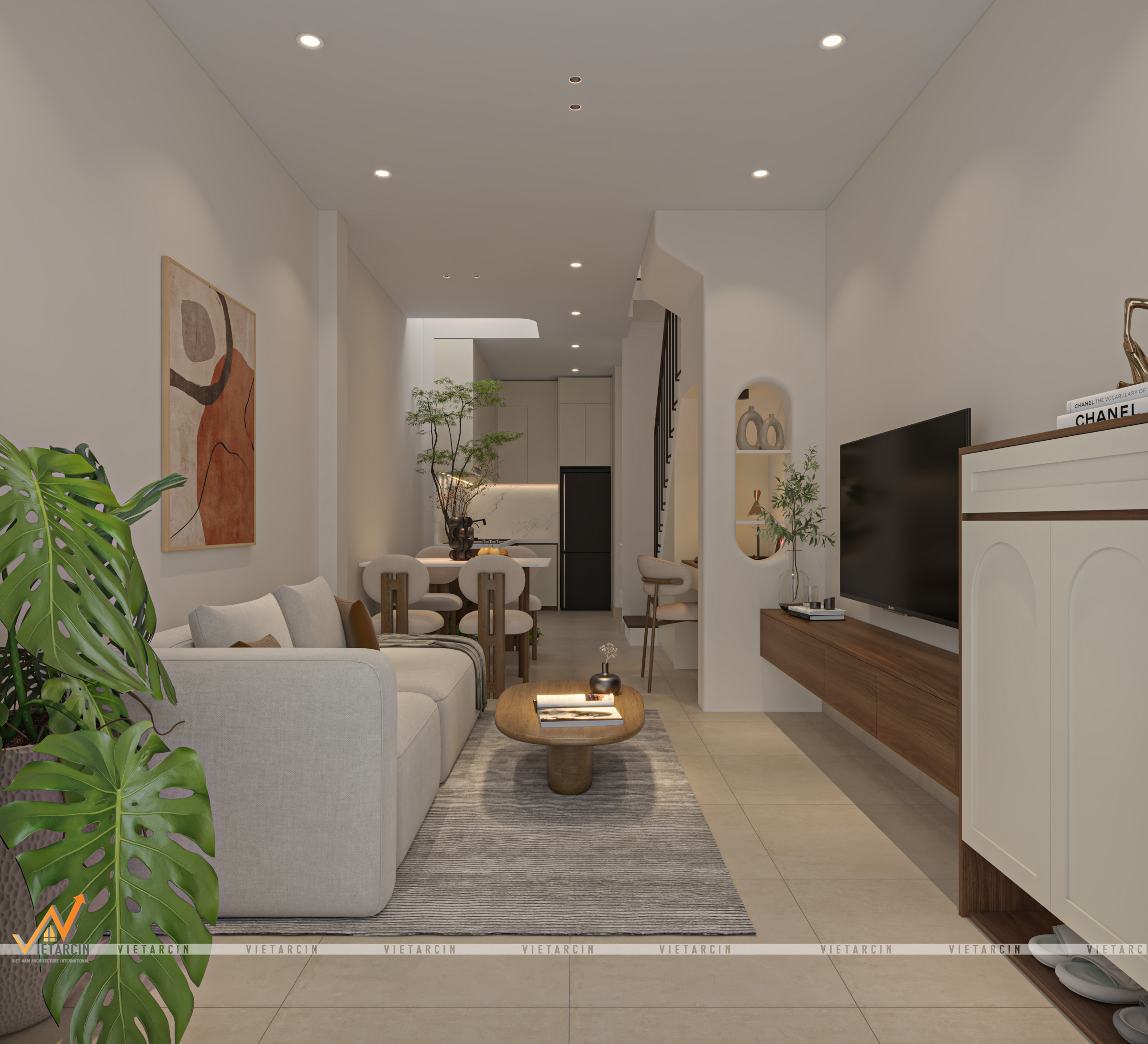 - Ngôn ngữ thiết kế liền mạch: Xuyên suốt ngôi nhà là tông màu trắng, be và màu gỗ sồi ấm áp. Chúng tôi sử dụng các chi tiết vòm cong trên tường và kệ tủ để làm mềm đi sự cứng cáp của nhà phố. Hệ thống đèn LED downlight và đèn hắt âm trần được tính toán kỹ lưỡng, thay thế hoàn toàn bóng tuýp cũ, mang lại chiều sâu và sự sang trọng.