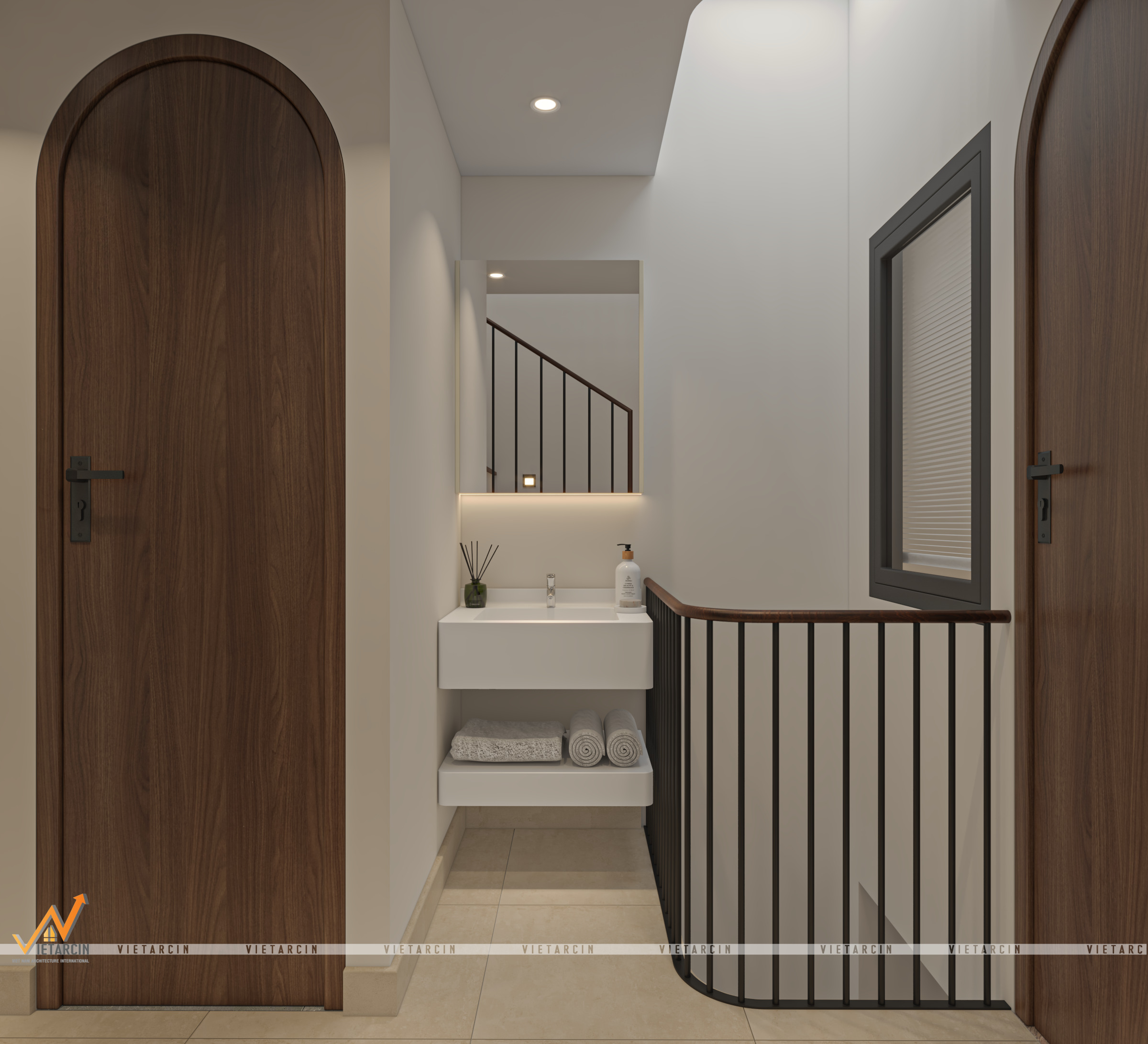 - Tính đồng bộ trong công năng: Khu vực rửa tay với gương tích hợp LED hắt sáng tiếp tục được bố trí bên ngoài sảnh thang, tách biệt với phòng WC (khép kín, ốp gạch xám hiện đại bên trong). Sự nhất quán này tạo nên thói quen sinh hoạt tiện lợi cho cả gia đình.