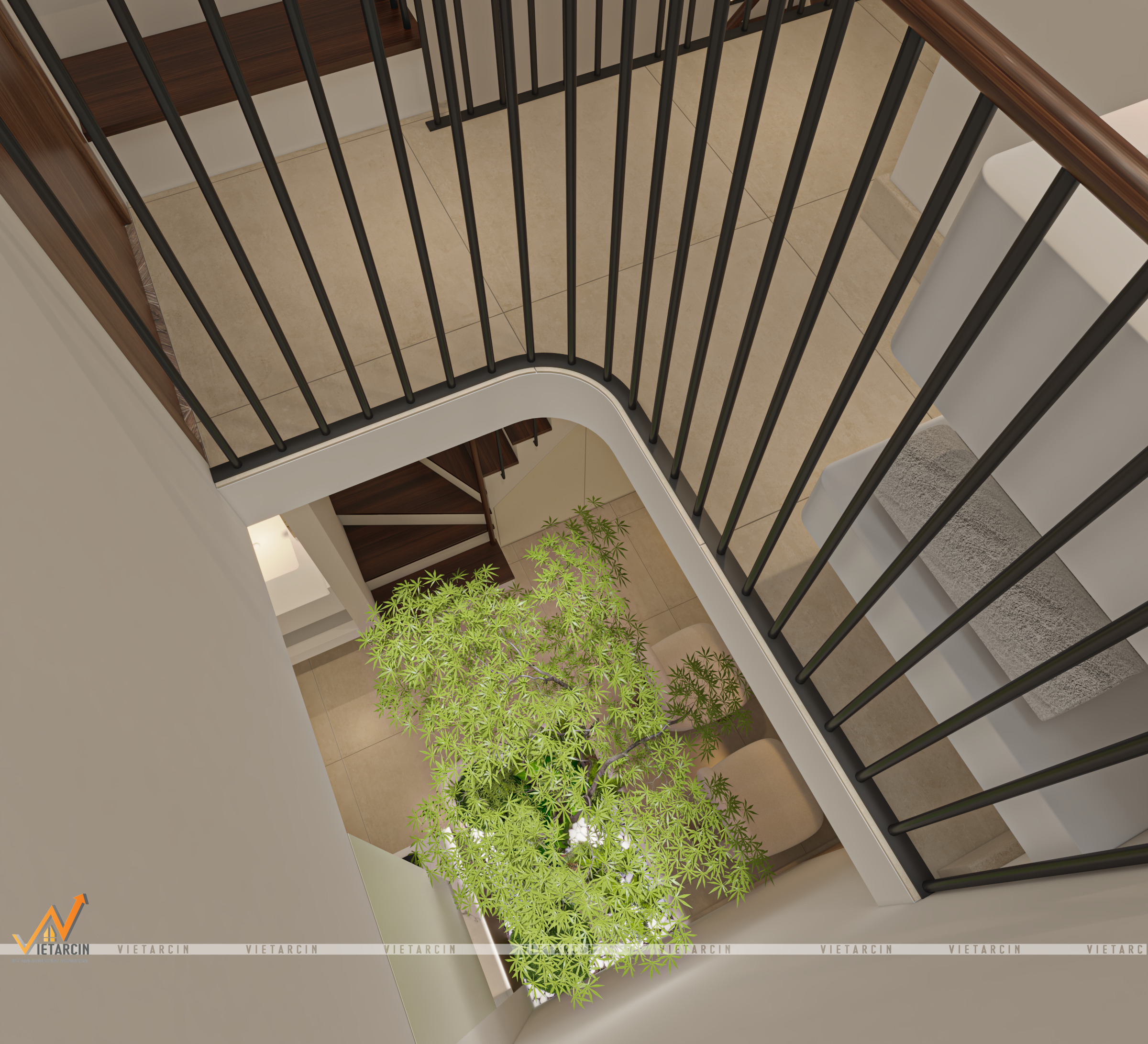- Giếng trời – “Lá phổi” của ngôi nhà: Khi đứng từ hành lang Lầu 1 nhìn xuống, tầm mắt lập tức được xoa dịu bởi tán cây xanh mướt được trồng ở tầng trệt. Giếng trời không chỉ đóng vai trò lấy sáng tự nhiên rực rỡ cho toàn bộ khu vực cầu thang, mà còn tạo ra luồng đối lưu không khí, giúp ngôi nhà luôn mát mẻ, xua tan hoàn toàn cảm giác ngột ngạt của dạng nhà ống truyền thống.