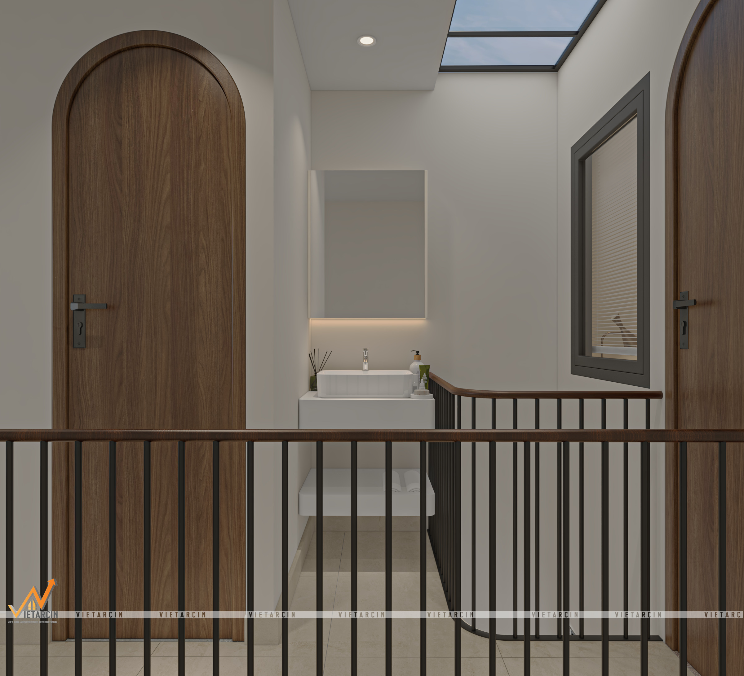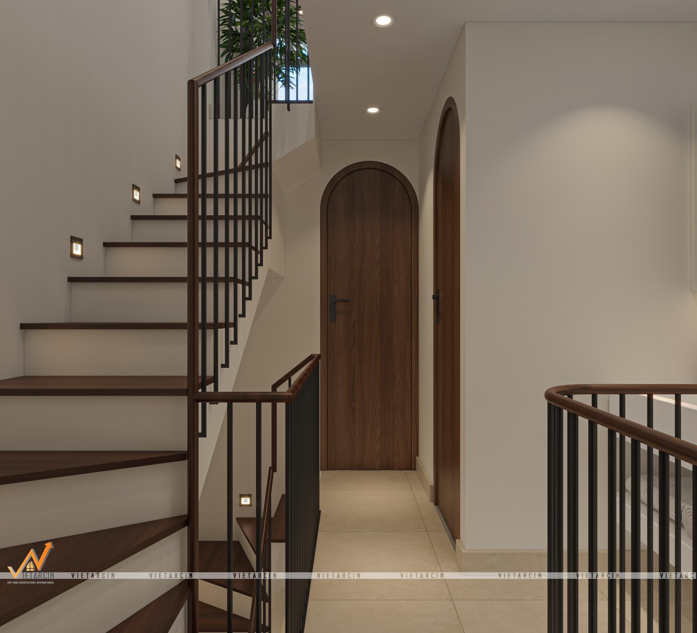 - Hành lang tinh tế với cửa vòm: Dọc theo hành lang, chúng tôi sử dụng hệ cửa phòng bằng gỗ công nghiệp tone màu sồi đậm với thiết kế vòm cong kinh điển. Sự bo tròn này tạo nên nét chuyển tiếp vô cùng mềm mại và sang trọng, phá vỡ định kiến về những mảng tường vuông vức, khô cứng.