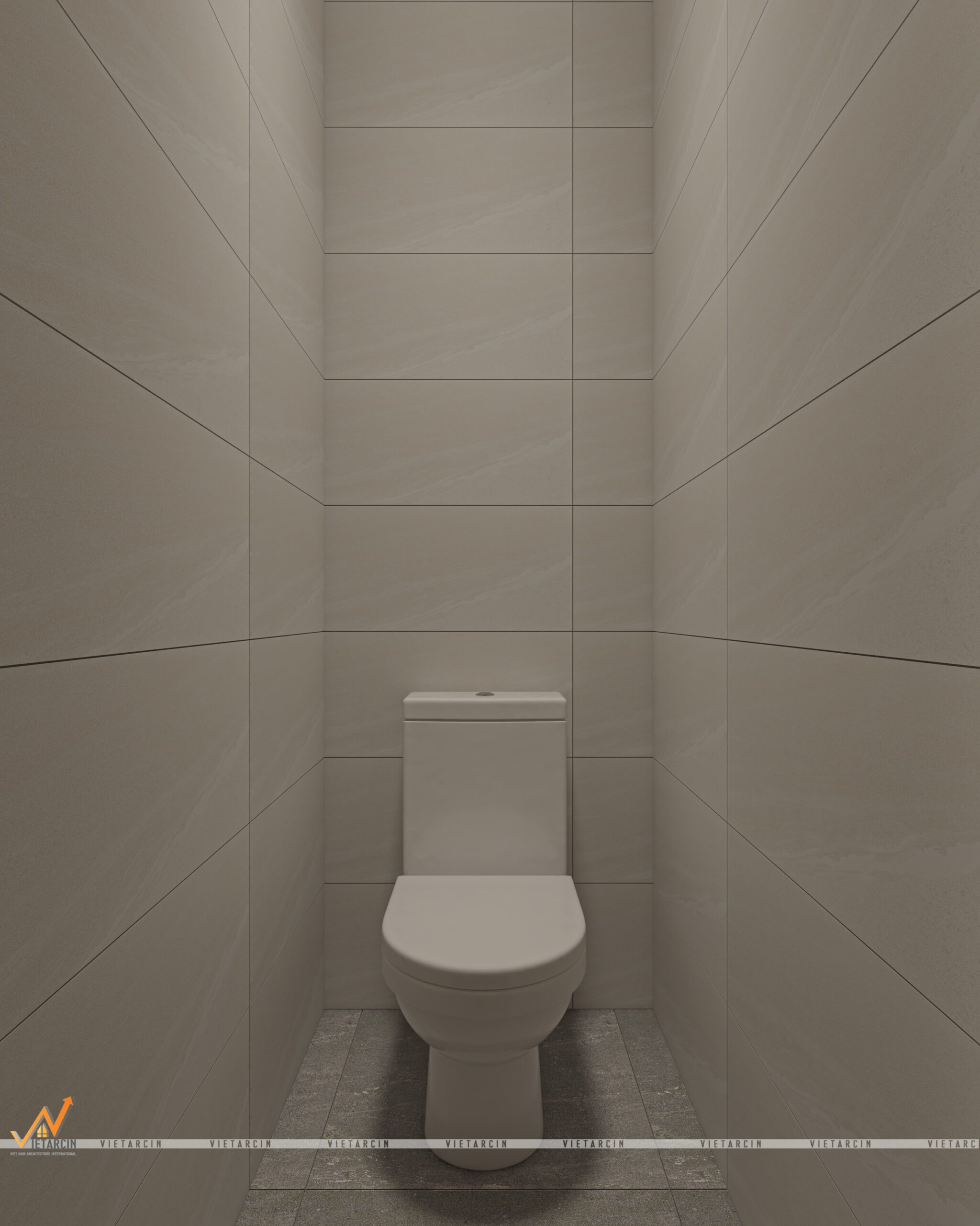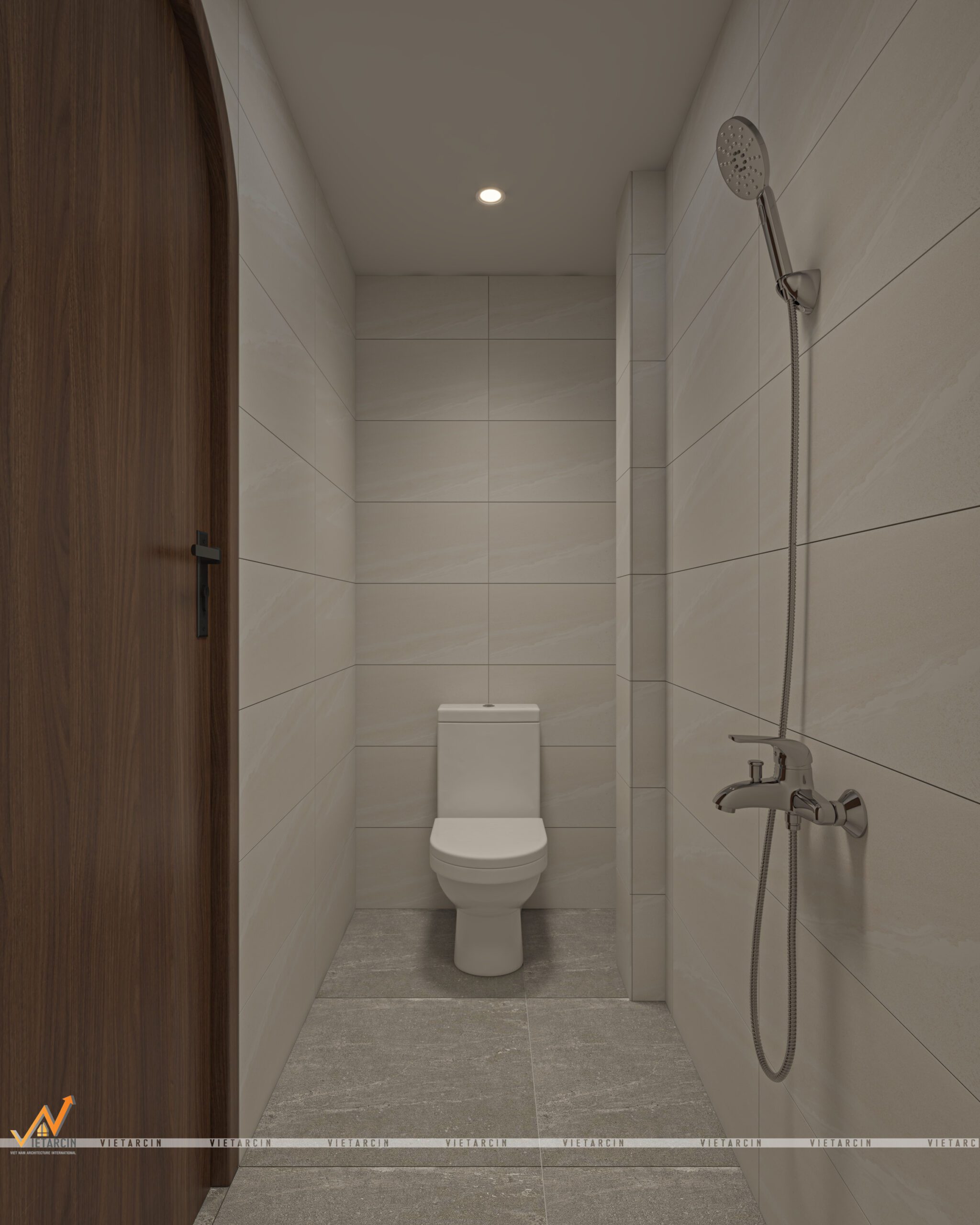 - WC khép kín, tối giản: Không gian tắm và vệ sinh bên trong được ốp gạch men nhám khổ lớn tone xám từ sàn lên kịch trần. Giải pháp này giúp ăn gian cảm giác về diện tích, cực kỳ sạch sẽ và dễ dàng vệ sinh.