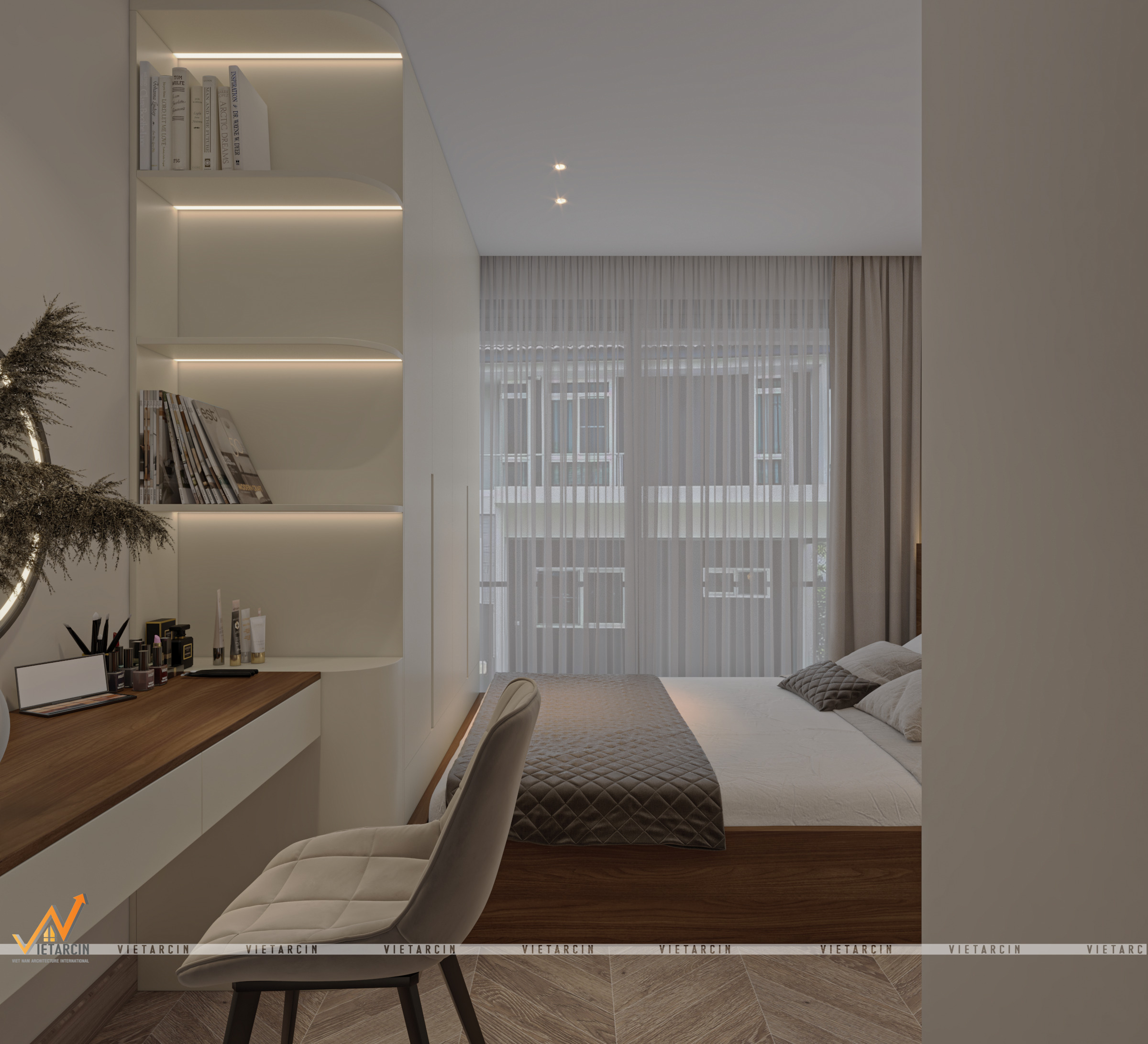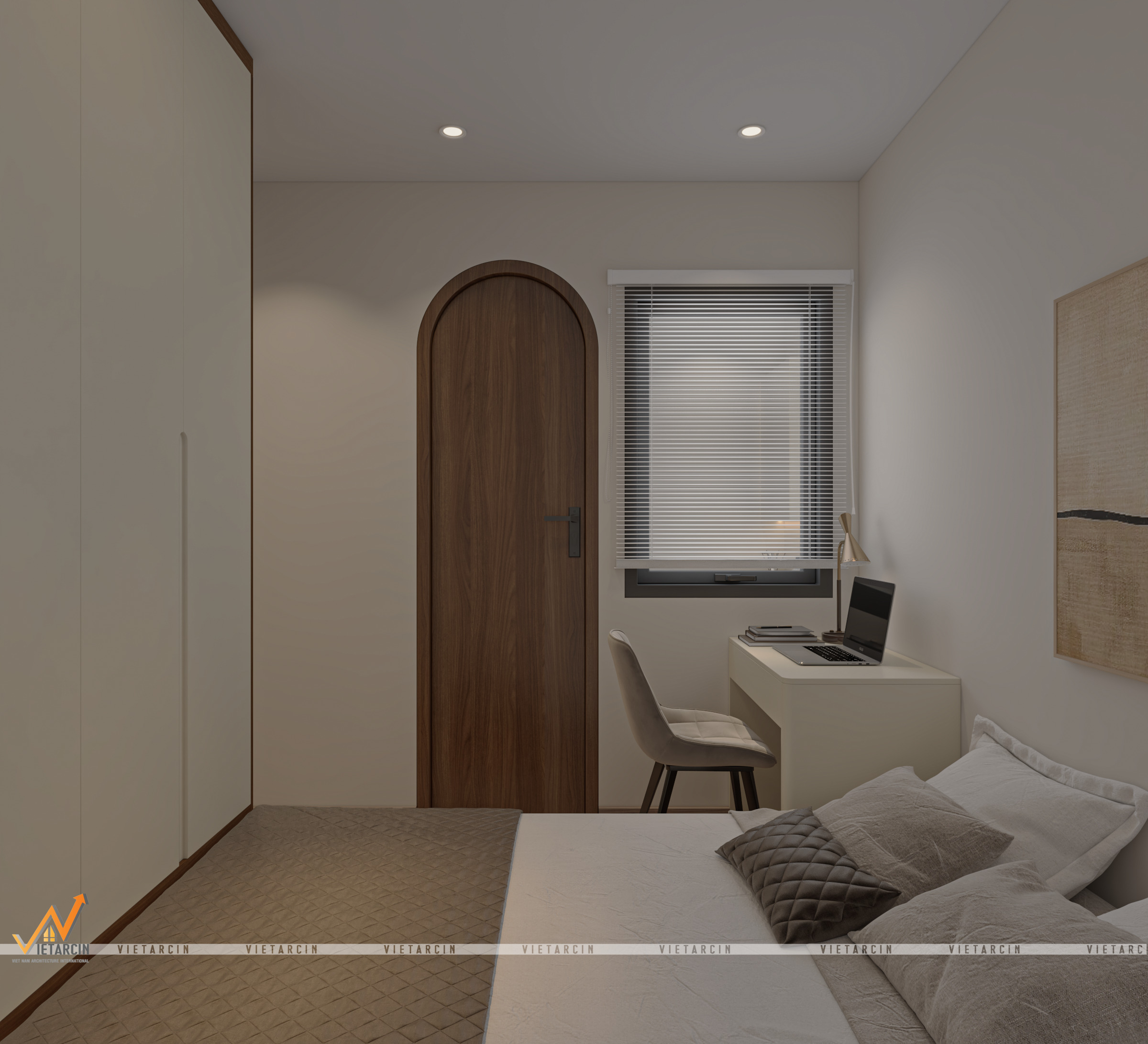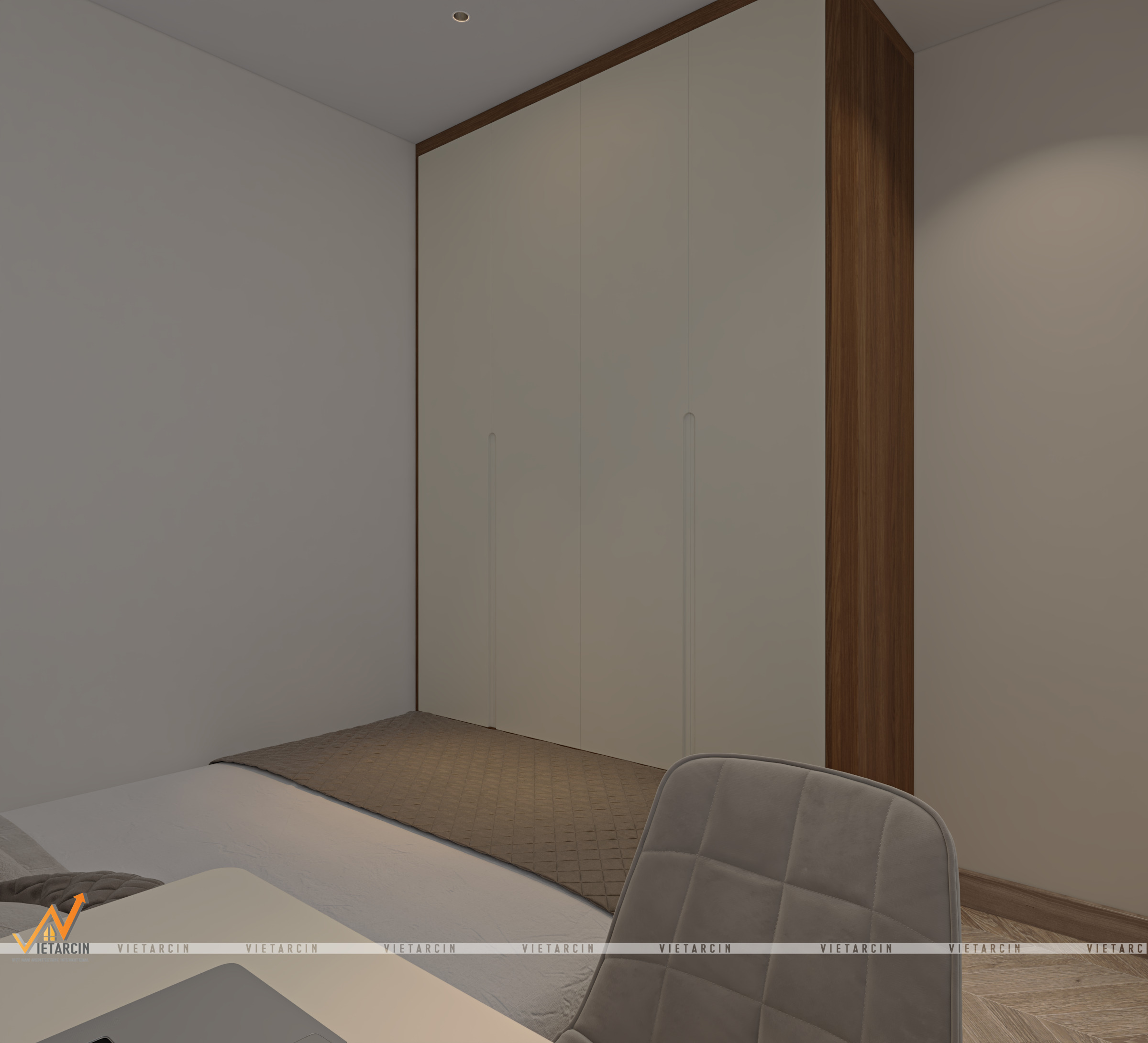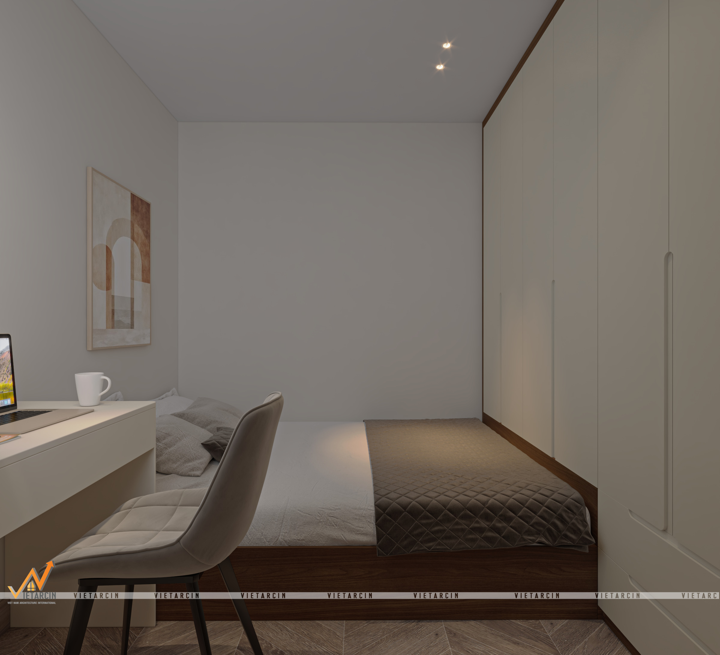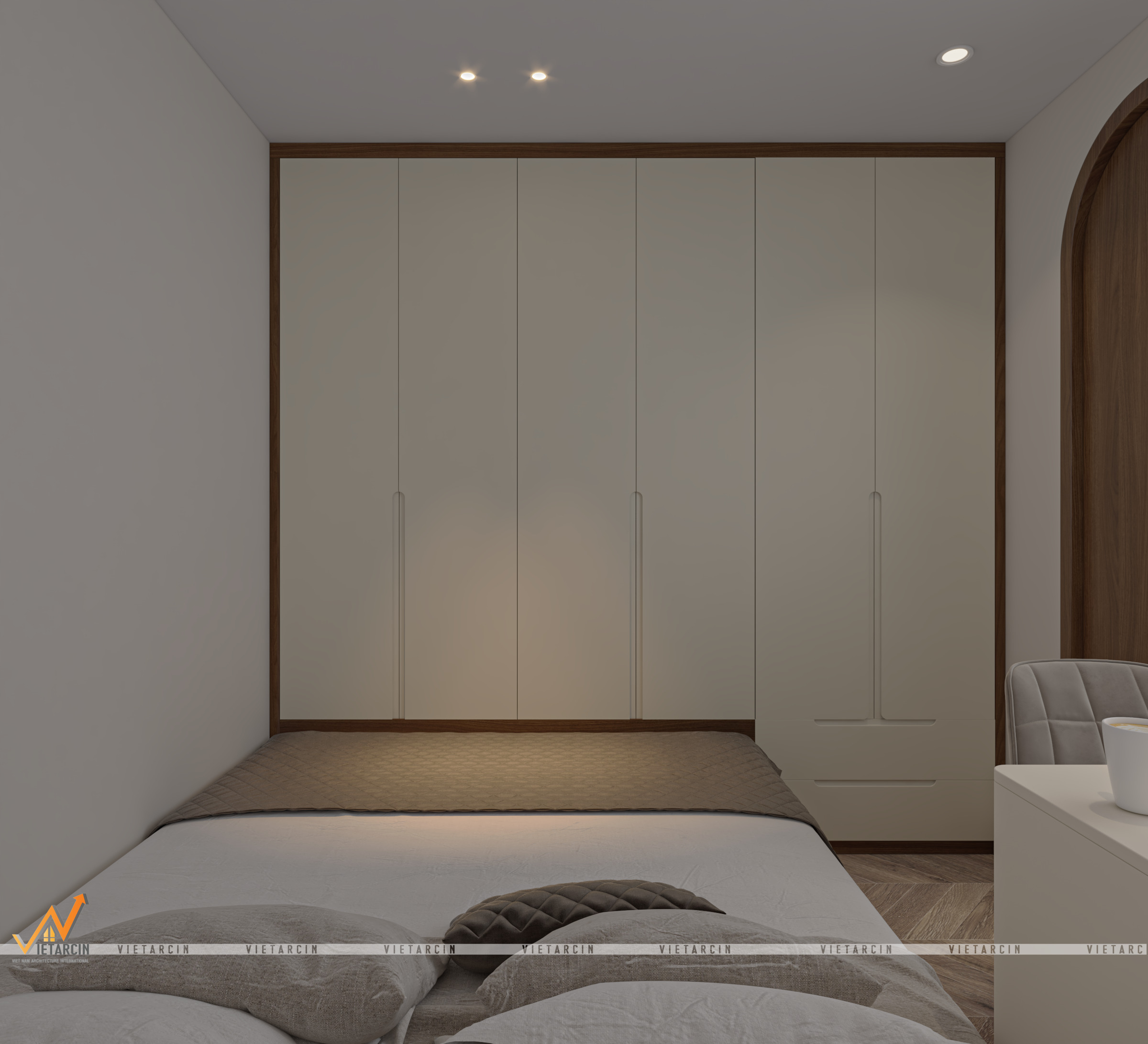 - Tối ưu diện tích với nội thất “Đo ni đóng giày”: Vì diện tích phòng không quá lớn, chúng tôi sử dụng hệ tủ quần áo cánh phẳng kịch trần với tone màu kem (cream) nhẹ nhàng. Thiết kế không tay nắm giúp hệ tủ trông như một mảng tường phẳng, triệt tiêu hoàn toàn cảm giác chật chội.