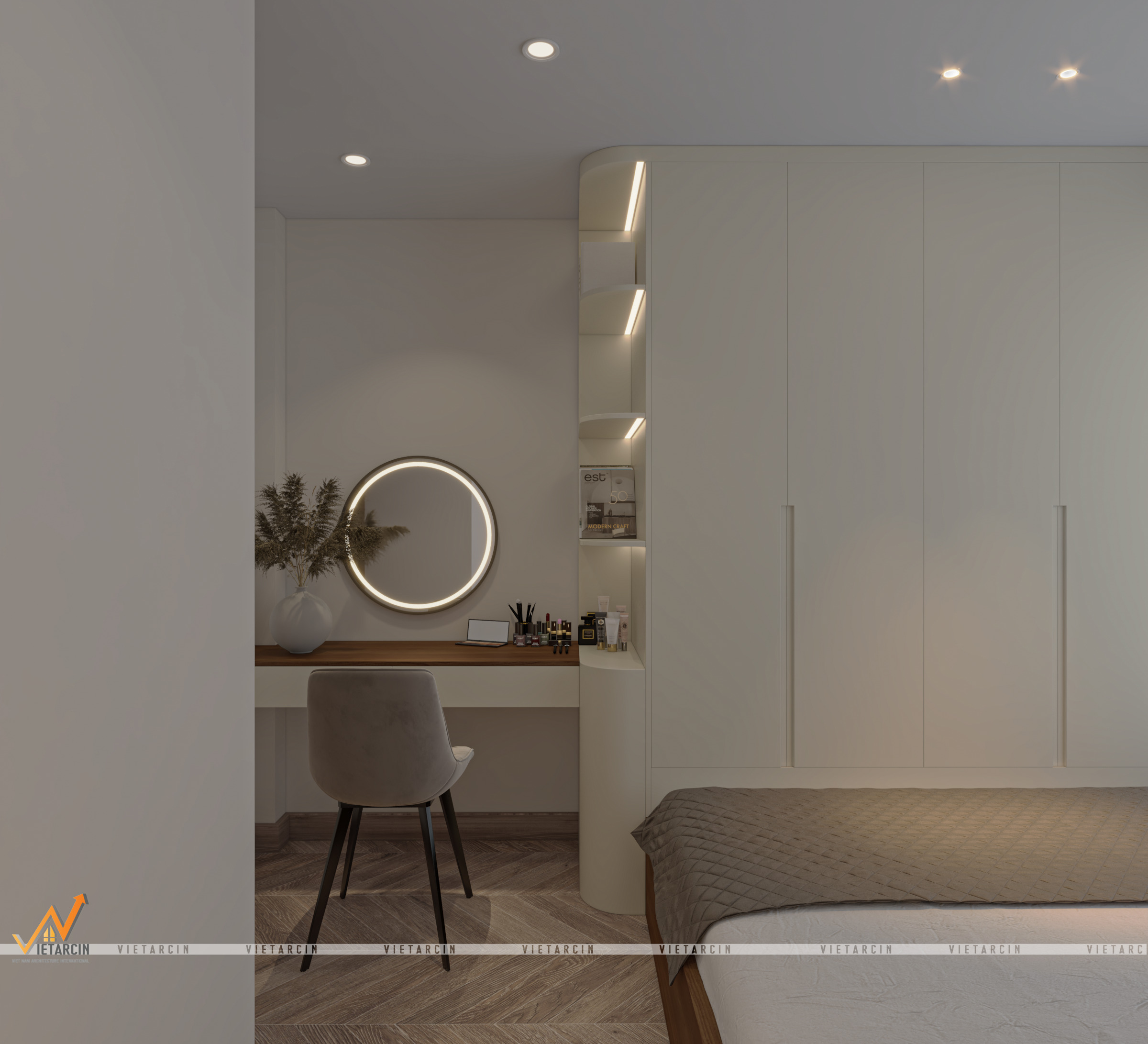 - Tích hợp công năng thông minh: Các hệ kệ mở có gắn đèn LED được khéo léo bo góc, nối liền với tủ quần áo. Đặc biệt, bàn làm việc và bàn trang điểm được thiết kế “nối tiếp” từ hệ tủ kéo ra, tận dụng tối đa từng centimet vuông diện tích mà không làm vướng lối đi.